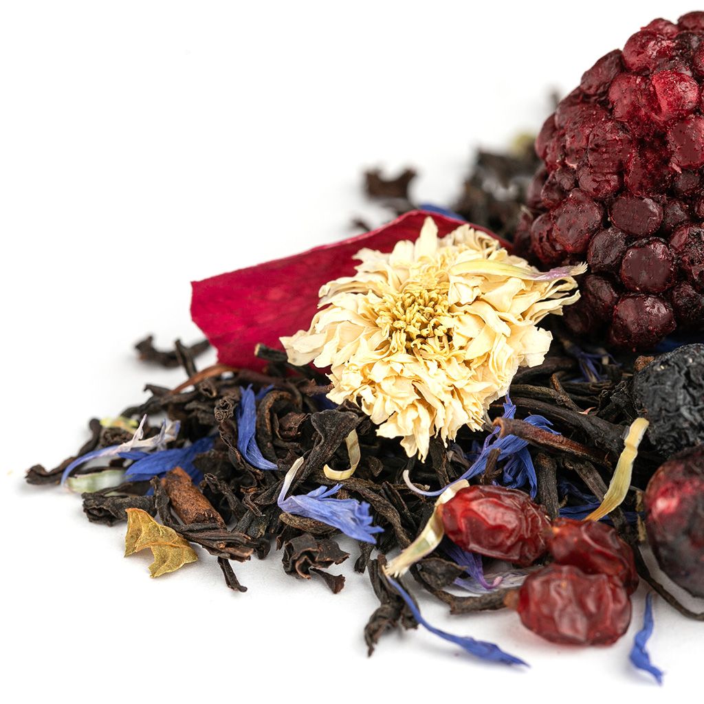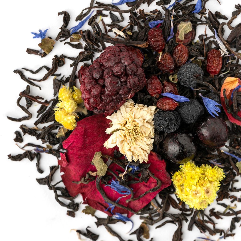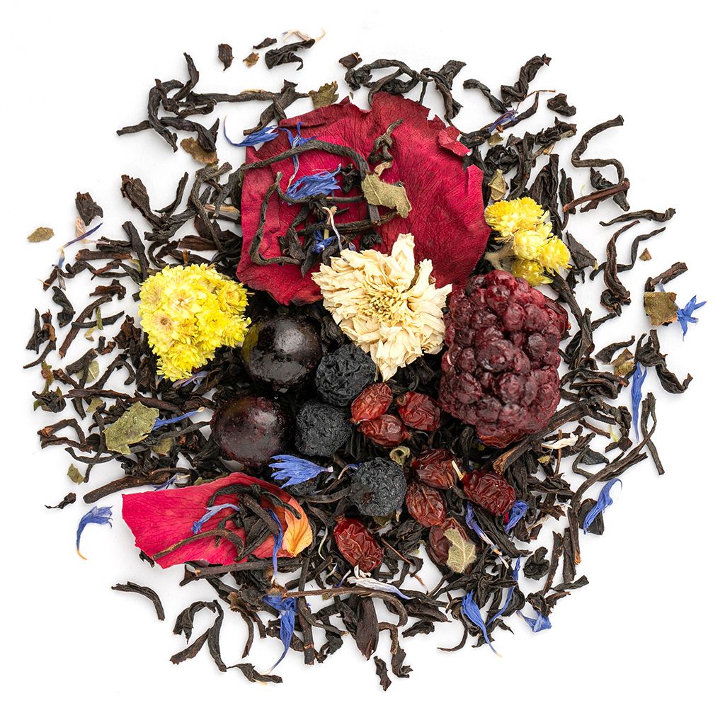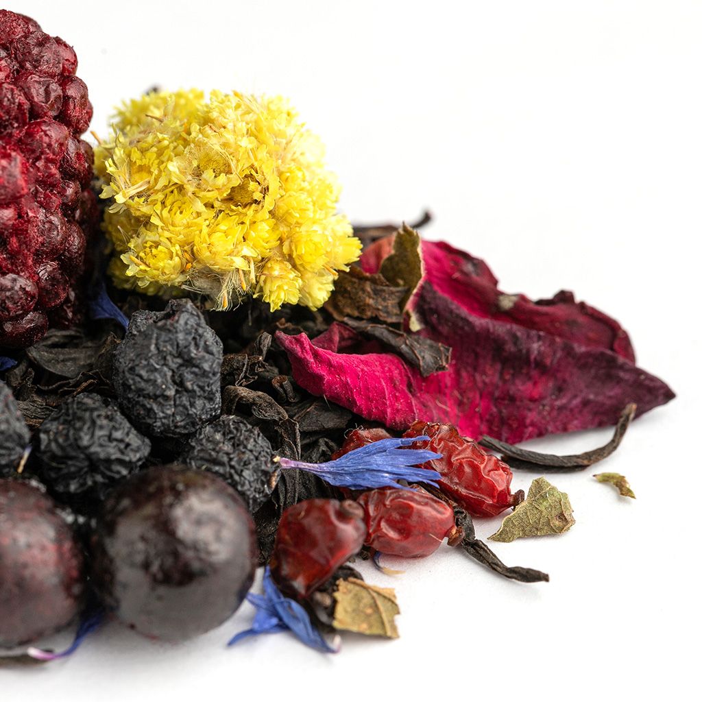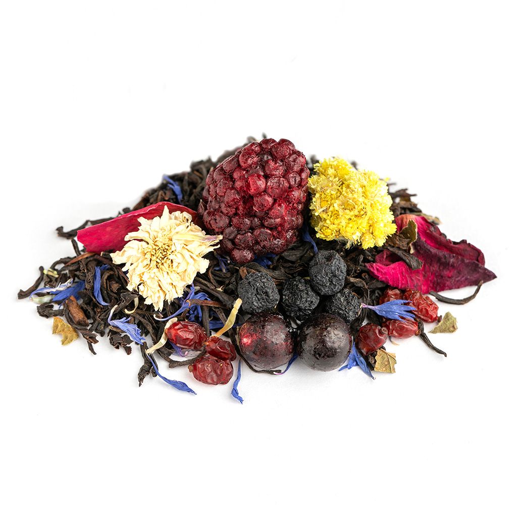 Чай черный индийский, плоды боярышника, плоды барбариса, цветы бессмертника, цветы мальвы, ягоды ежевики, ягоды черной смородины, лепестки розы, листья ежевики, цветы хризантемы, аромат садовых ягод.