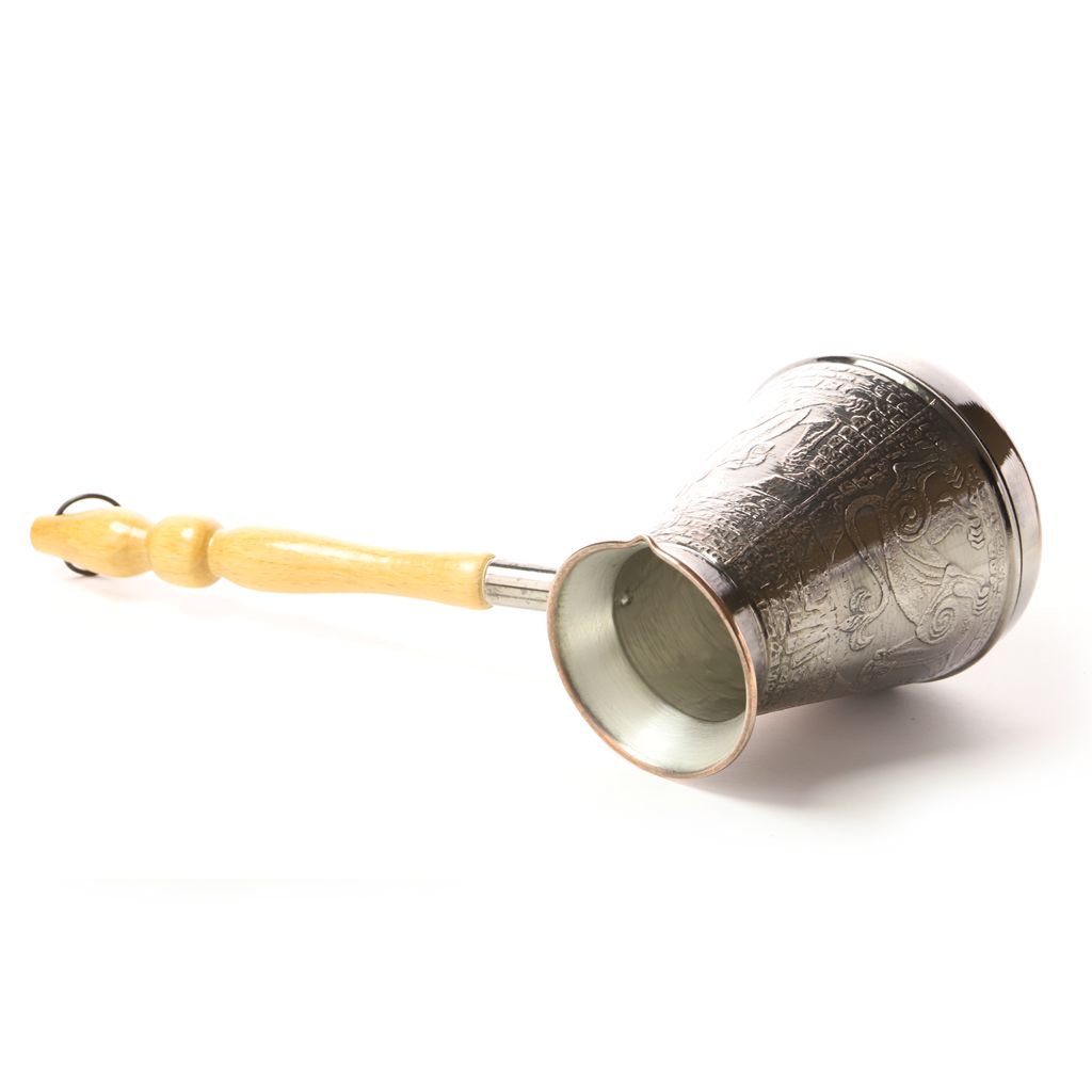 Медная турка конической формы, с длинной деревянной светлой ручкой, объемом 600 мл.