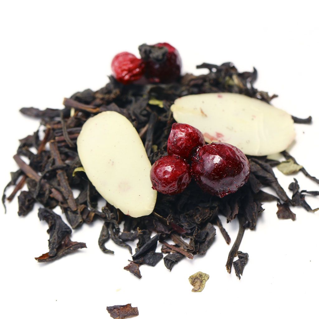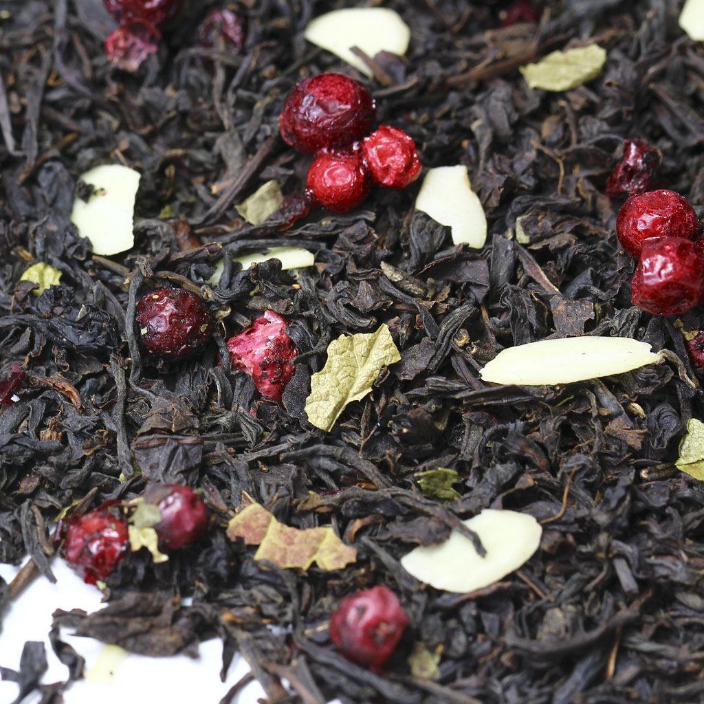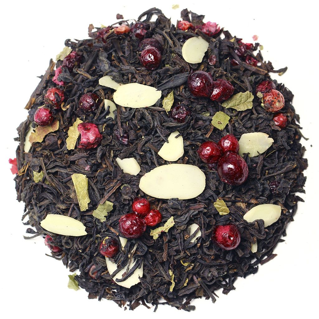 Чай черный индийский, слайсы миндаля, ягоды брусники, листья смородины, аромат горного миндаля.
