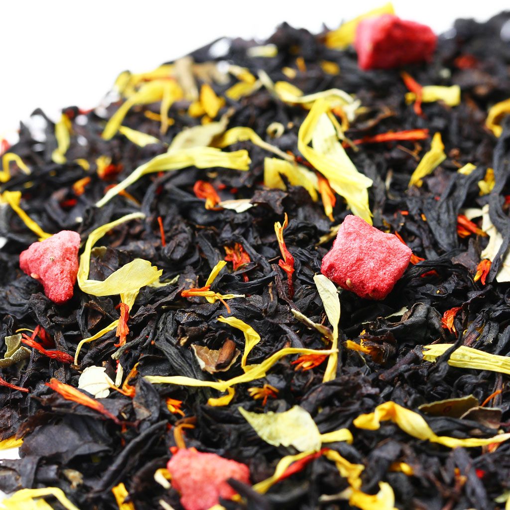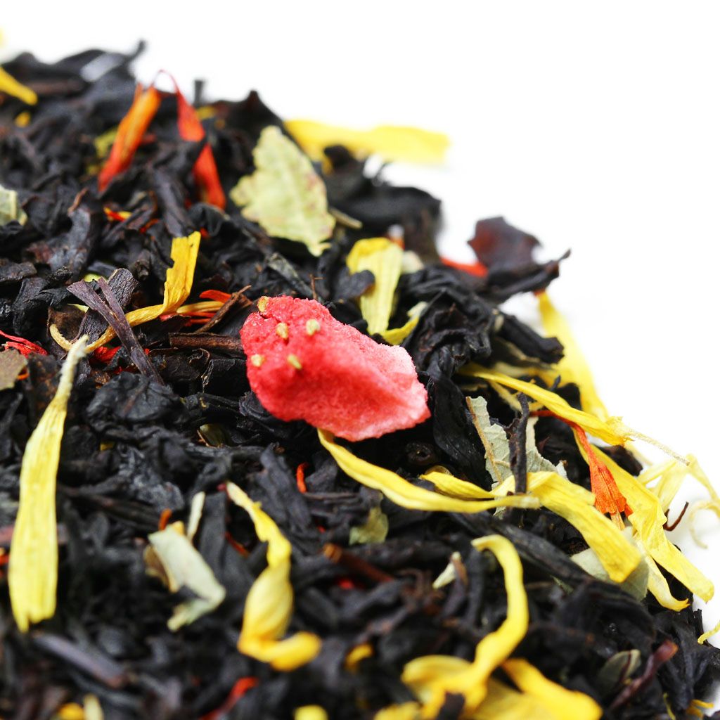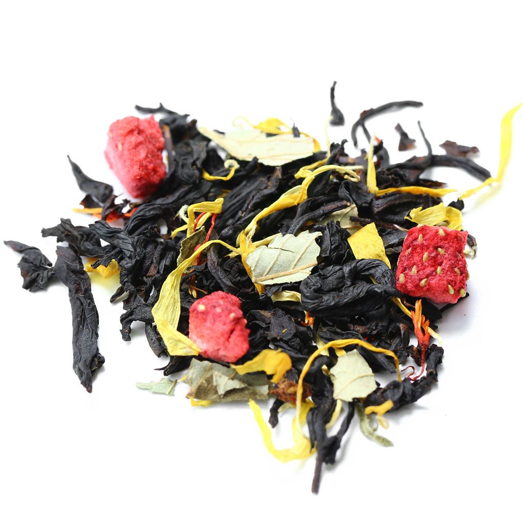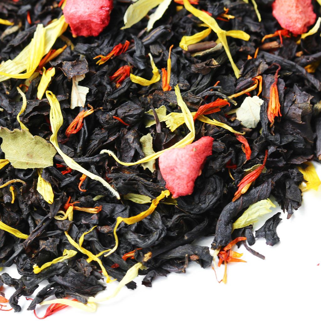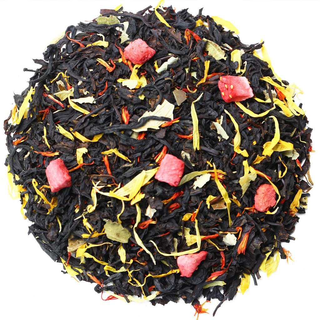 Чай черный цейлонский, кусочки клубники, лепестки календулы, лепестки сафлора, листья смородины, аромат садовой земляники
