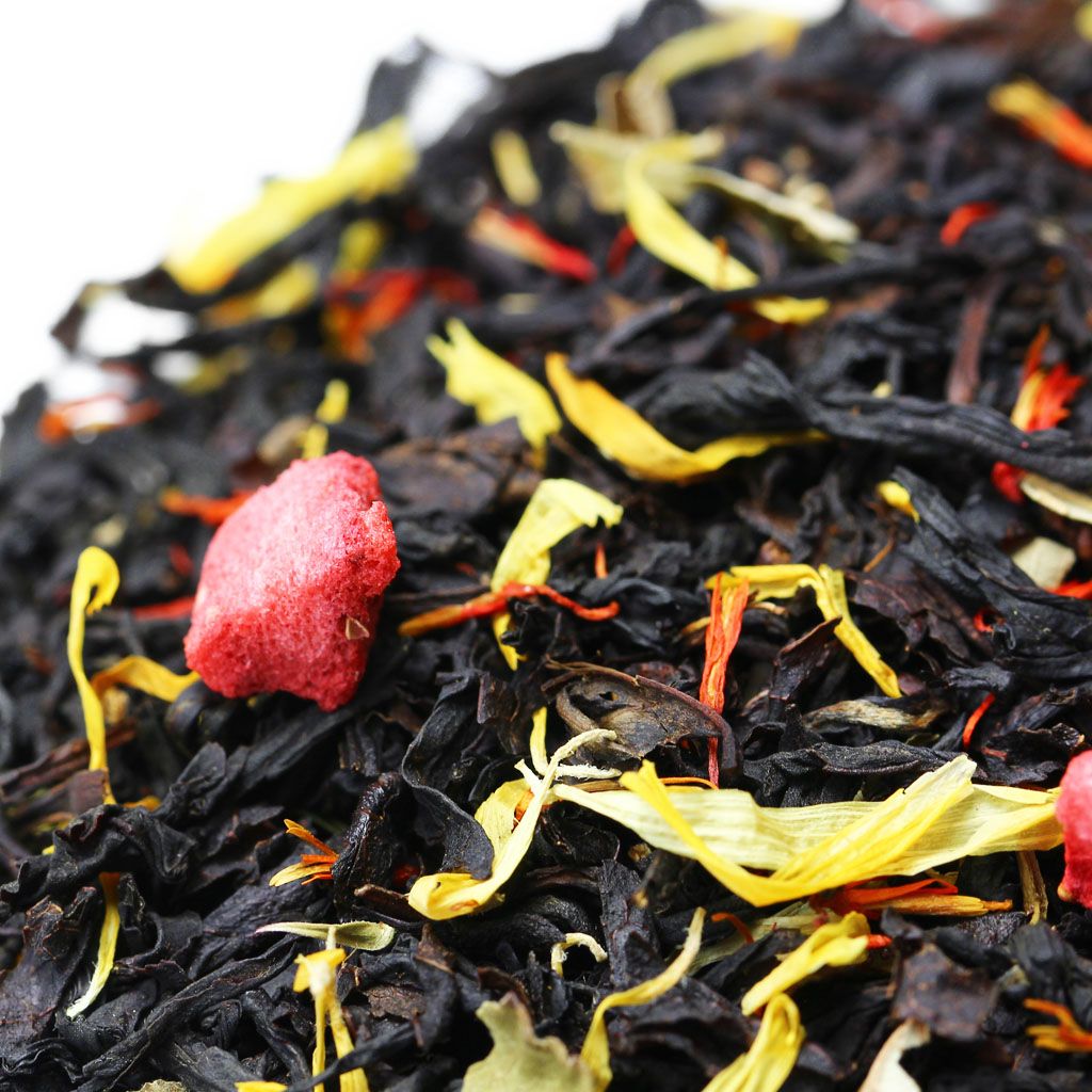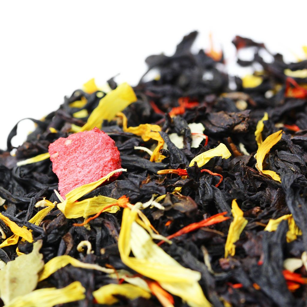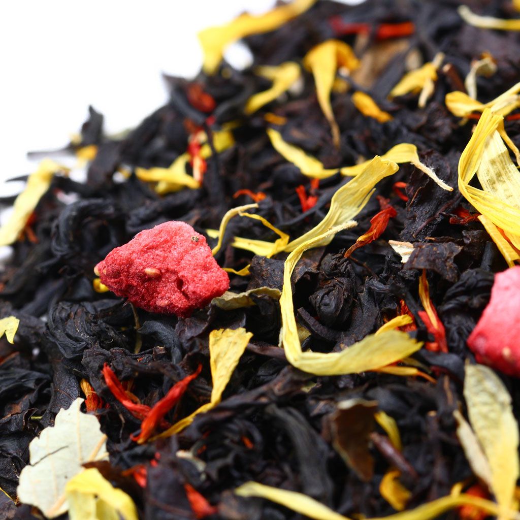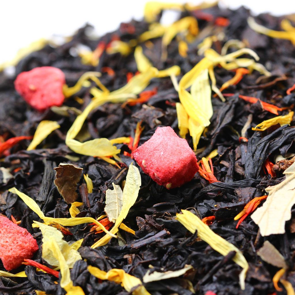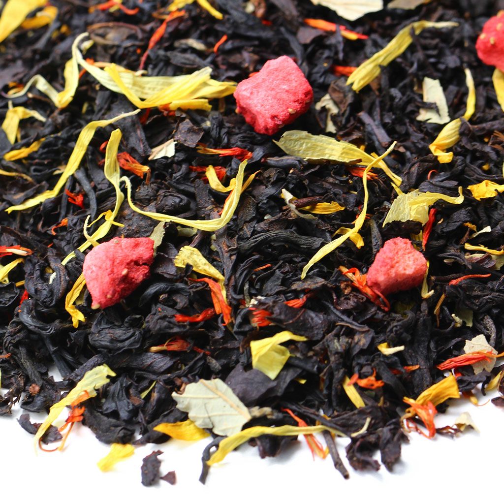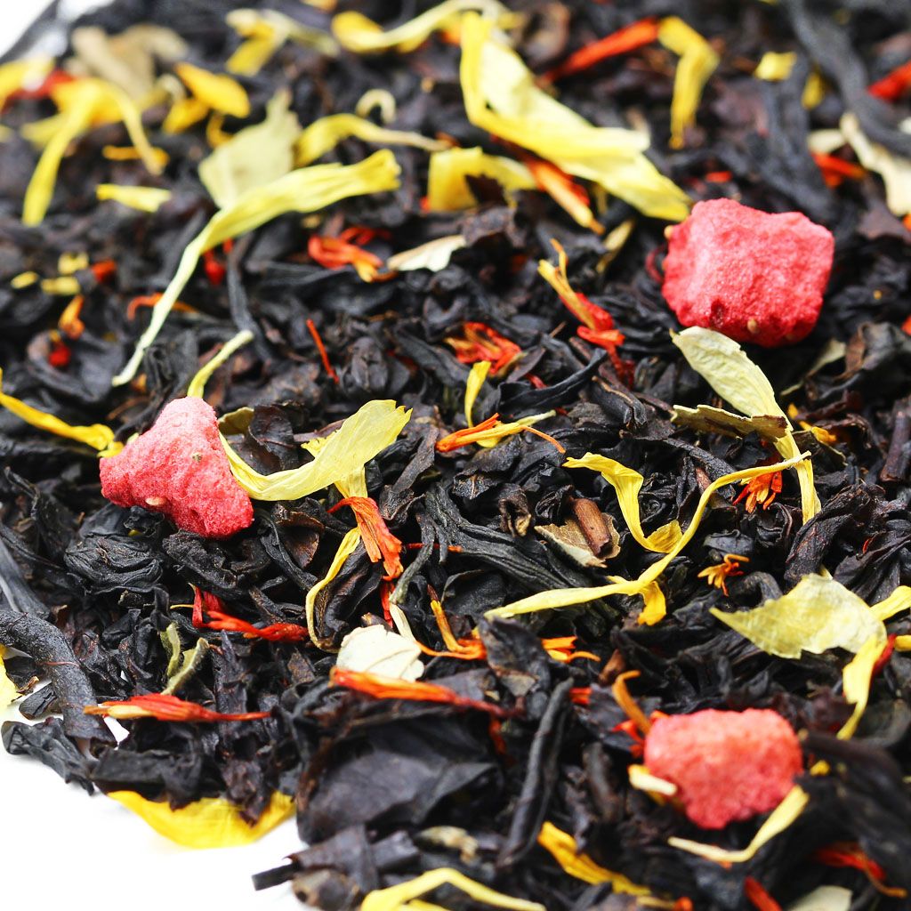Чай черный цейлонский, кусочки клубники, лепестки календулы, лепестки сафлора, листья смородины, аромат садовой земляники