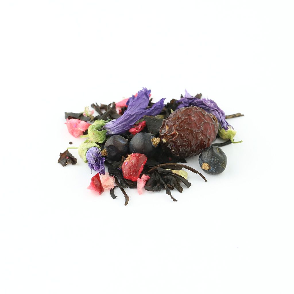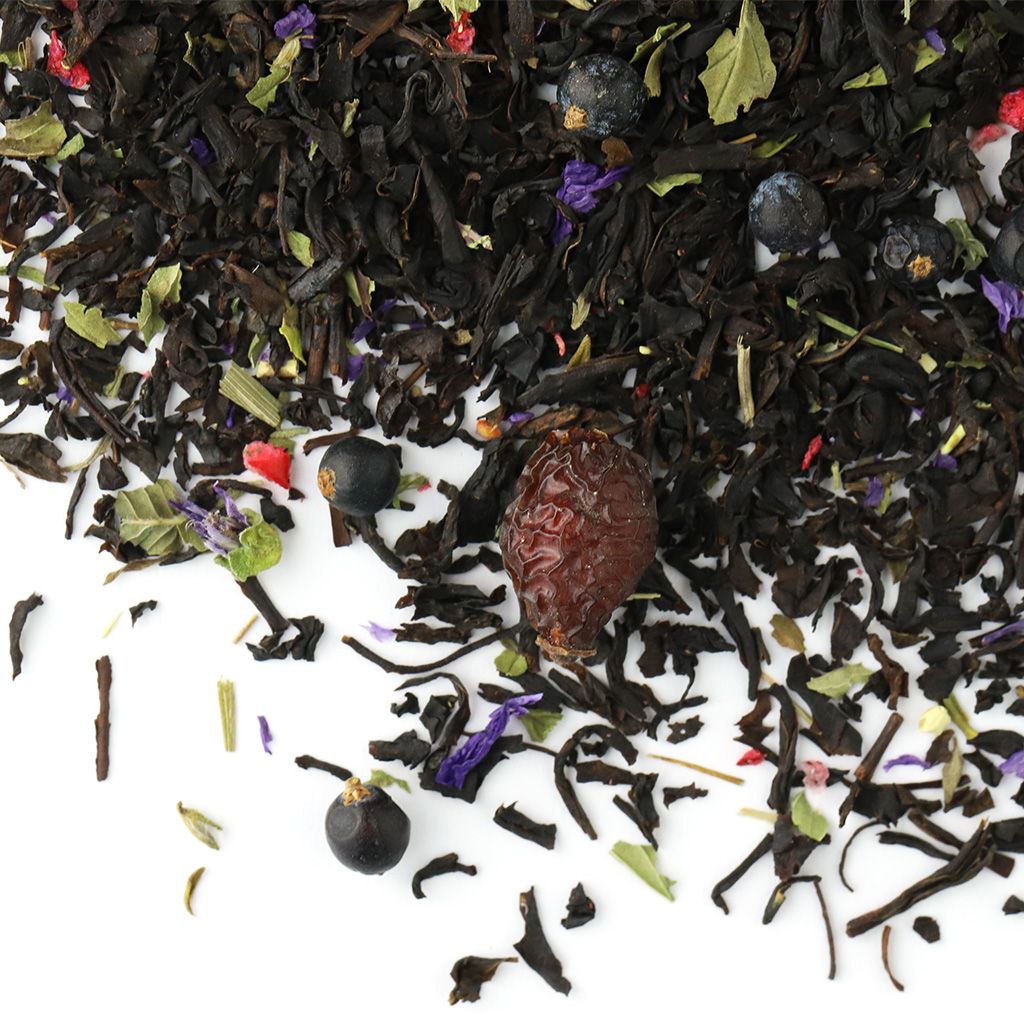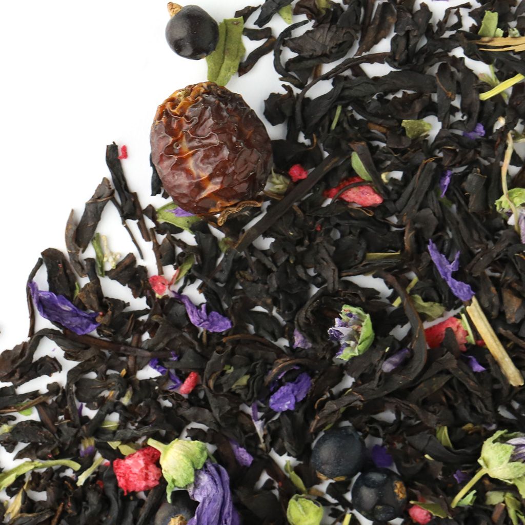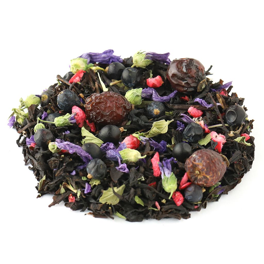 Чай черный, плоды можжевельника, плоды шиповника, чабрец, мята, цветы мальвы, кусочки клюквы, аромат бергамота и смородины.
