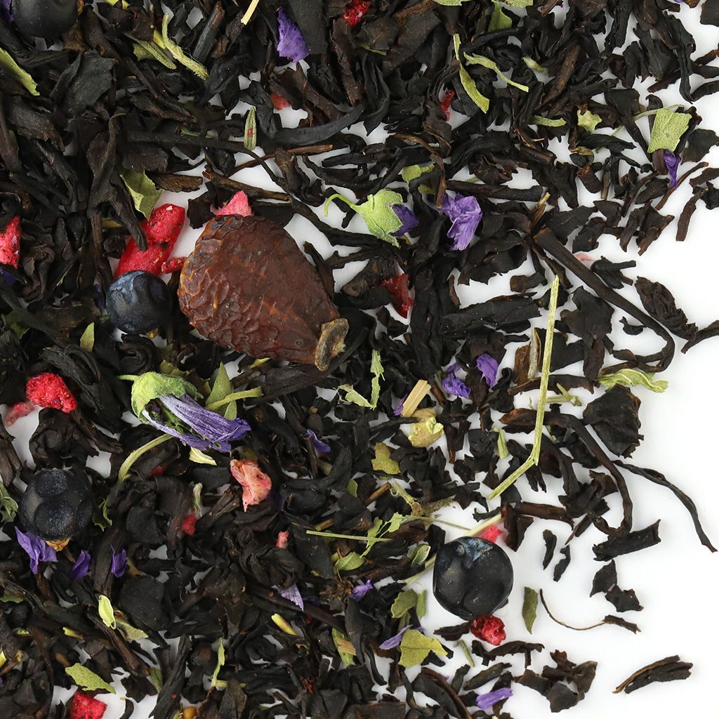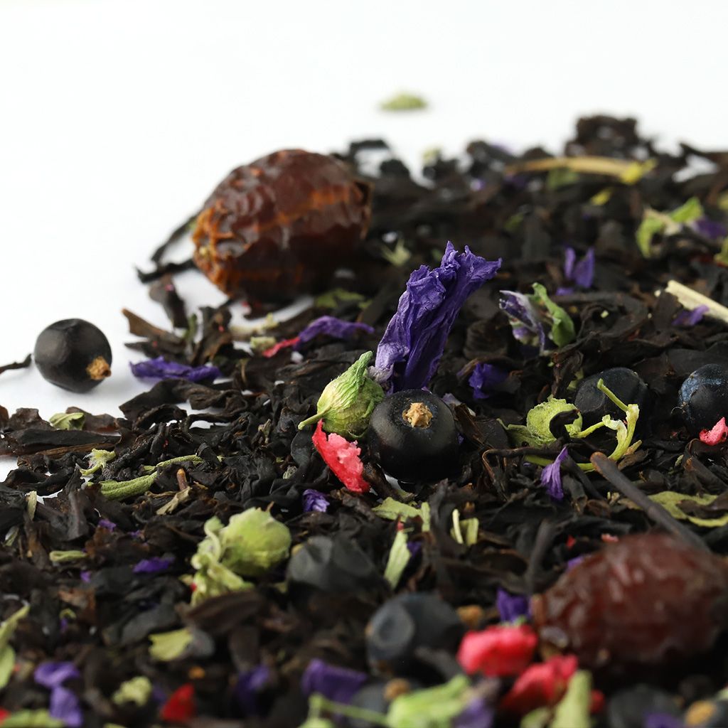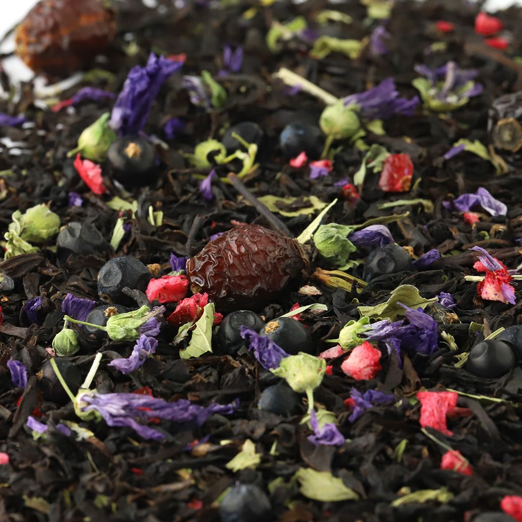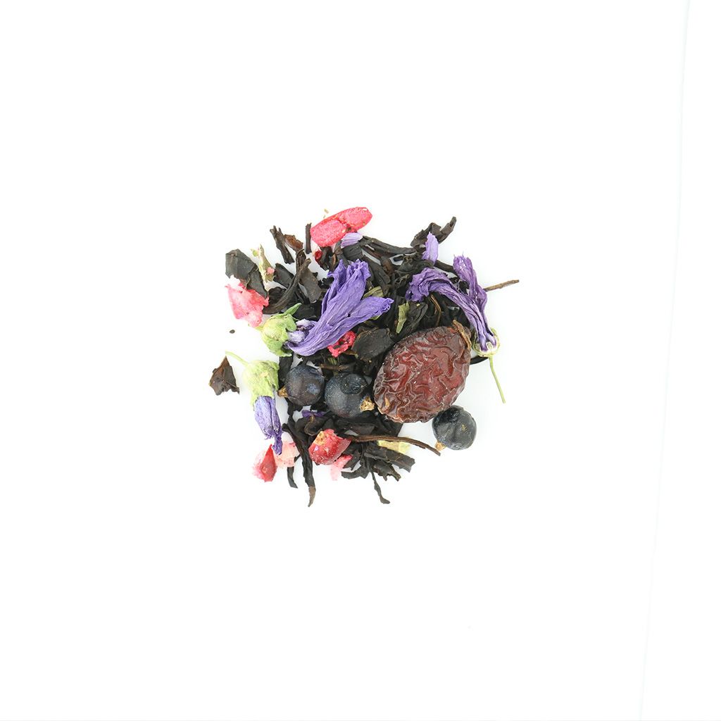 Чай черный, плоды можжевельника, плоды шиповника, чабрец, мята, цветы мальвы, кусочки клюквы, аромат бергамота и смородины.