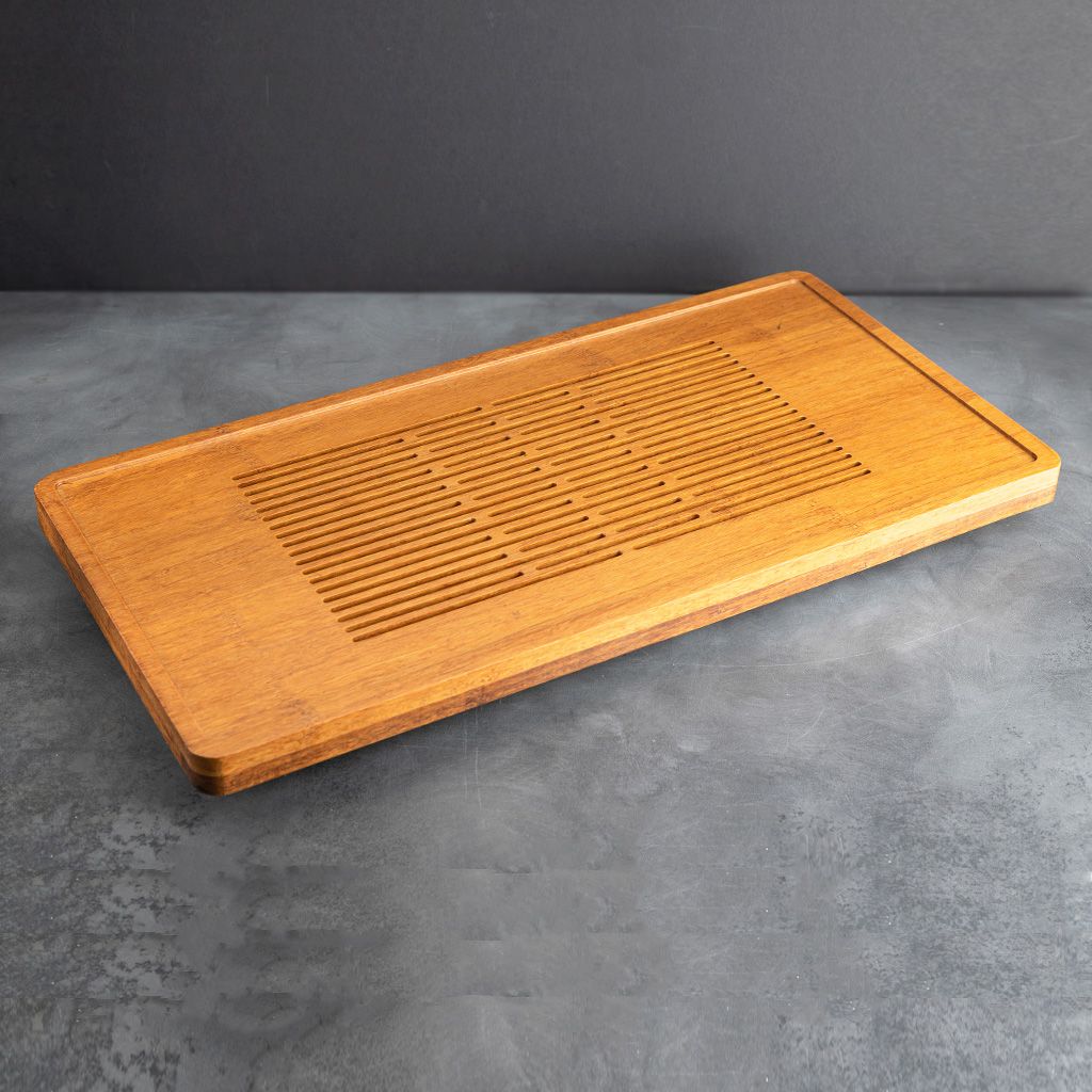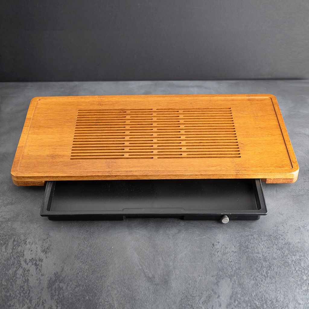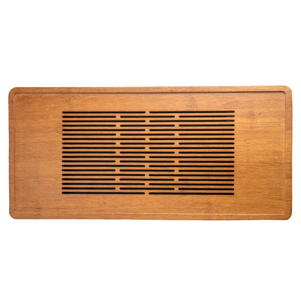 Большая бамбуковая доска (чабань) с состоит из крышки с узкими прорезями и пластикового прямоугольного поддона. На обратной стороне предусмотрены нескользящие резиновые ножки.