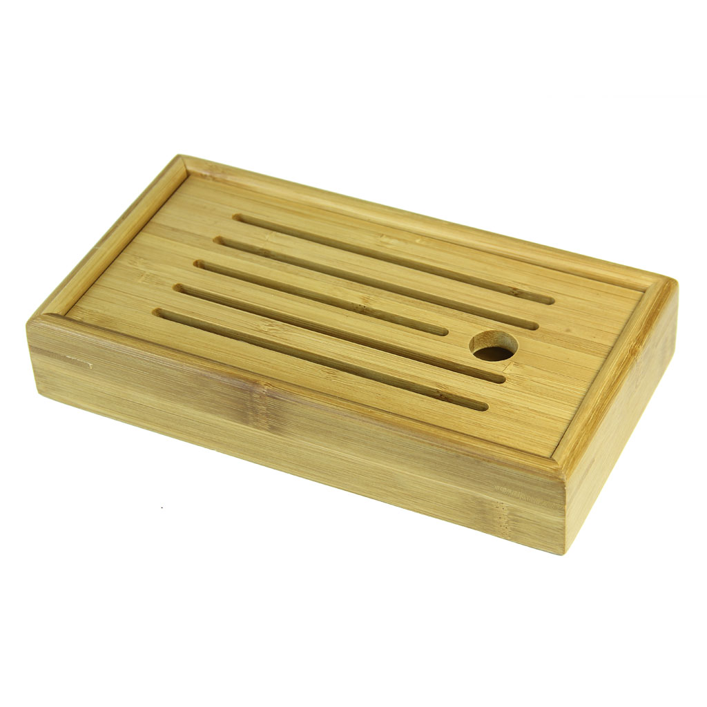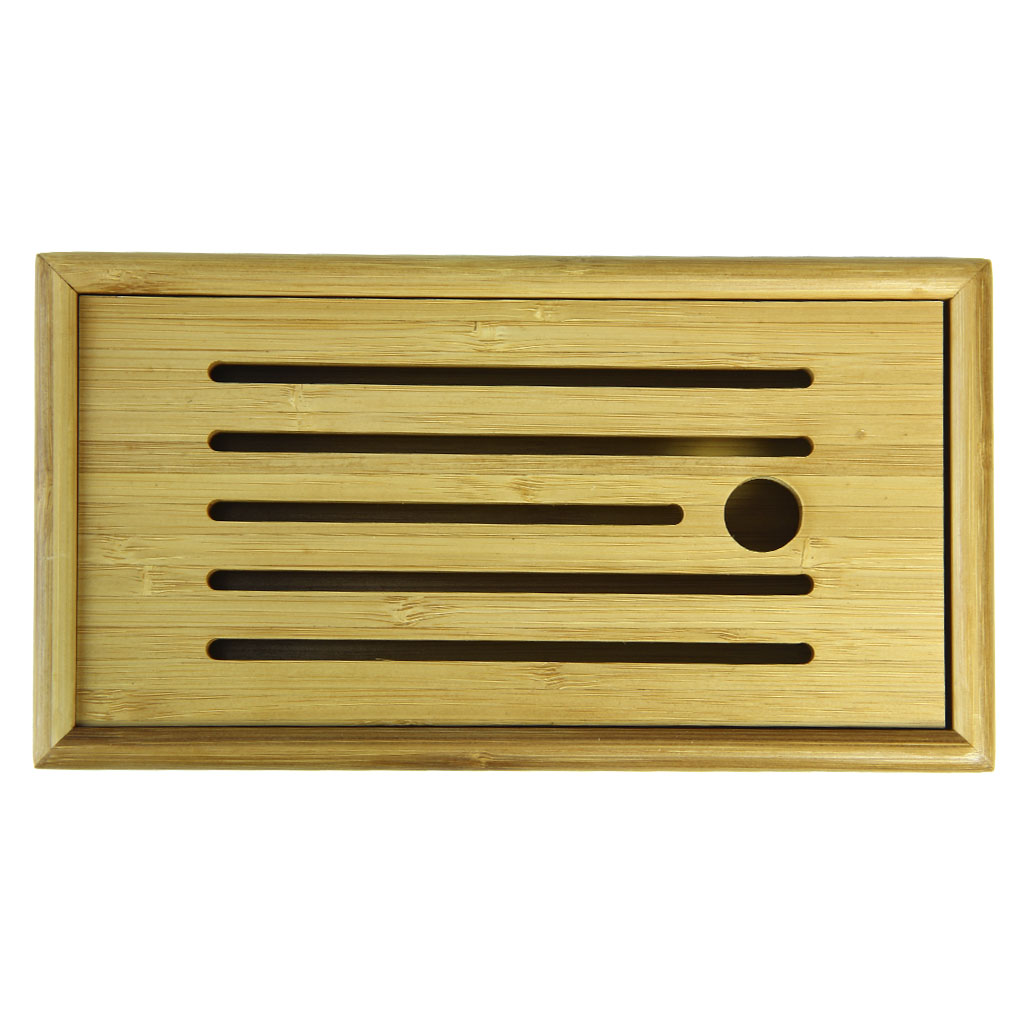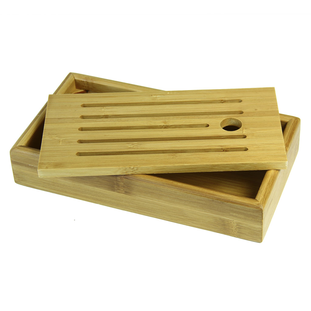 Чайная доска бамбуковая состоит из прямоугольного поддона и крышки с узкими прорезями и прорезной ручкой