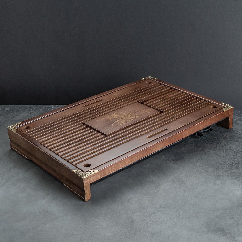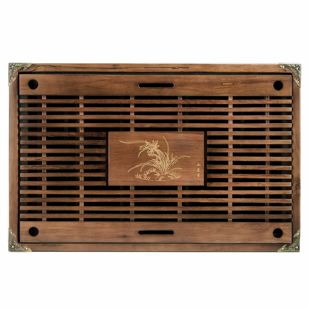 Чайная доска из древесины цвета махаон с резными металлическими уголками, состоит из прямоугольного поддона и решетчатой крышки с прорезными ручками и изображением орхидеи. В комплект входит груша и шланг.