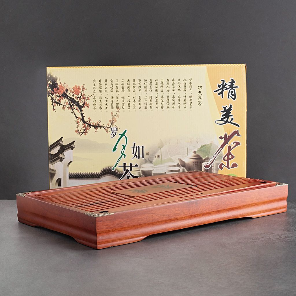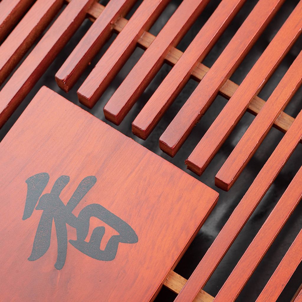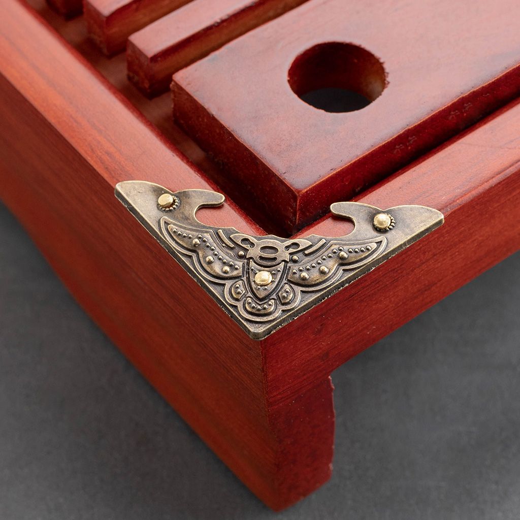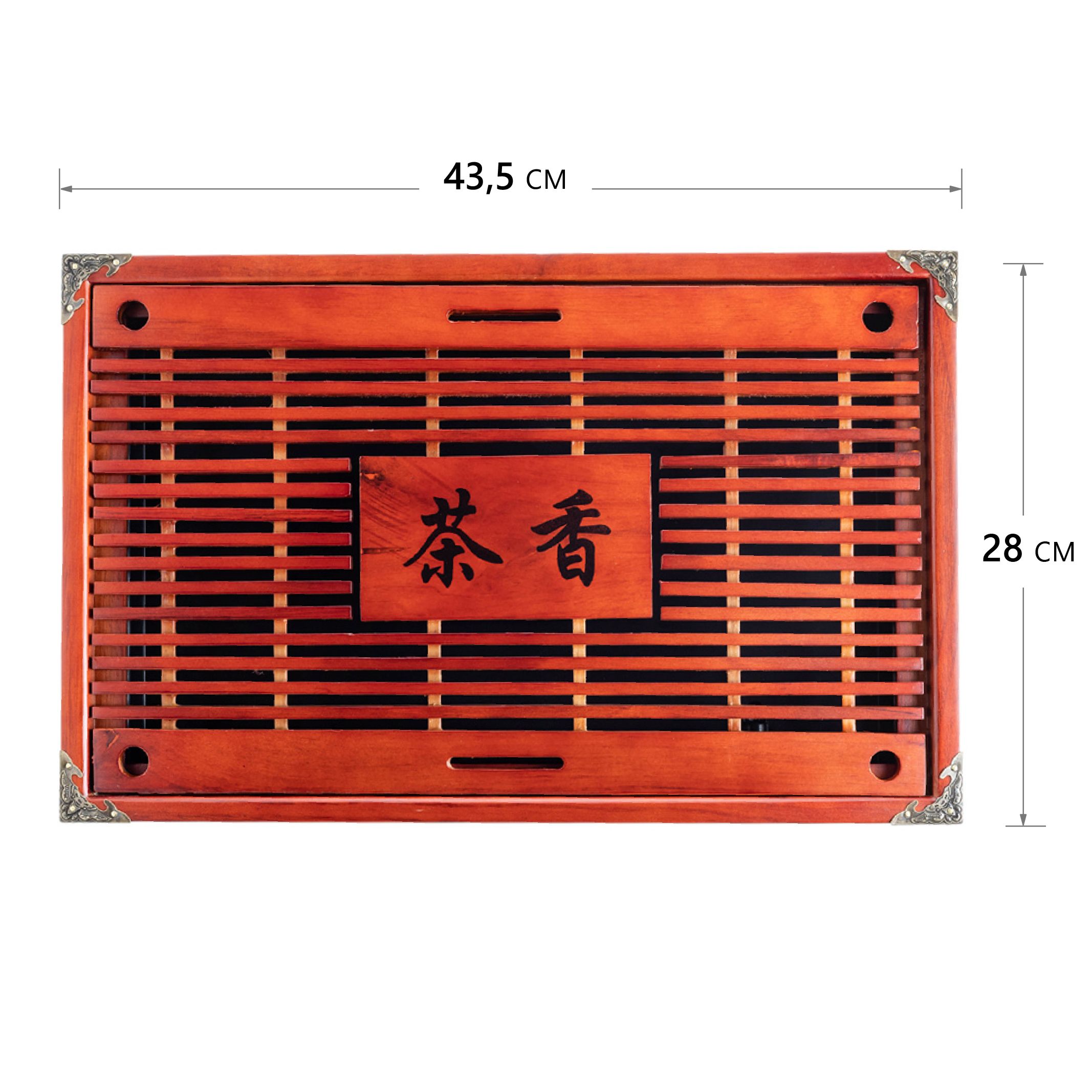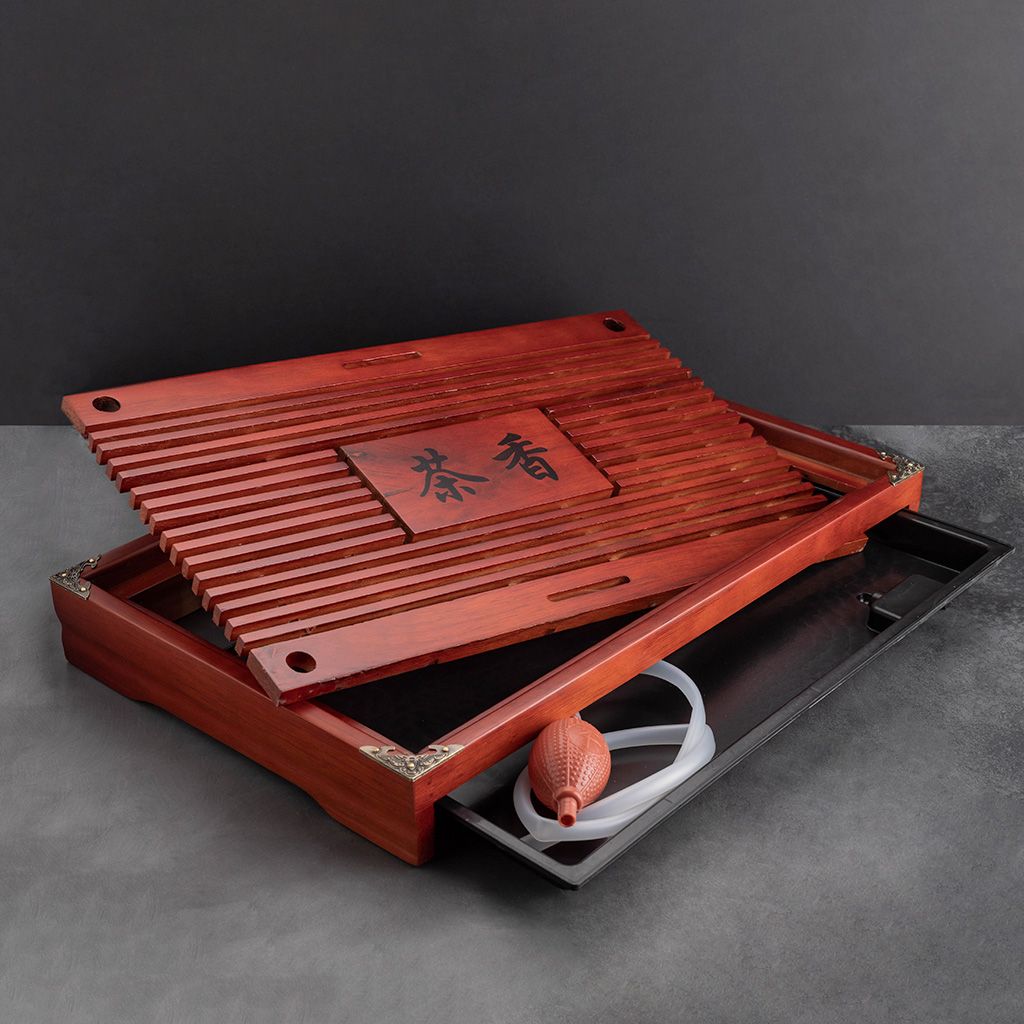 Чайная доска из древесины цвета Вишня с резными металлическими уголками, состоит из прямоугольного поддона и решетчатой крышки с прорезными ручками и изображением орхидеи. В комплект входит груша и шланг.