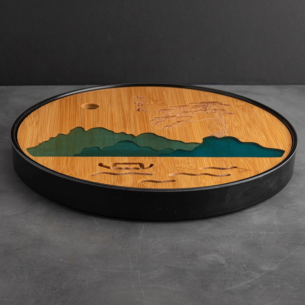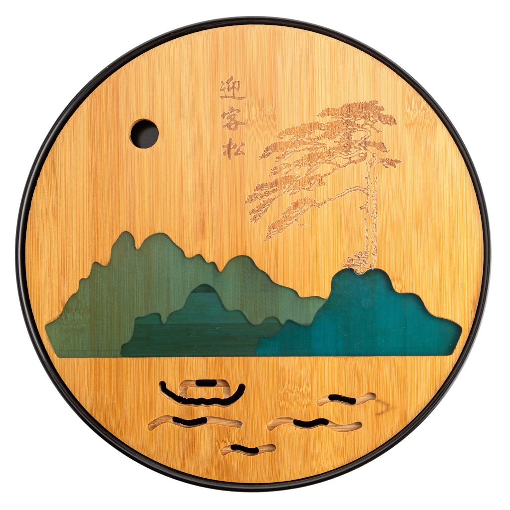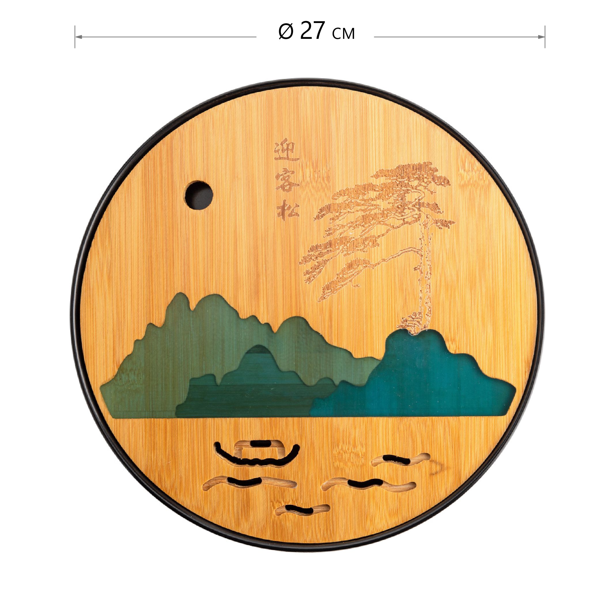 Чабань круглая c черным пластиковым поддоном и бамбуковой крышкой с прорезями и вставкой из эпоксидной смолы зеленого цвета. Диаметр: 27 см. Высота: 3 см.