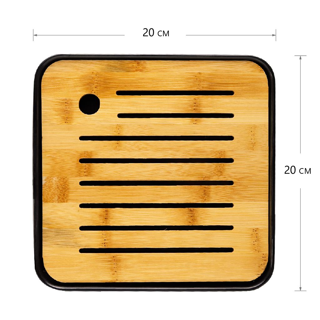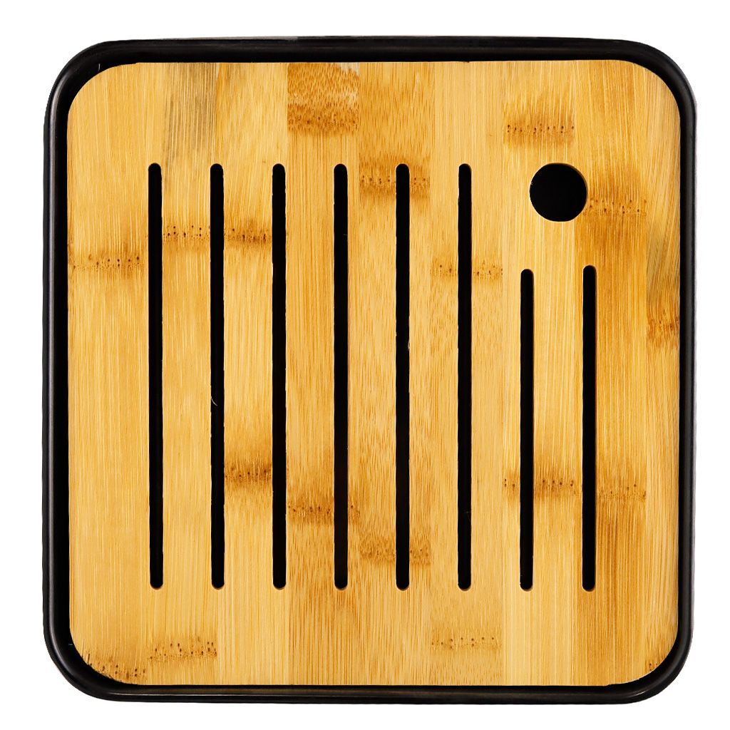 Небольшая чайная доска, состоит из пластикового поддона черного цвета и бамбуковой крышки с узкими прорезями и прорезной ручкой
