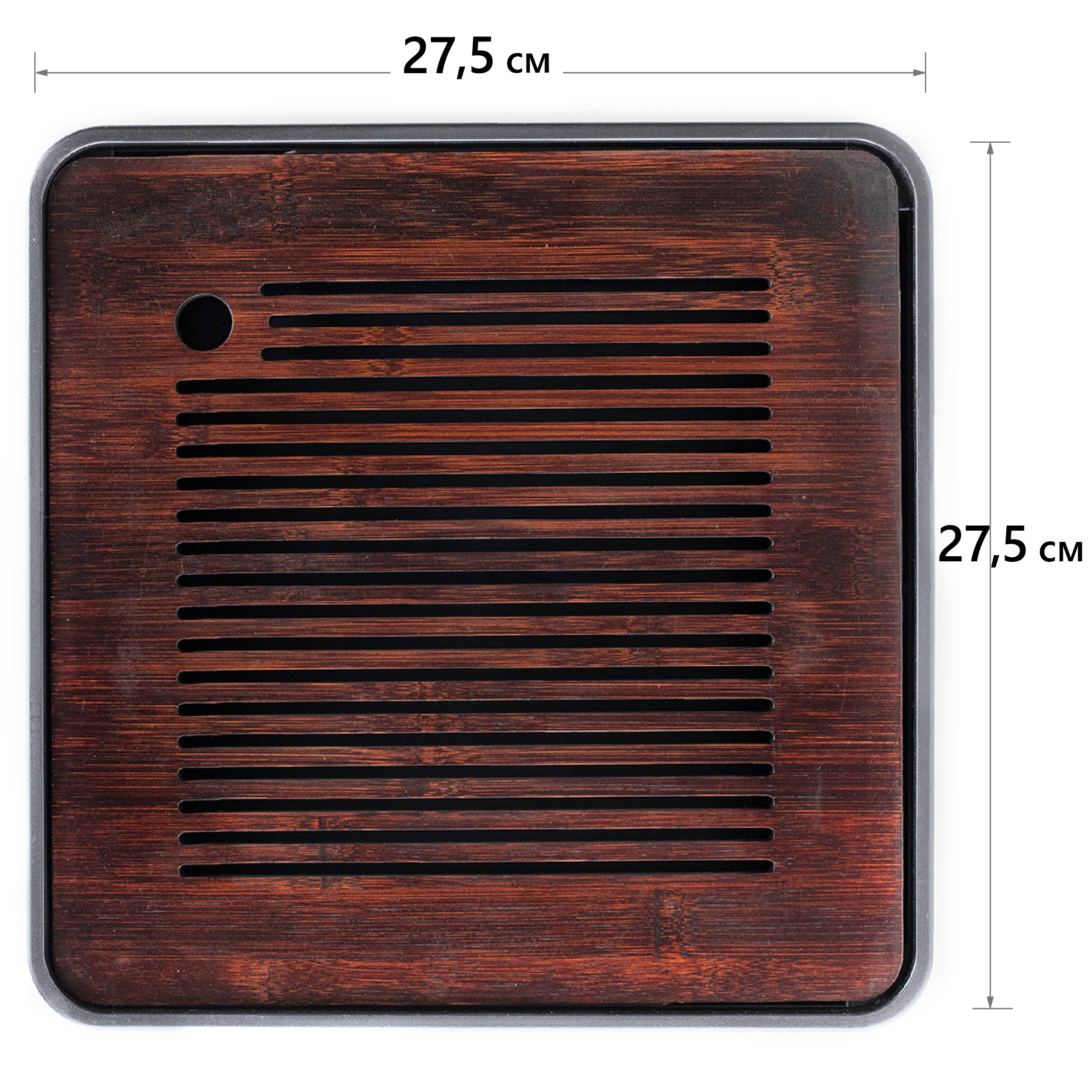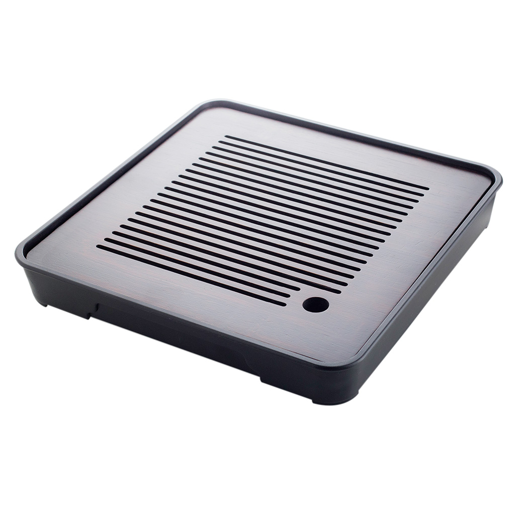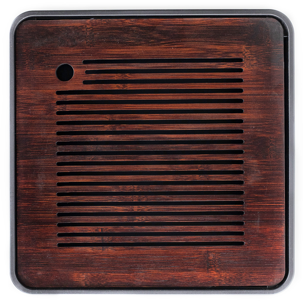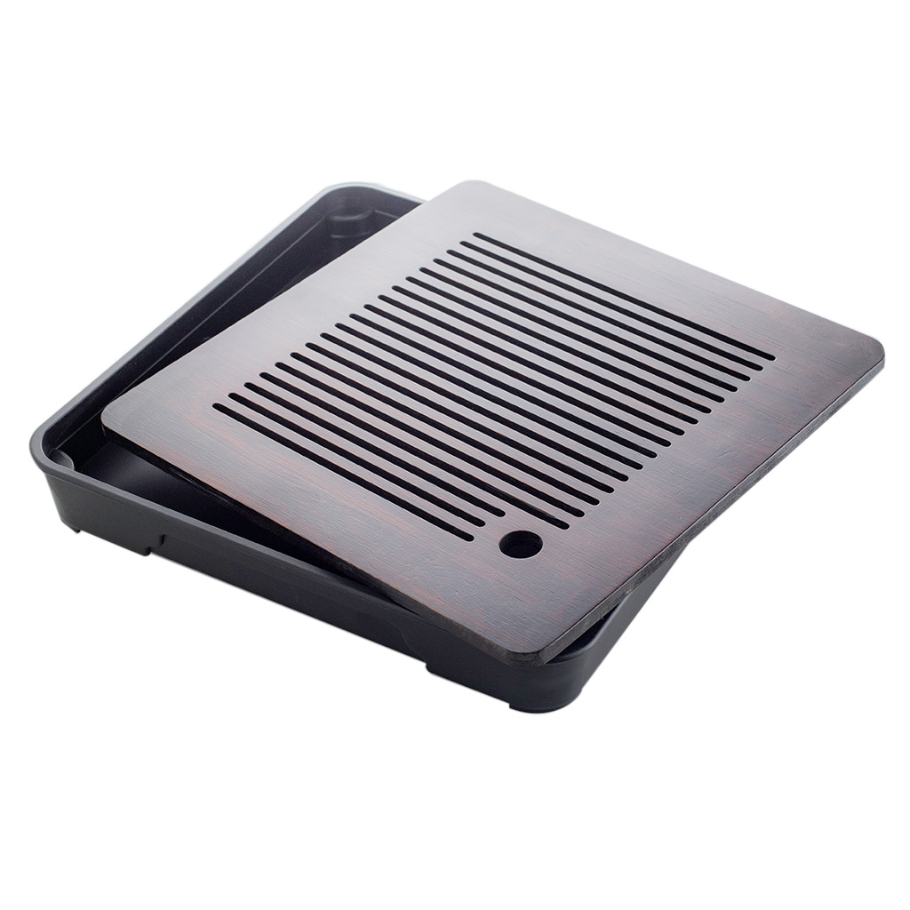 Чайная доска состоит из прямоугольного пластикового поддона черного цвета и бамбуковой крышки с прорезями