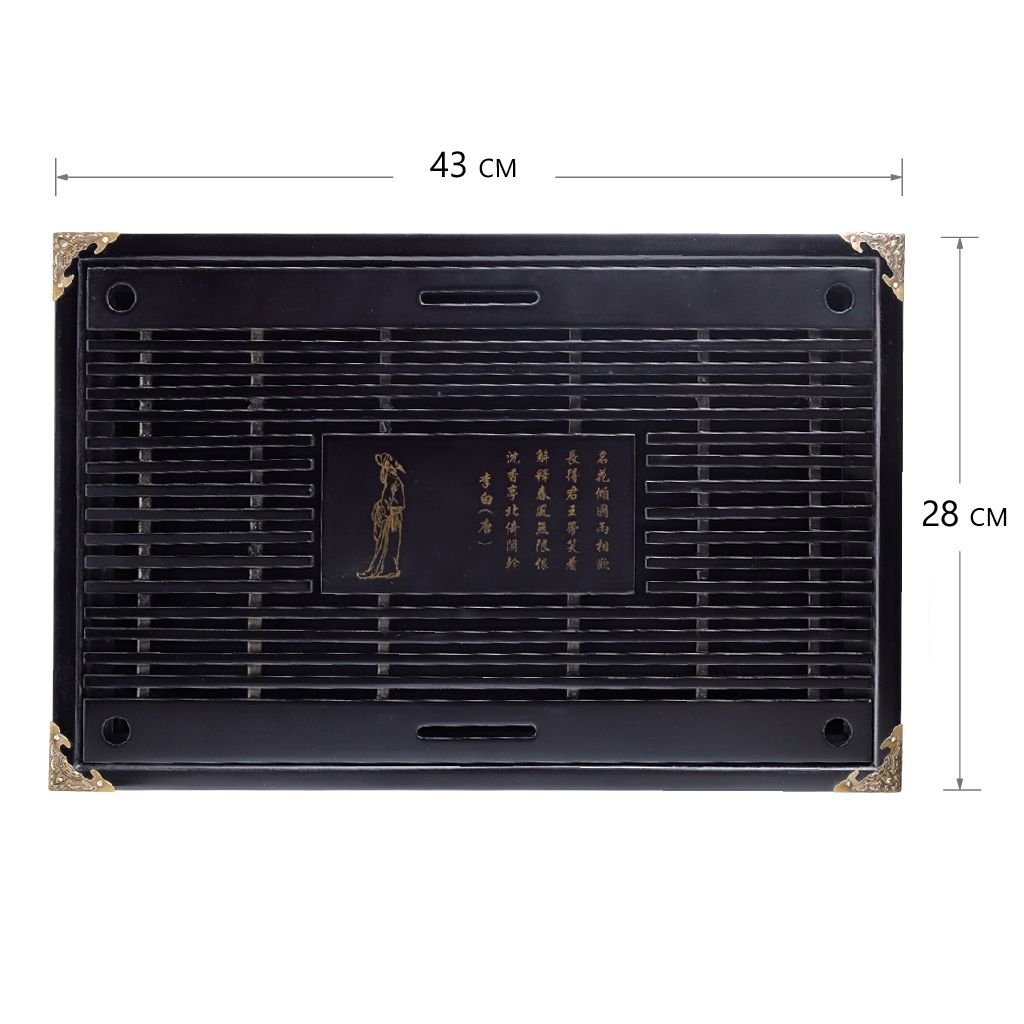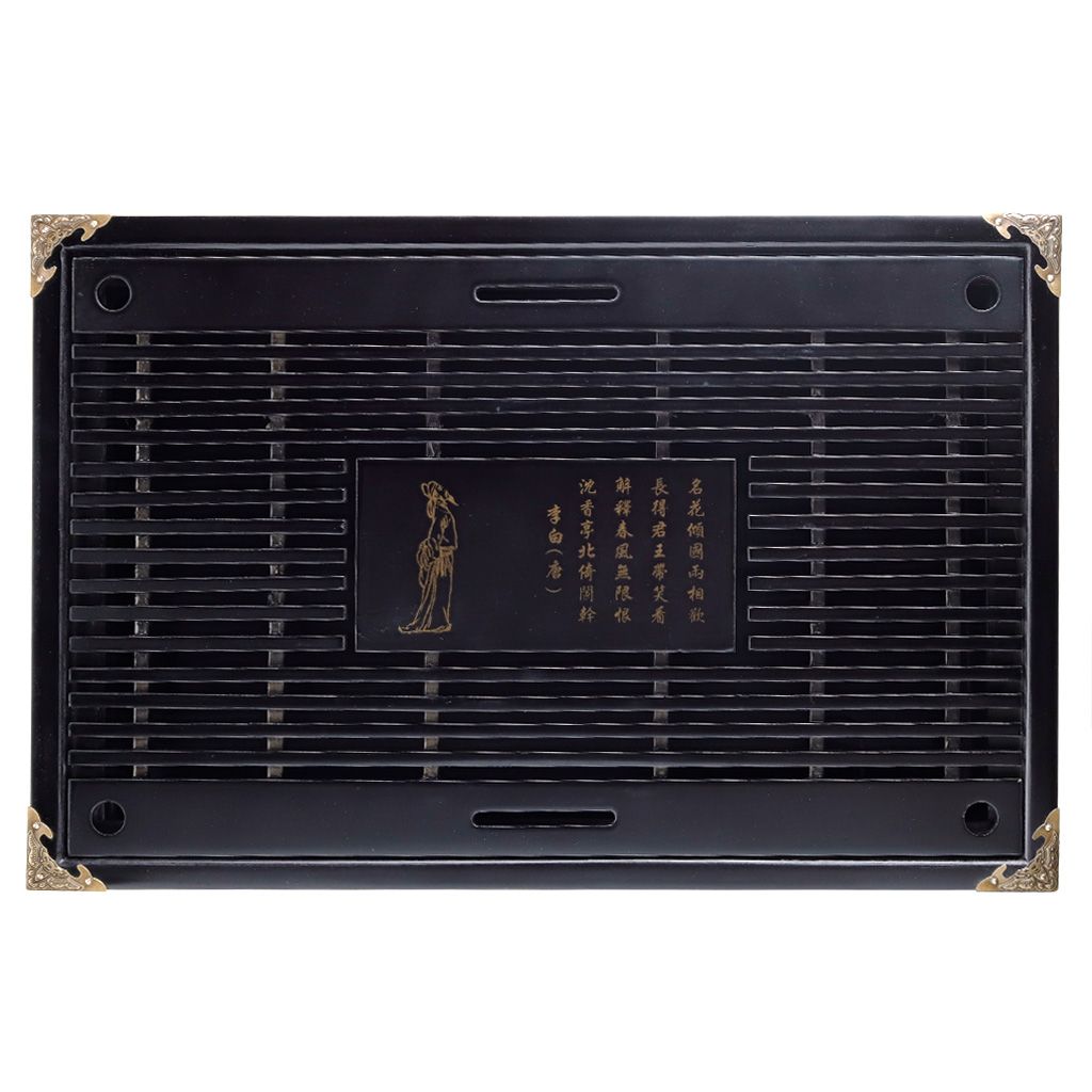 Чайная доска из древесины цвета Венге с резными металлическими уголками, состоит из прямоугольного поддона и решетчатой крышки с прорезными ручками и изображением орхидеи. В комплект входит груша и шланг.