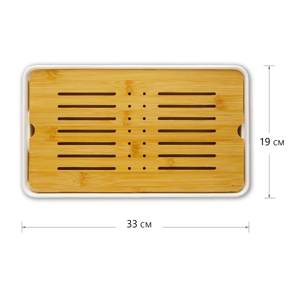 Чайная доска состоит из прямоугольного пластикового поддона белого цвета и бамбуковой крышки с прорезями