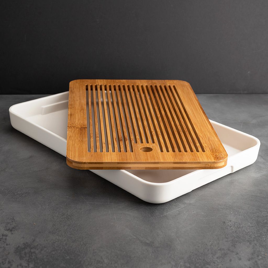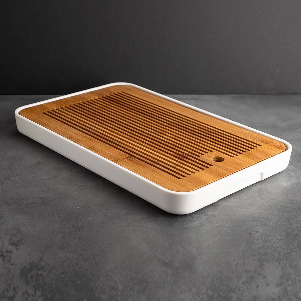 Чайная доска состоит из прямоугольного пластикового поддона белого цвета и бамбуковой крышки с прорезями.
