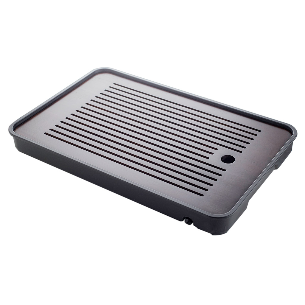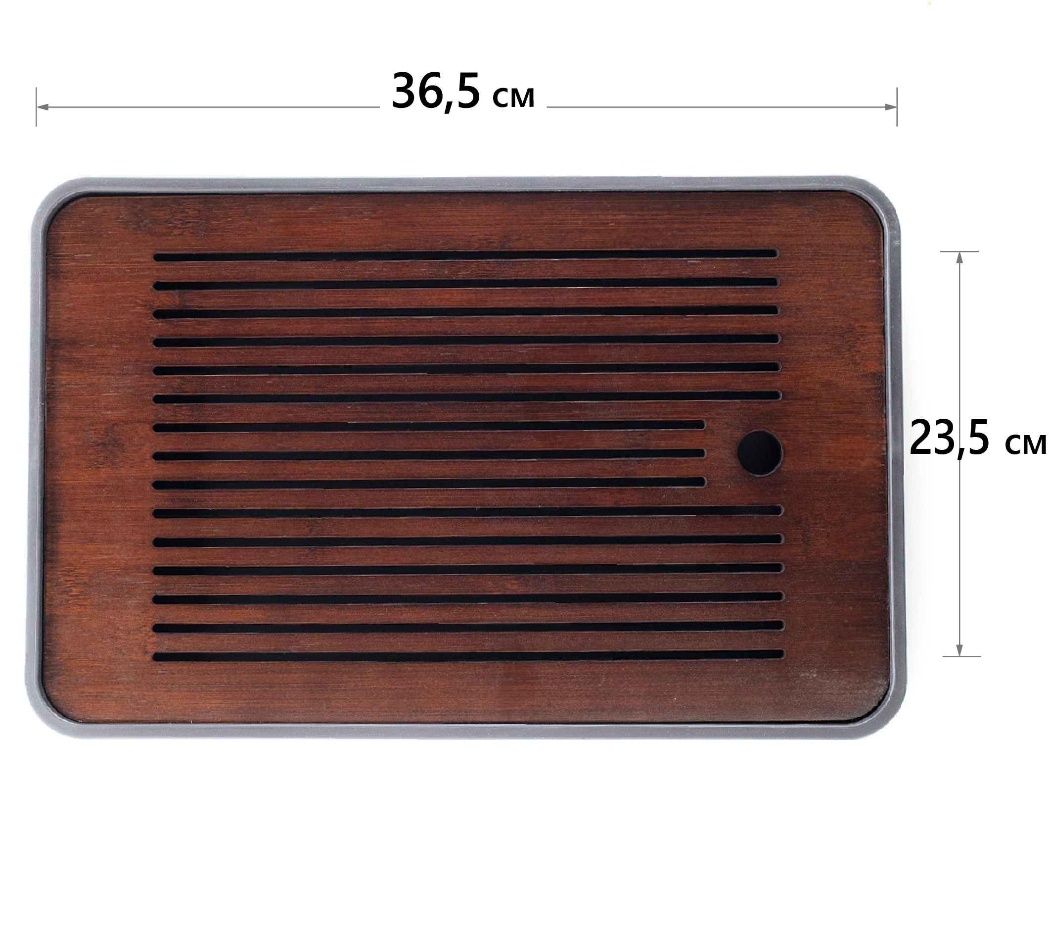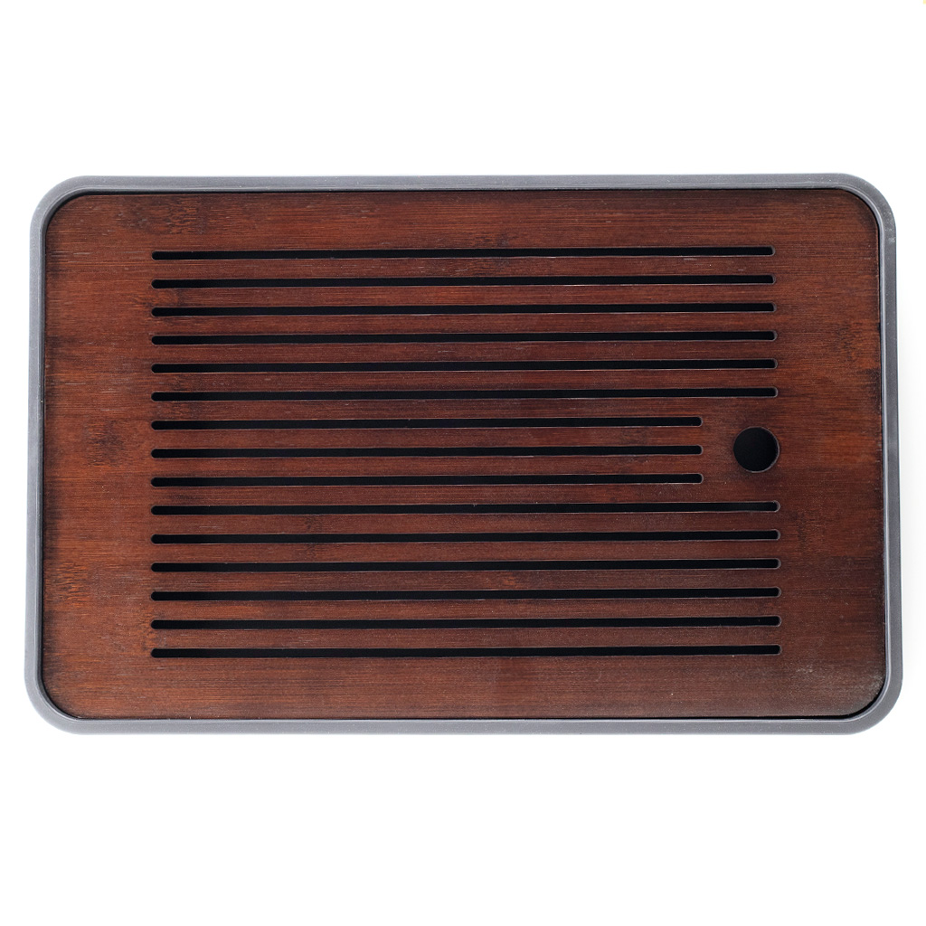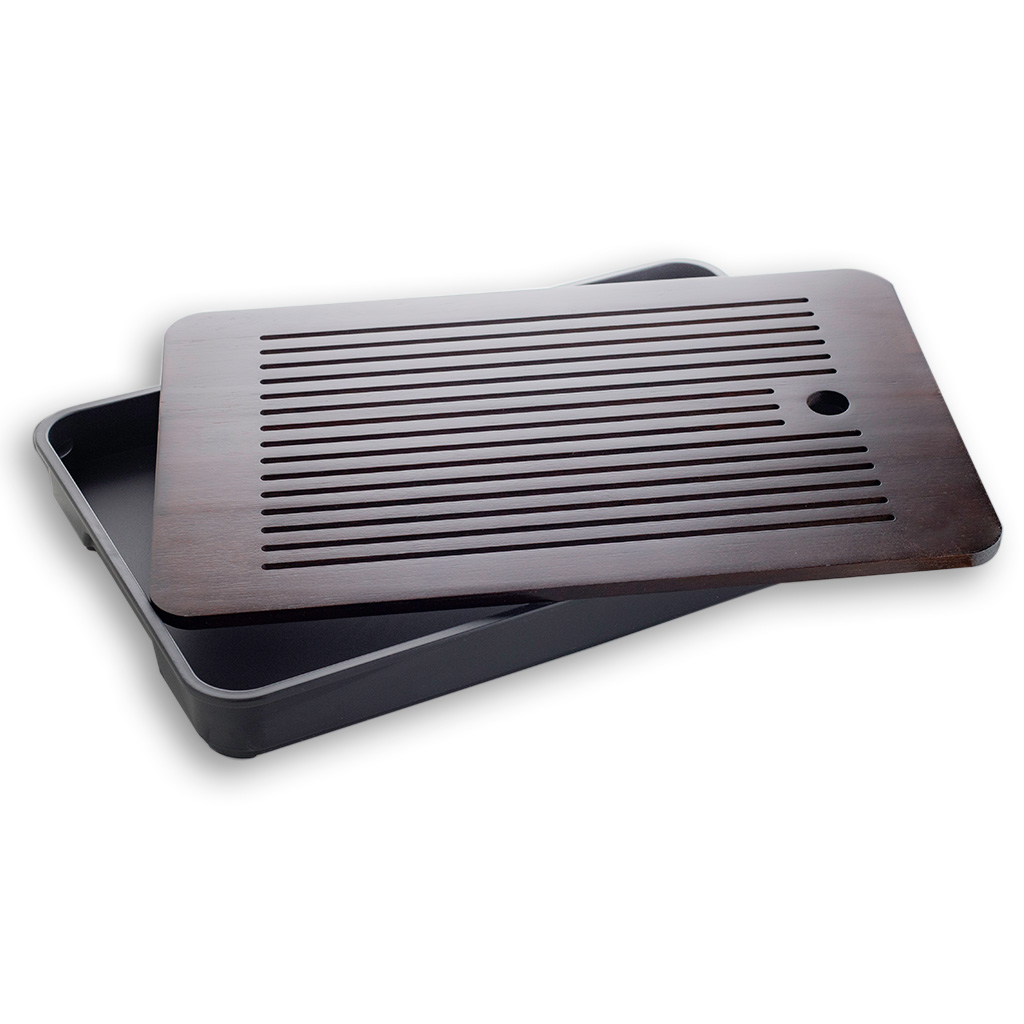 Чайная доска состоит из прямоугольного пластикового поддона черного цвета и бамбуковой крышки с прорезями
