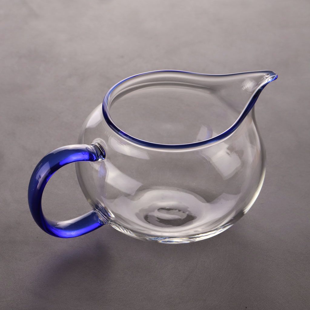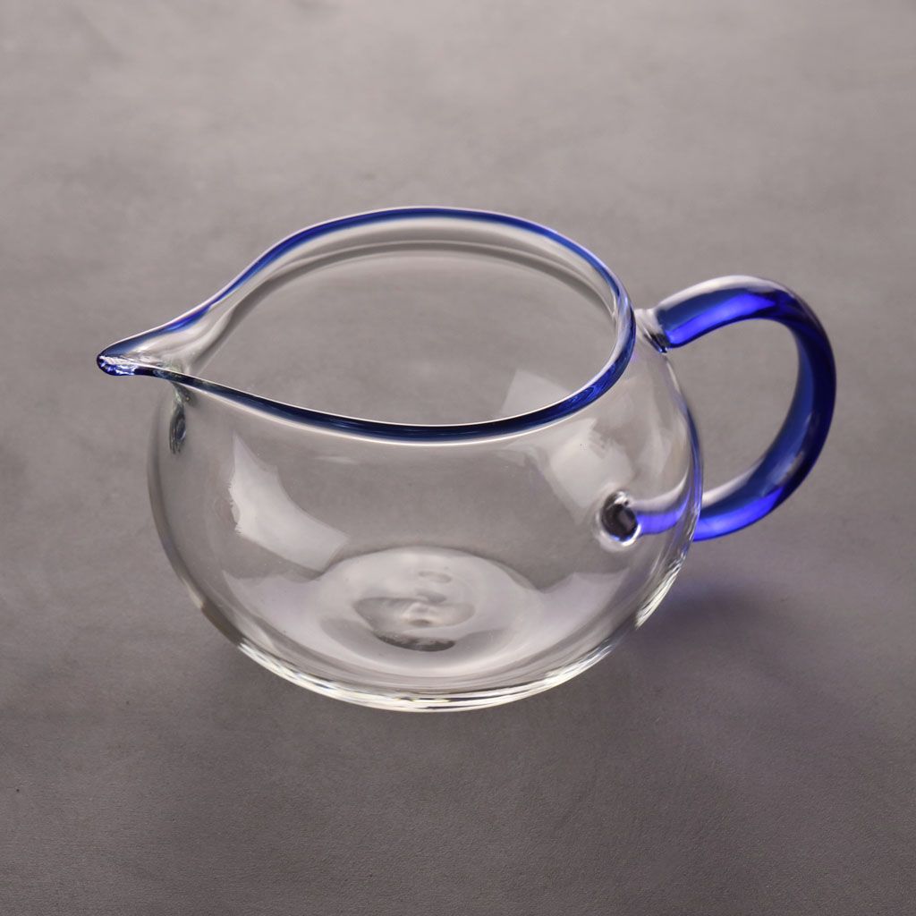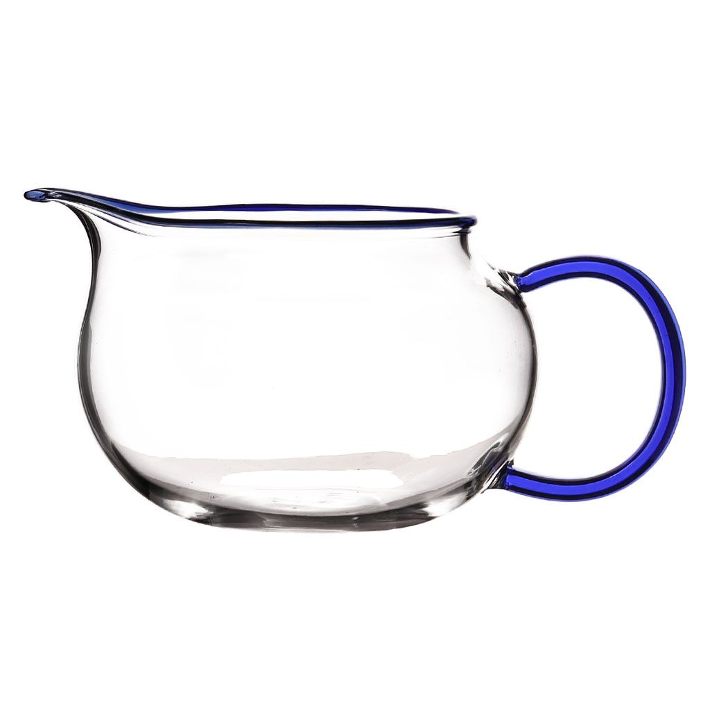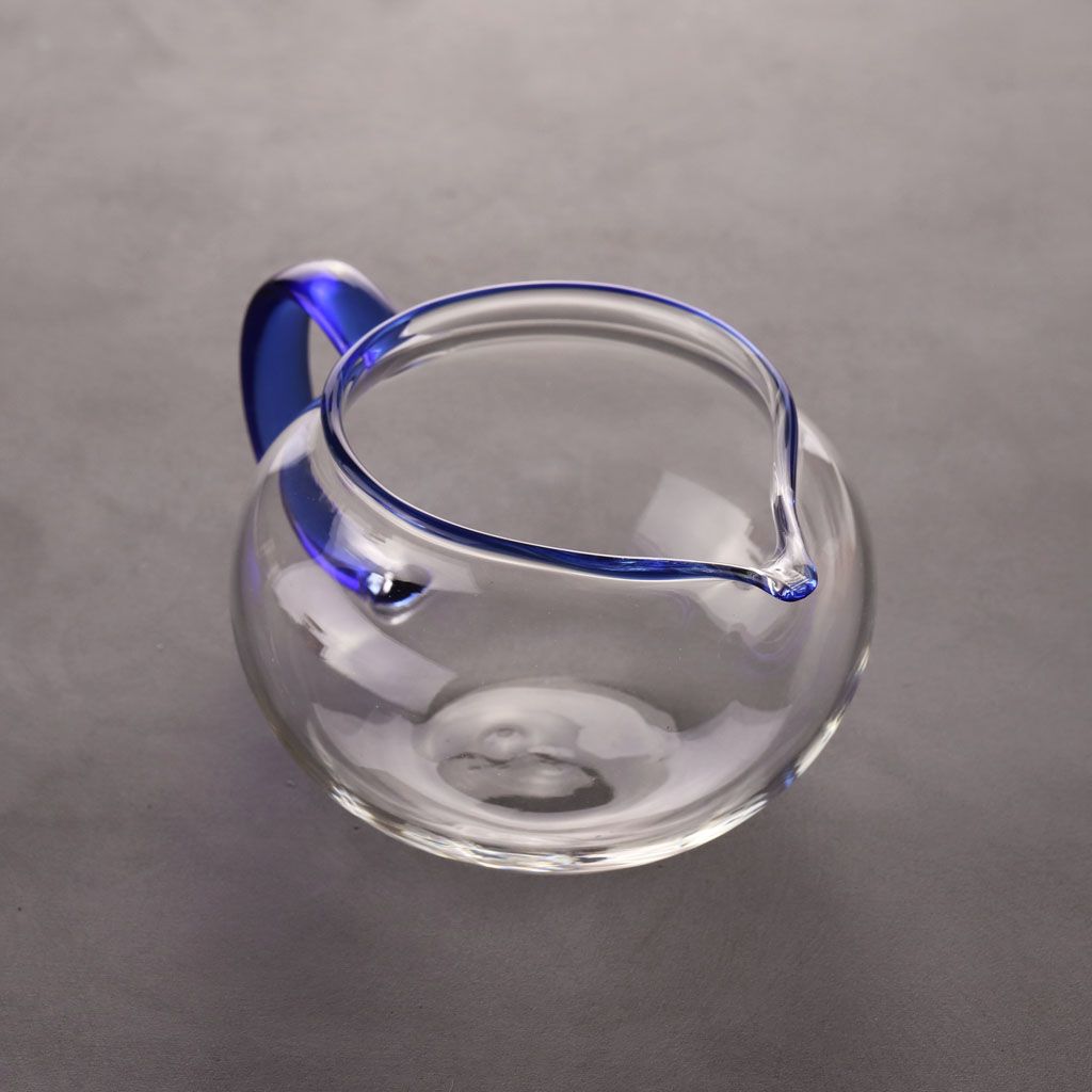 Чахай округлой приплюснутой формы, из жаропрочного стекла, с С-образной ручкой и окантовкой по горлышку из цветного синего стекла