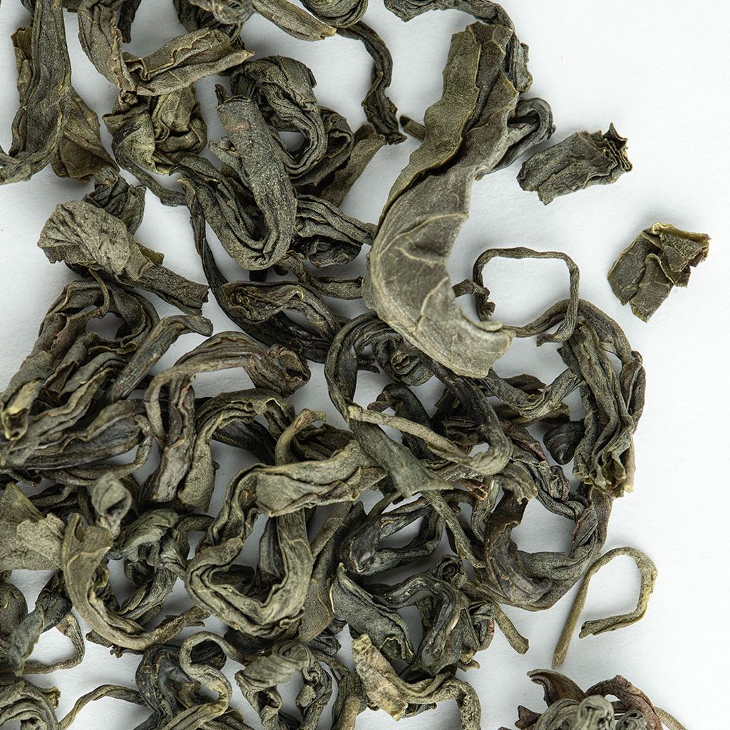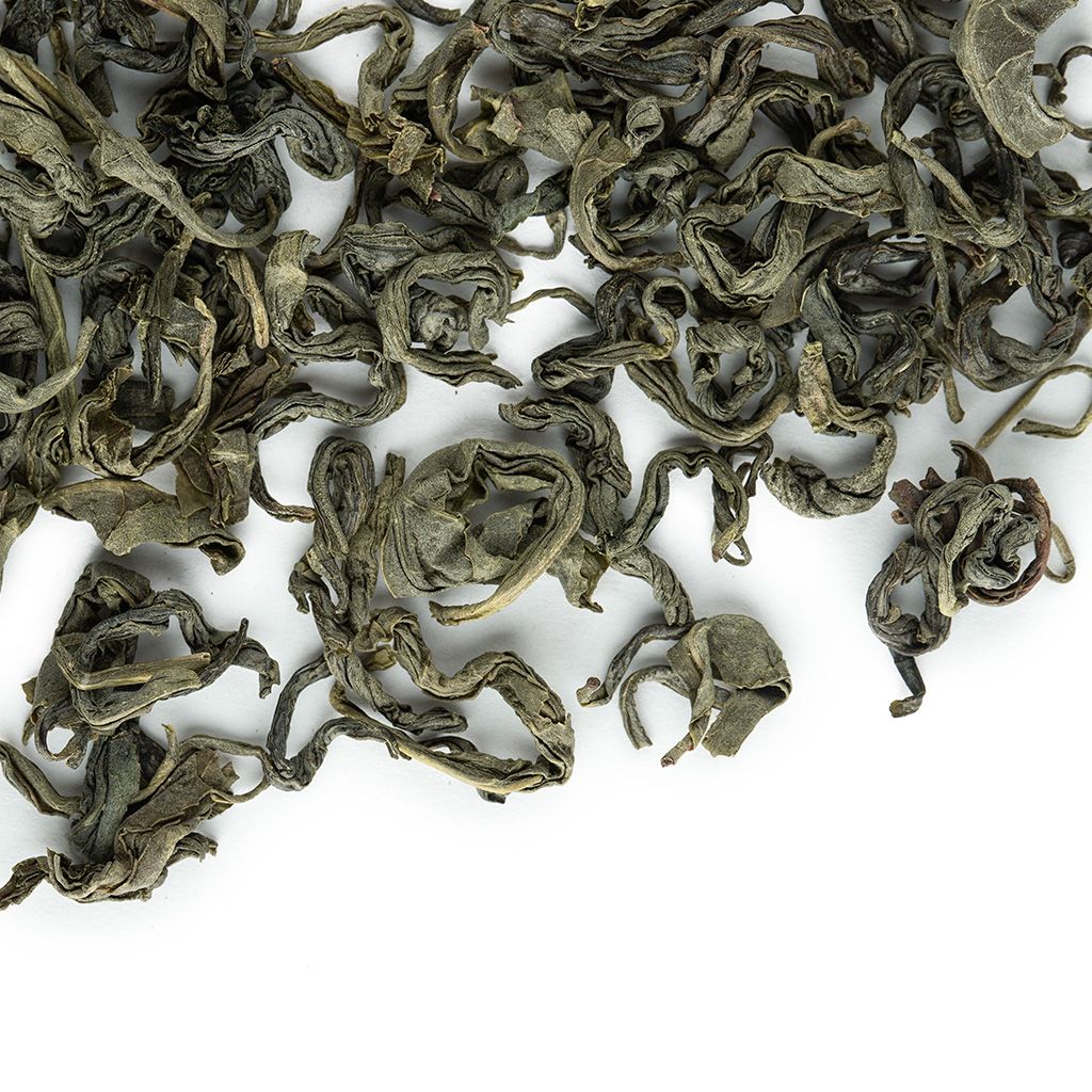 Сухая россыпь представляет собой кудрявые чайные листочки темно-изумрудного цвета, которым придана форма спиралей. Аромат чая в сухом виде – травянистый с ореховой ноткой.