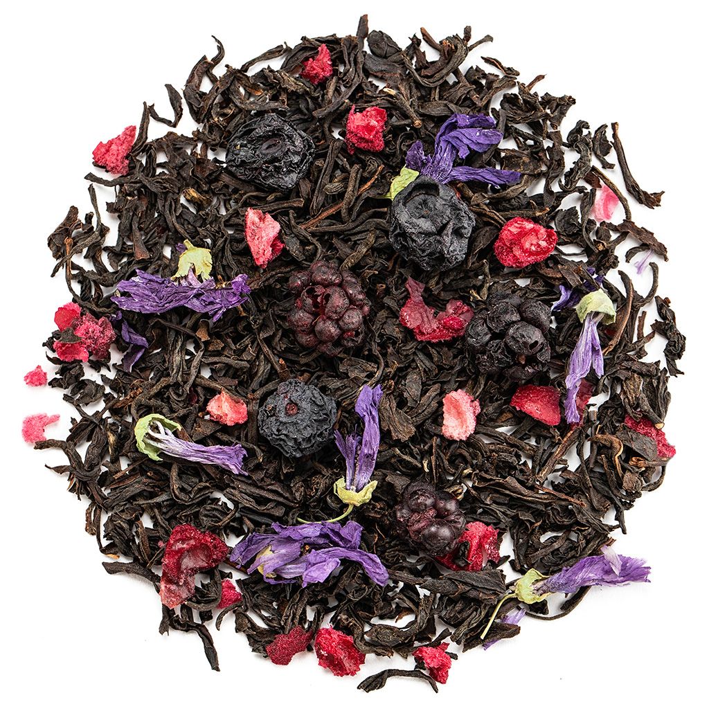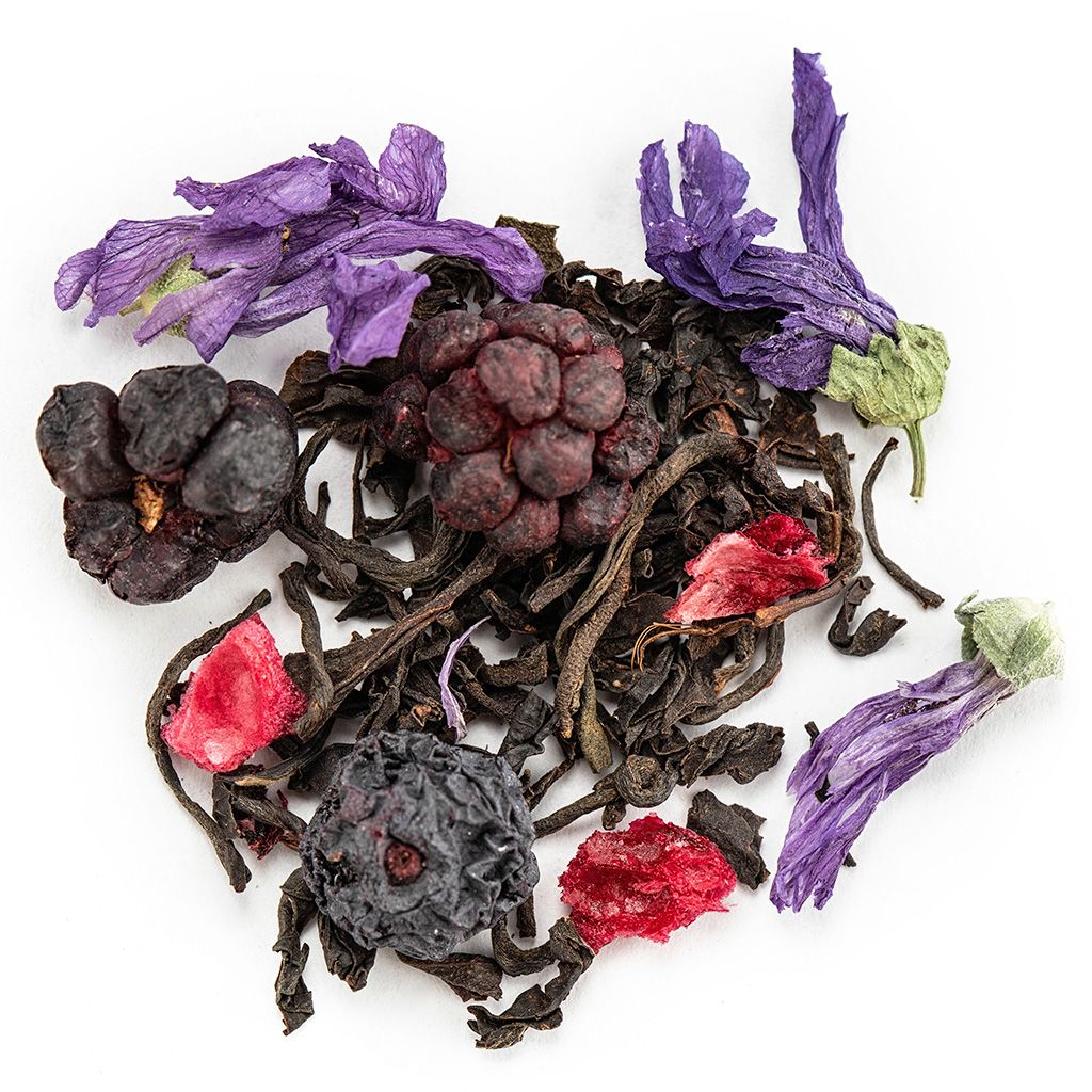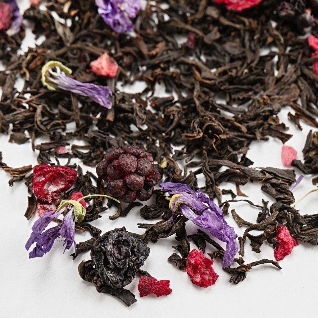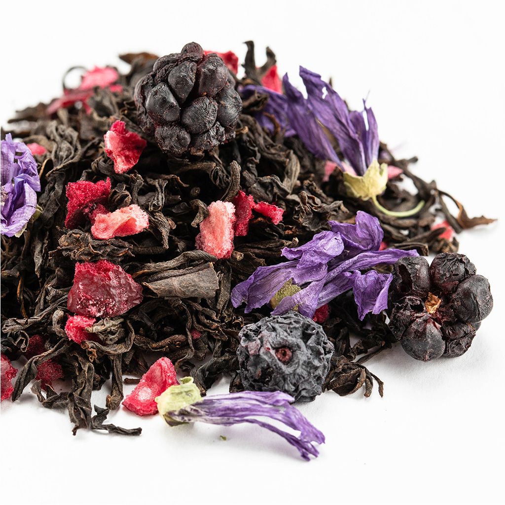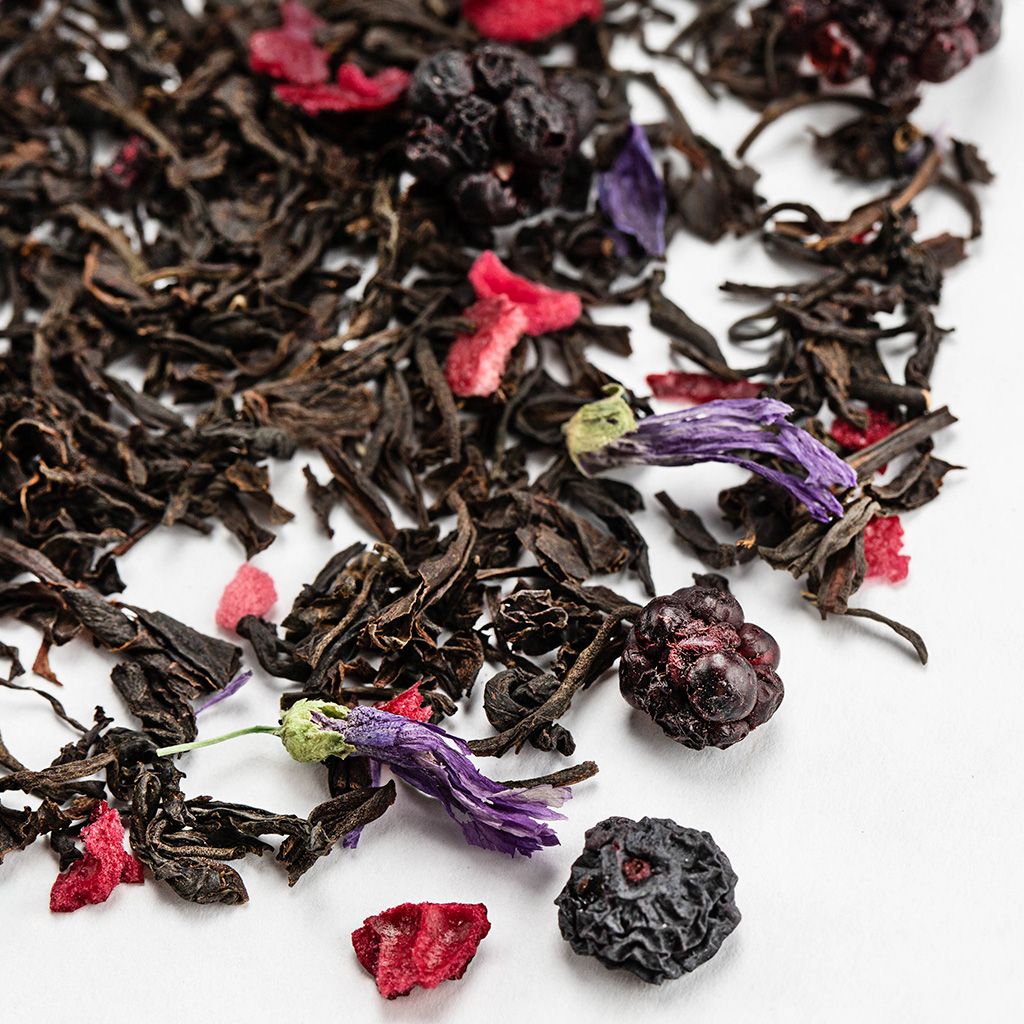 Чай черный индийский, ежевика ягоды, голубика ягоды, мальва цветы, клюква кусочки, аромат лесных ягод.