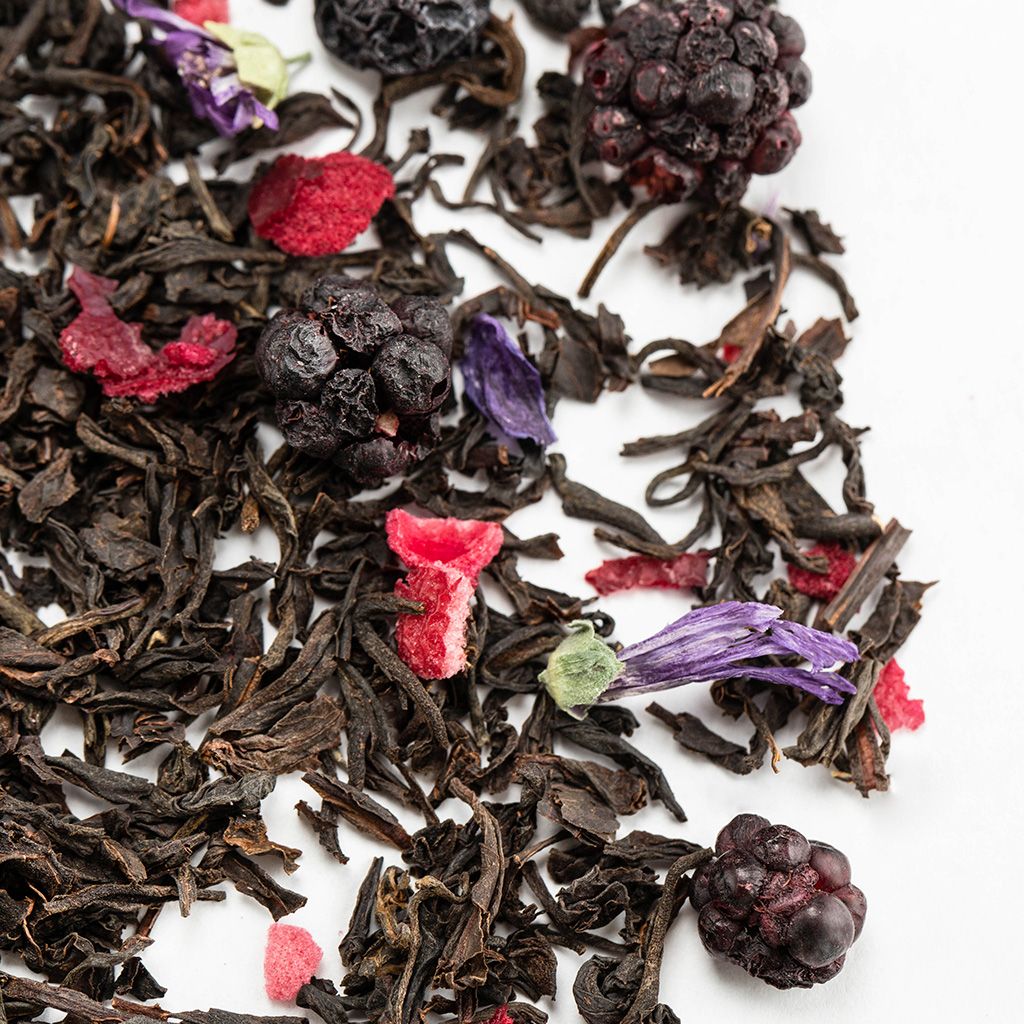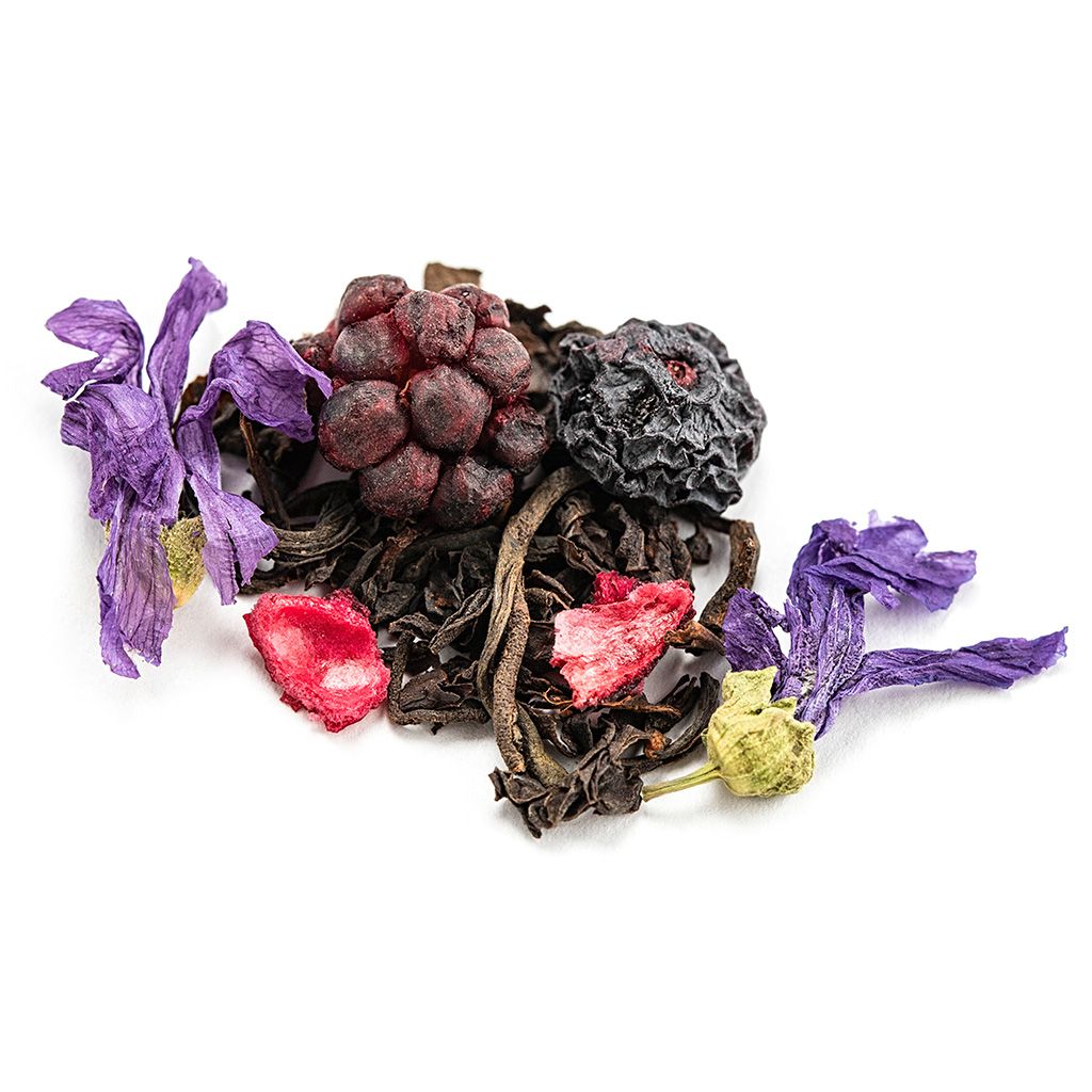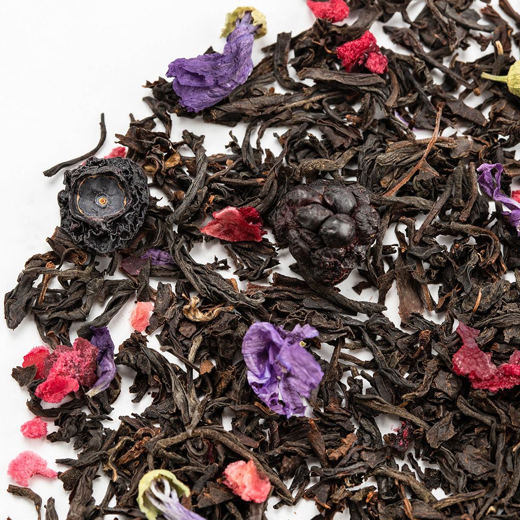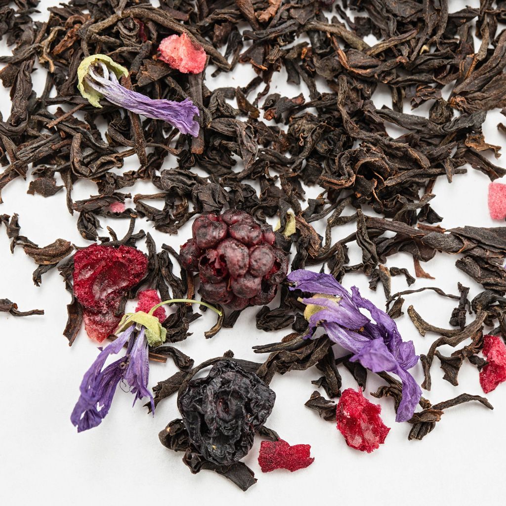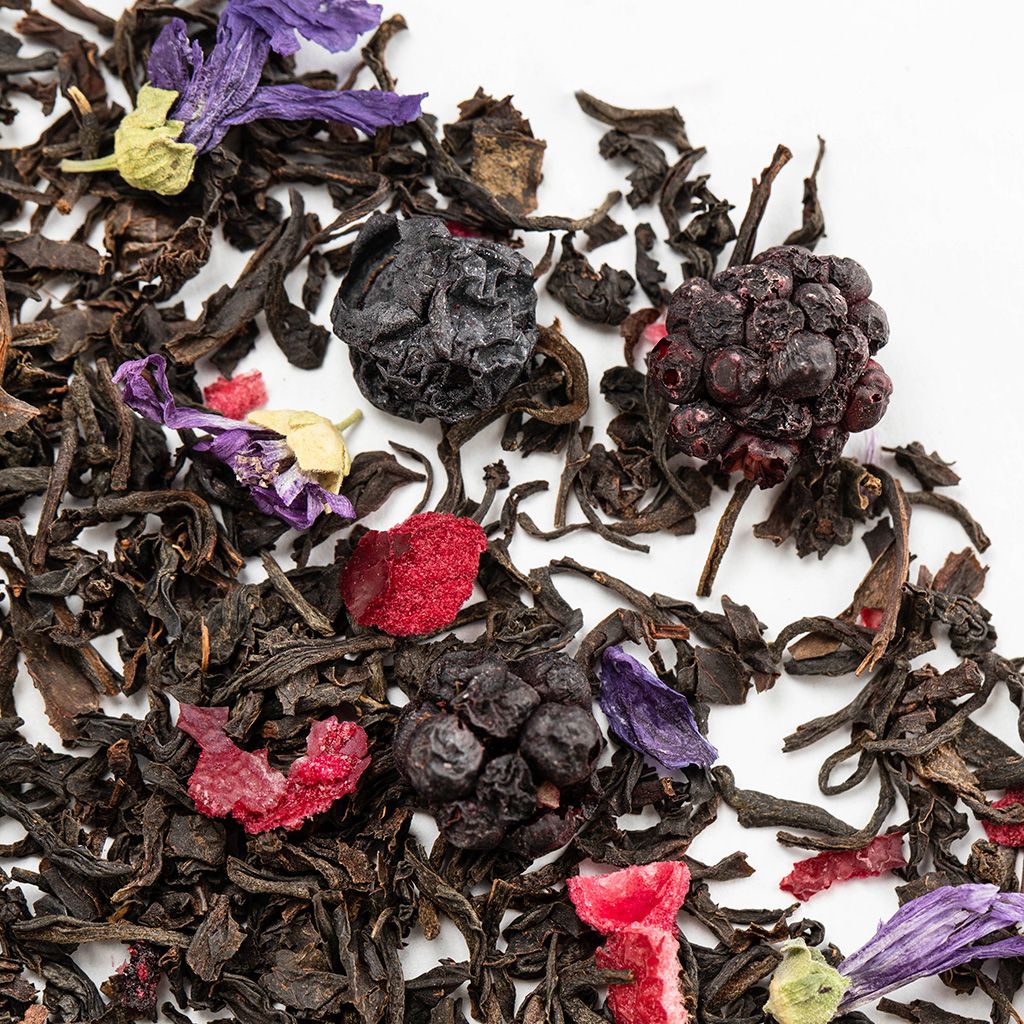 Чай черный индийский, ежевика ягоды, голубика ягоды, мальва цветы, клюква кусочки, аромат лесных ягод.