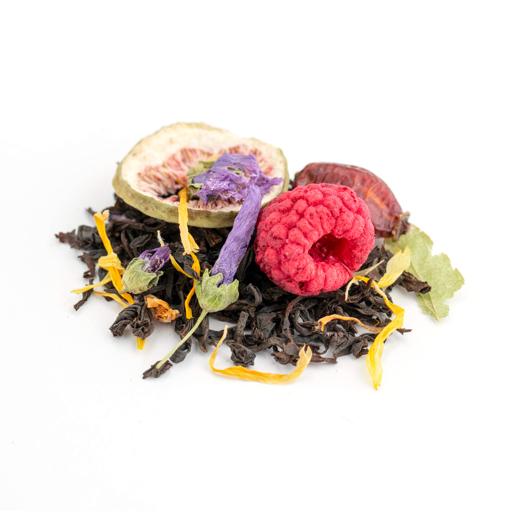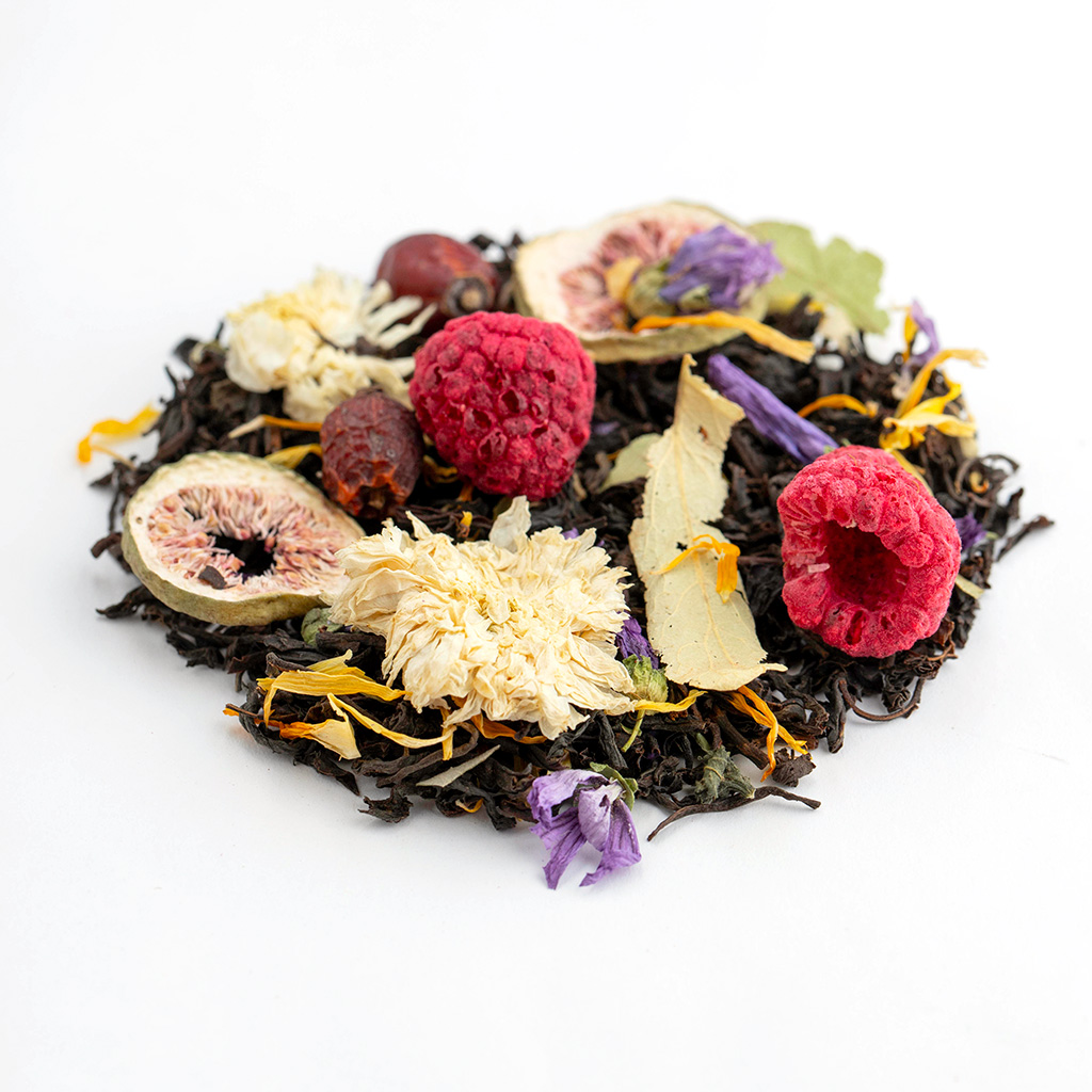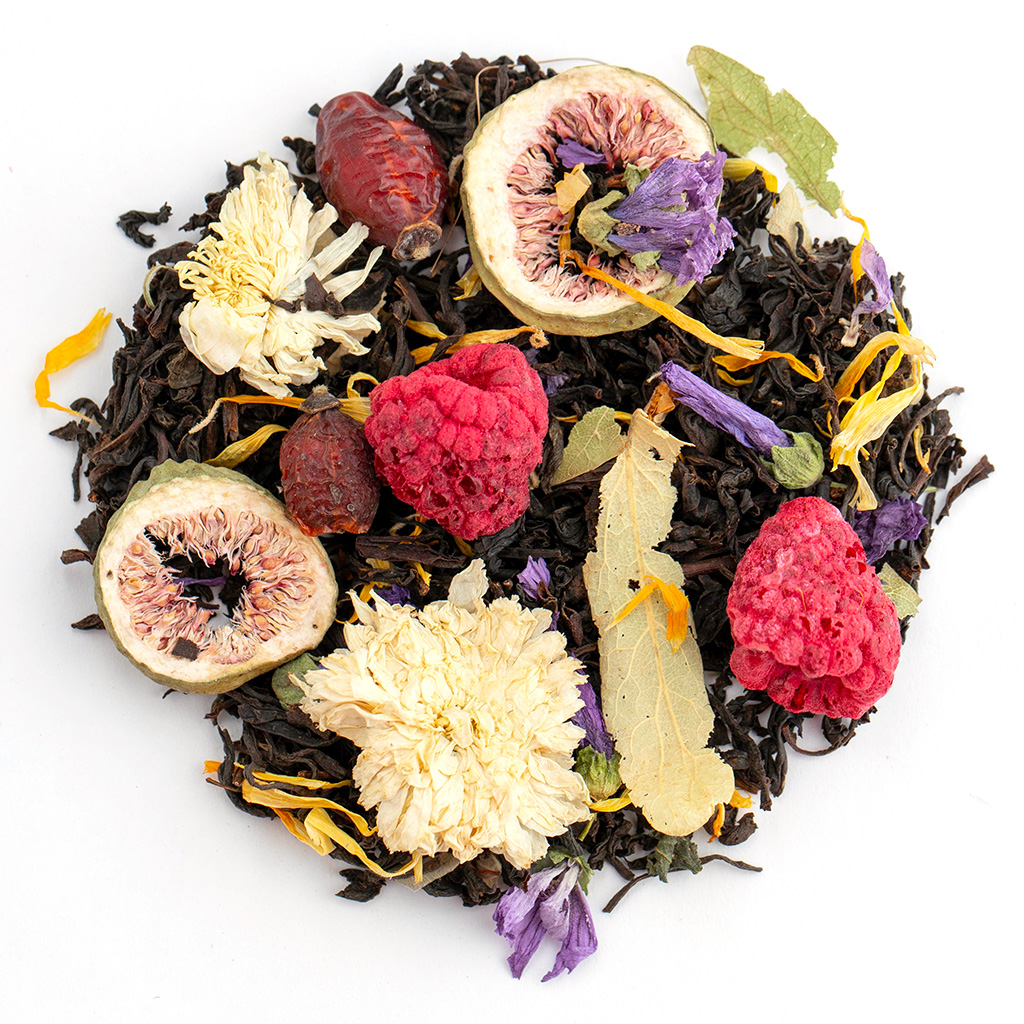 Чай черный индийский, плоды шиповника, ягоды малины, слайсы инжира, липа, хризантема, цветы мальвы, лепестки календулы, аромат фруктового сада
