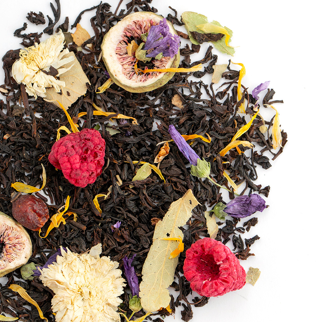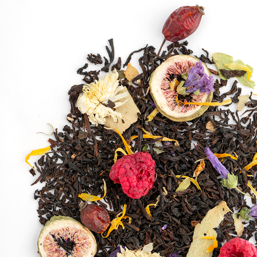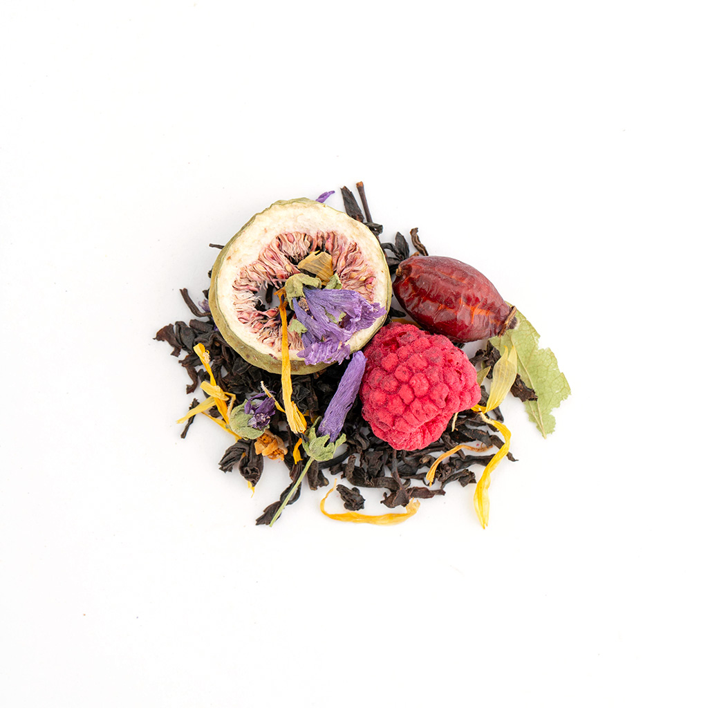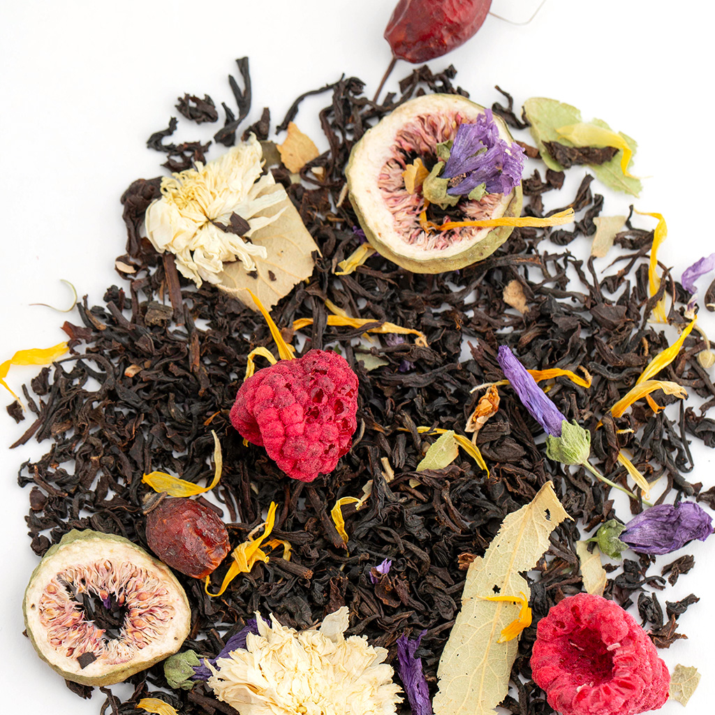Чай черный индийский, плоды шиповника, ягоды малины, слайсы инжира, липа, хризантема, цветы мальвы, лепестки календулы, аромат фруктового сада