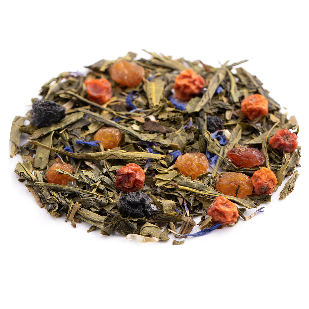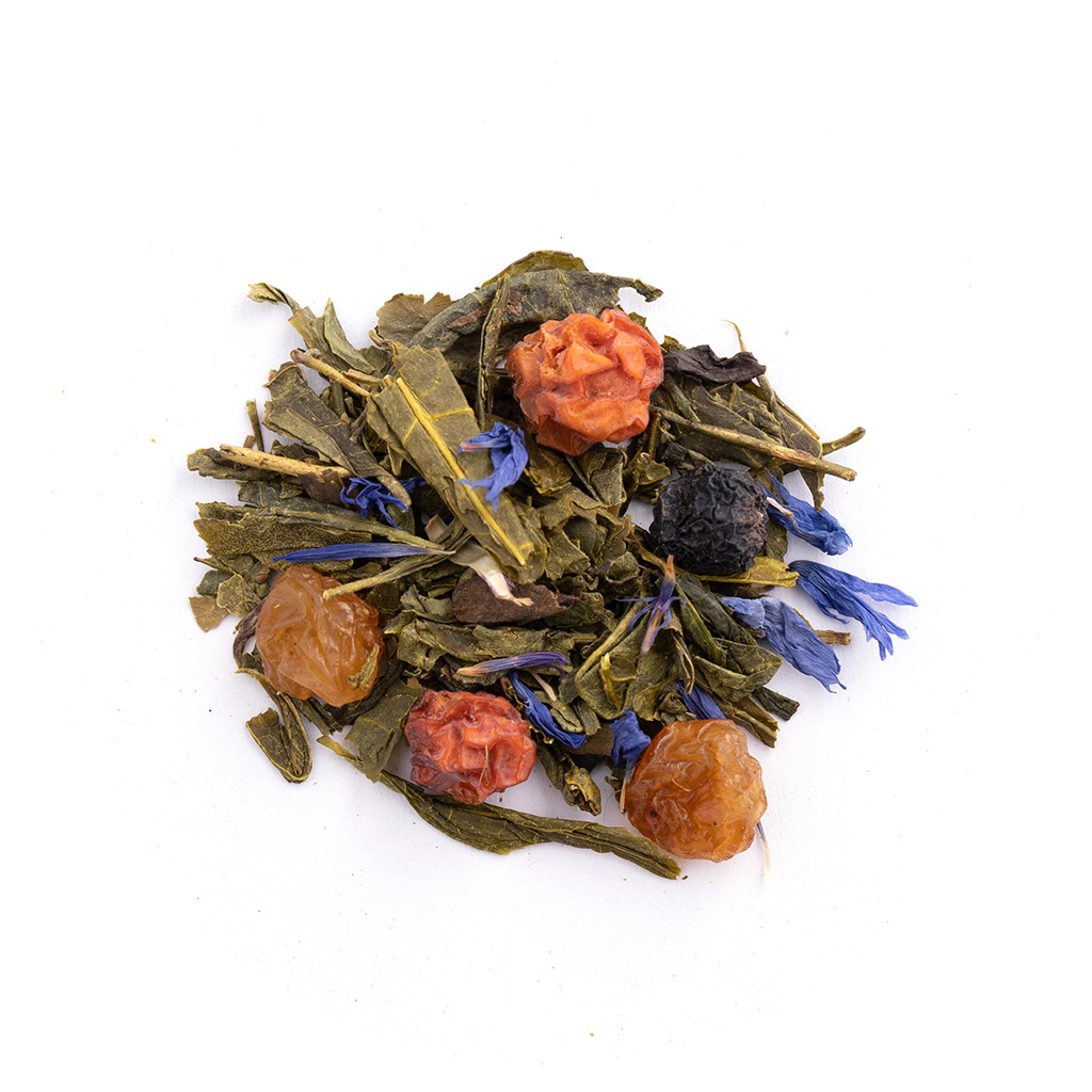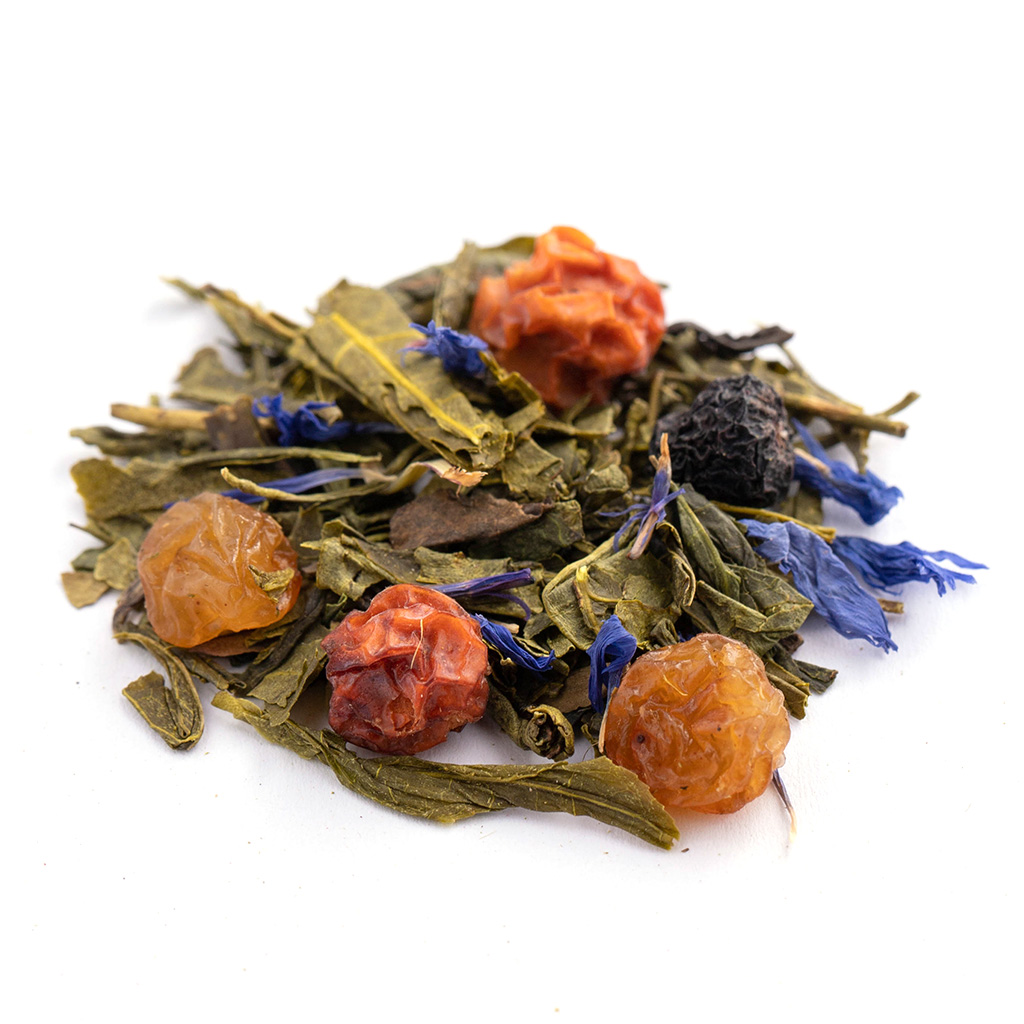 Состав: чай зеленый китайский, изюм, красная рябина, плоды аронии, лепестки василька, аромат фруктового джема