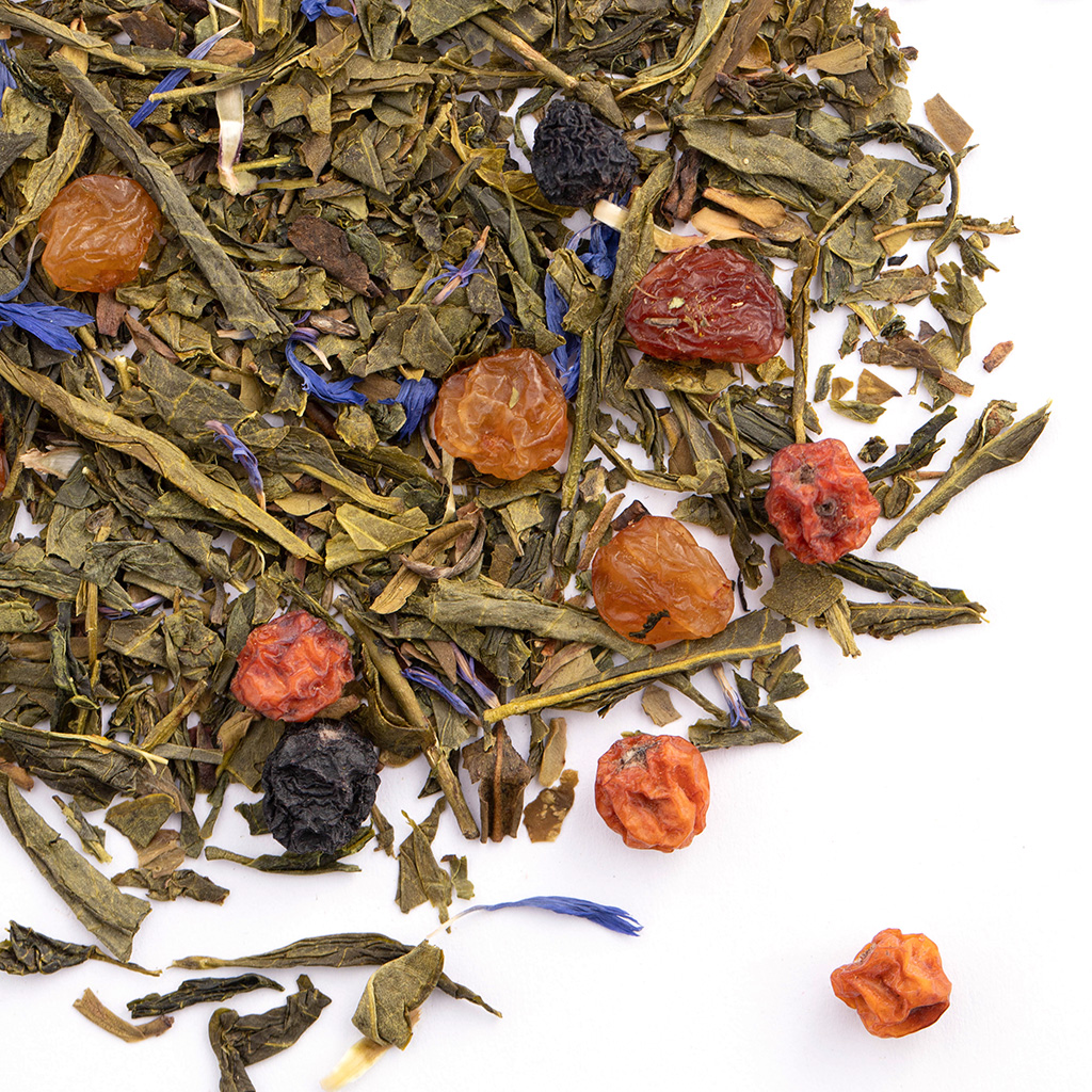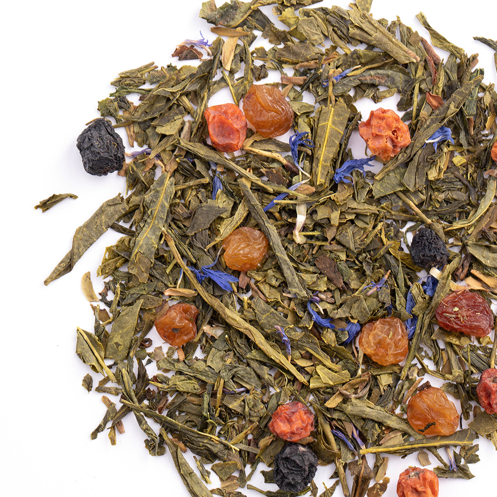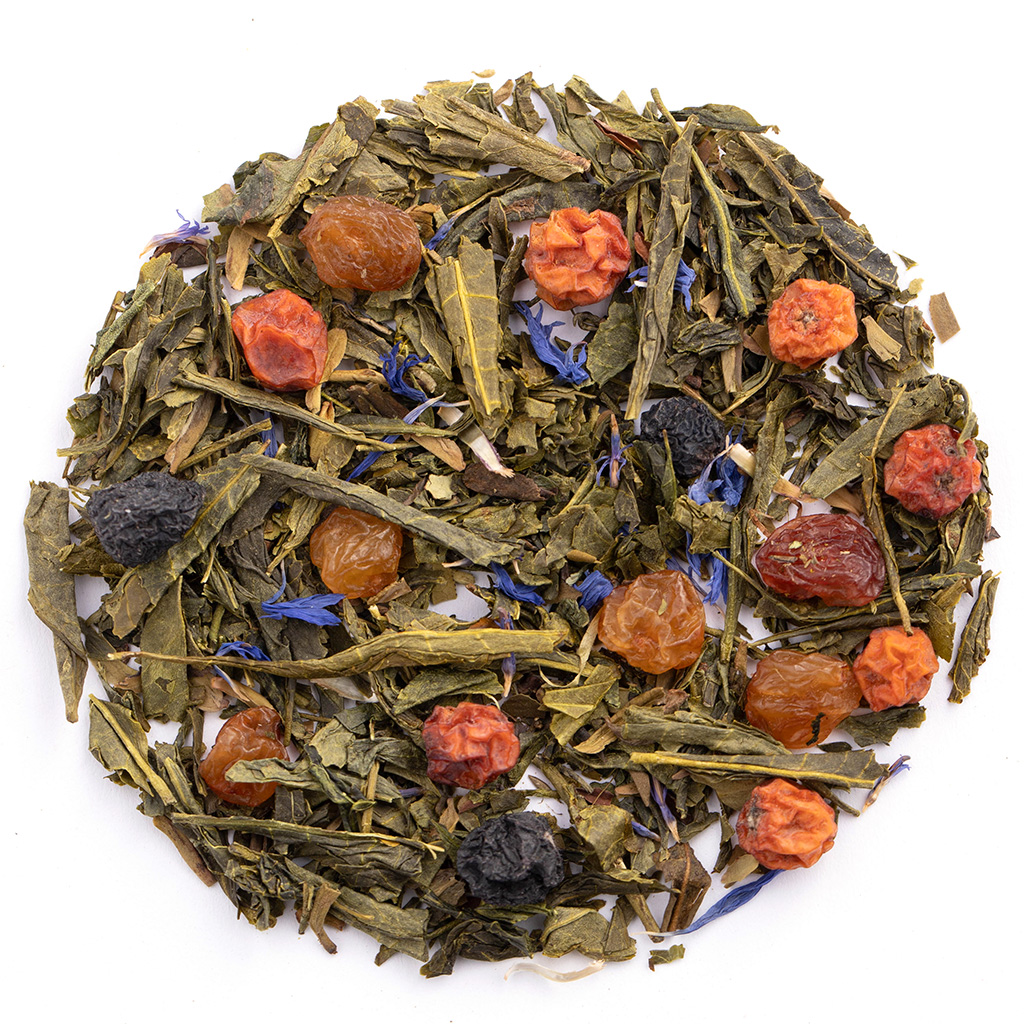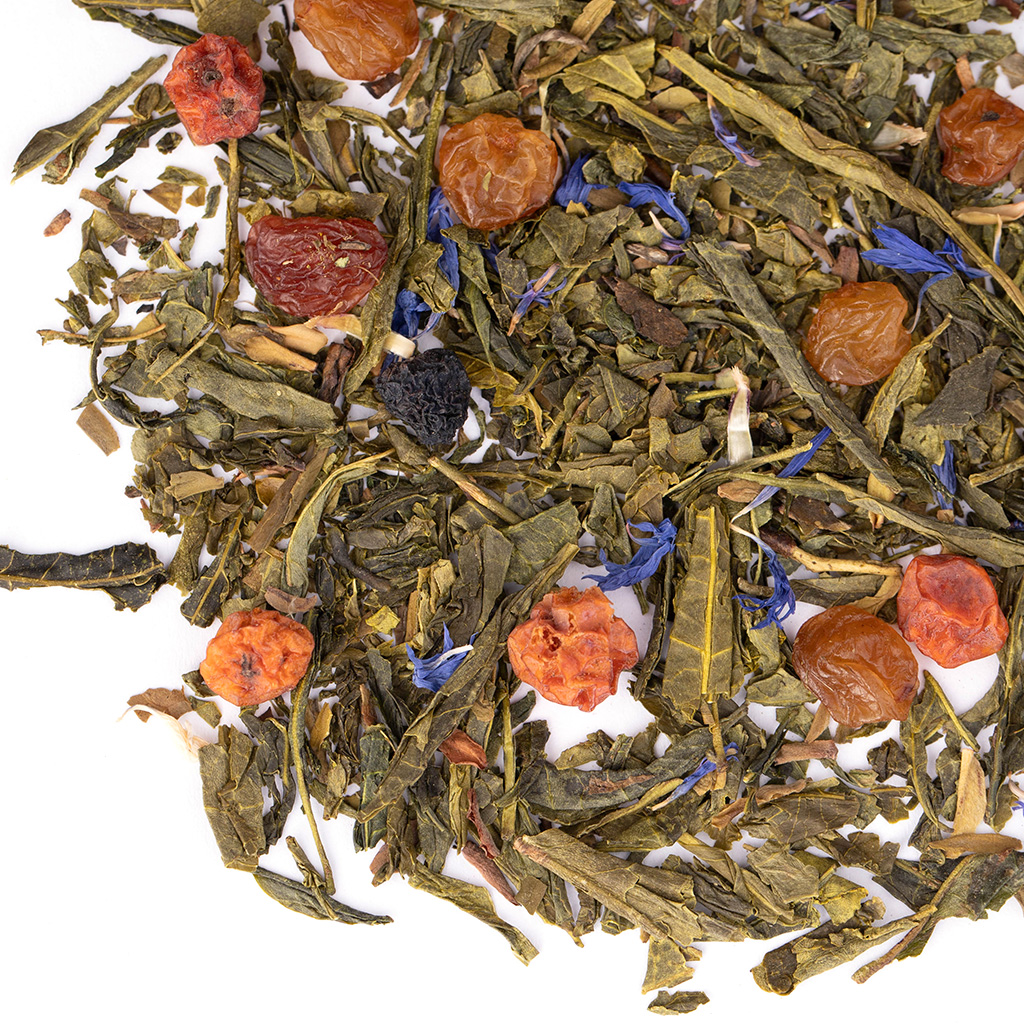 Состав: чай зеленый китайский, изюм, красная рябина, плоды аронии, лепестки василька, аромат фруктового джема