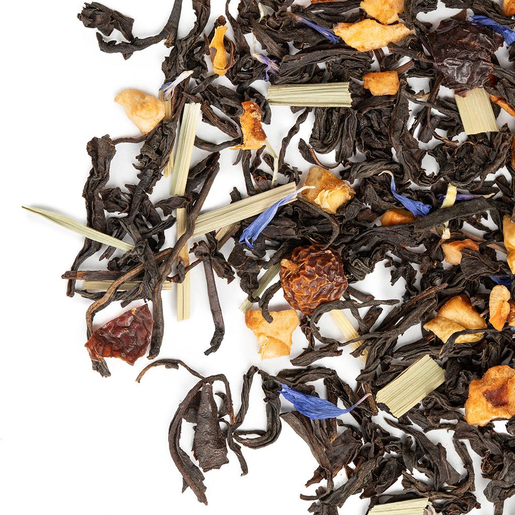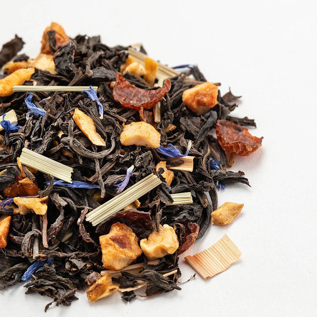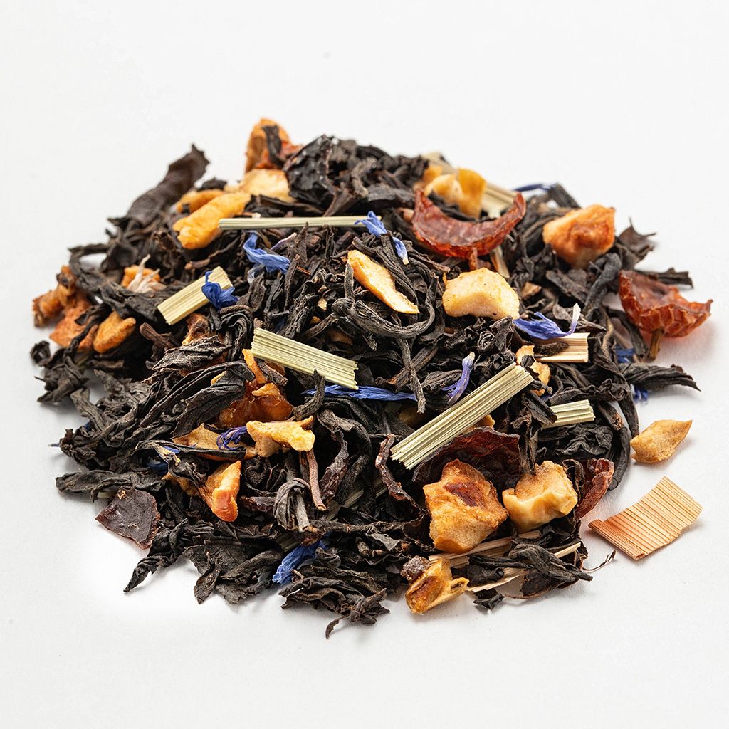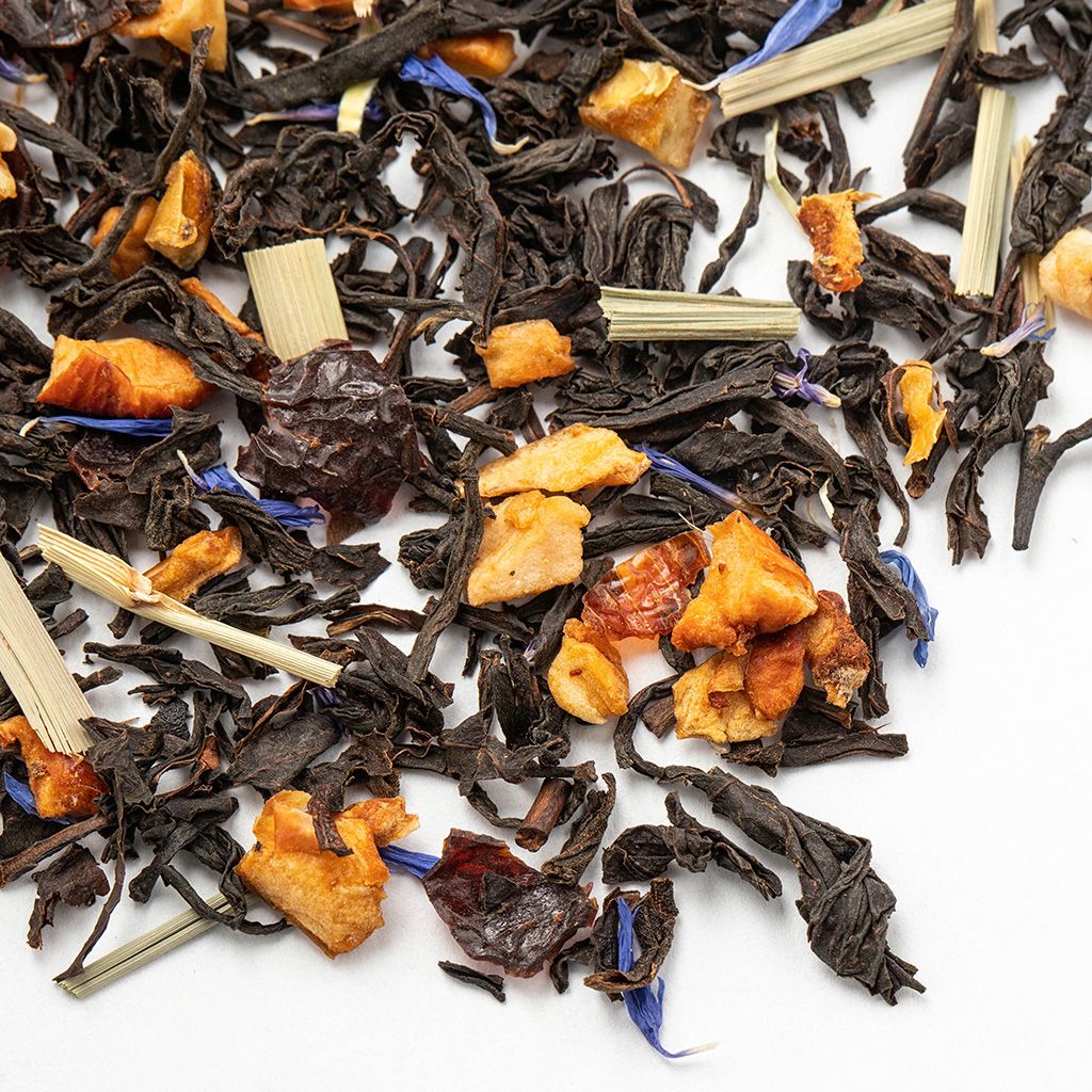 Состав: чай черный, кусочки яблок, плоды шиповника, измельченная лимонная трава, лепестки василька, аромат цветущего сада