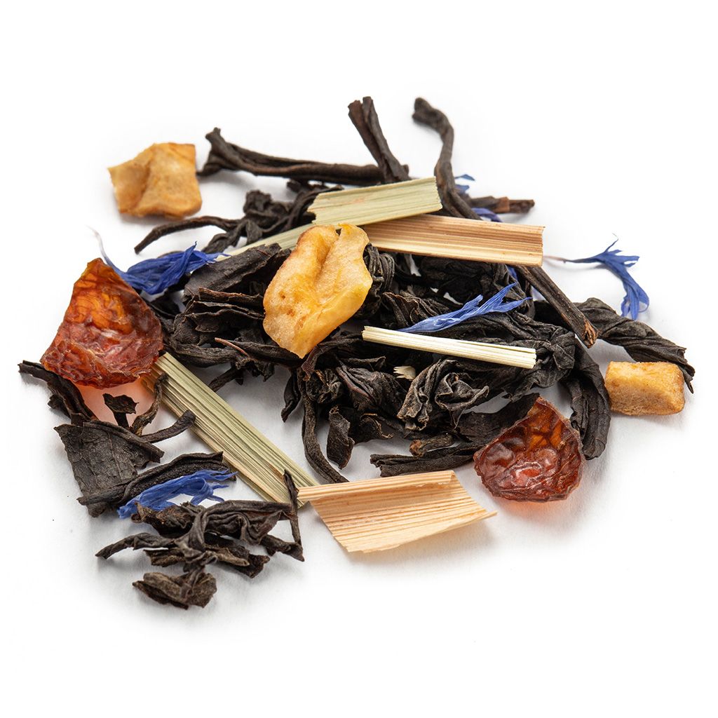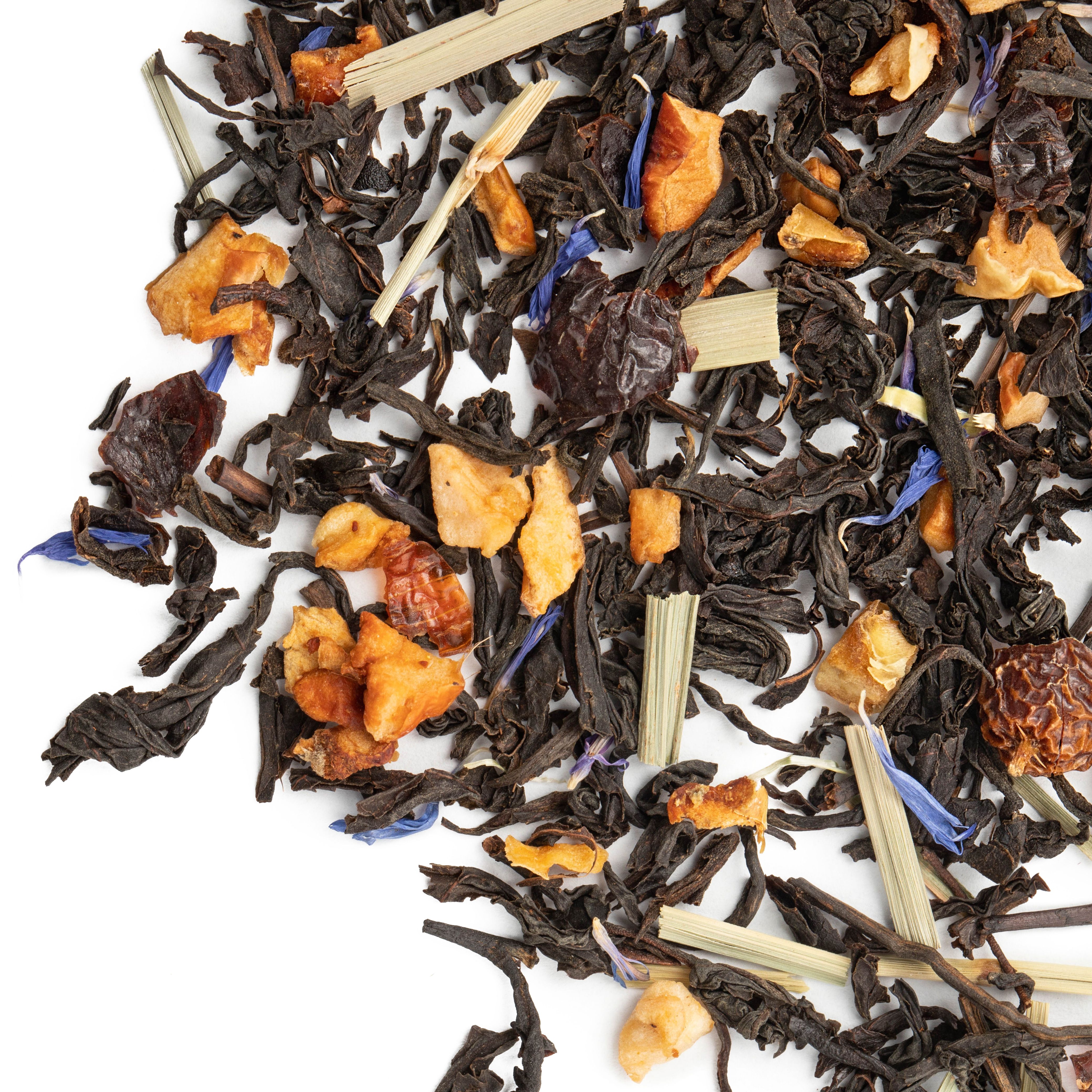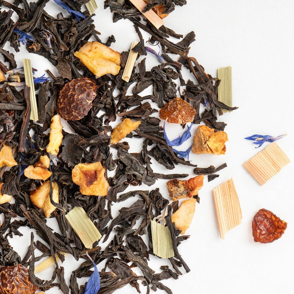 Состав: чай черный, кусочки яблок, плоды шиповника, измельченная лимонная трава, лепестки василька, аромат цветущего сада