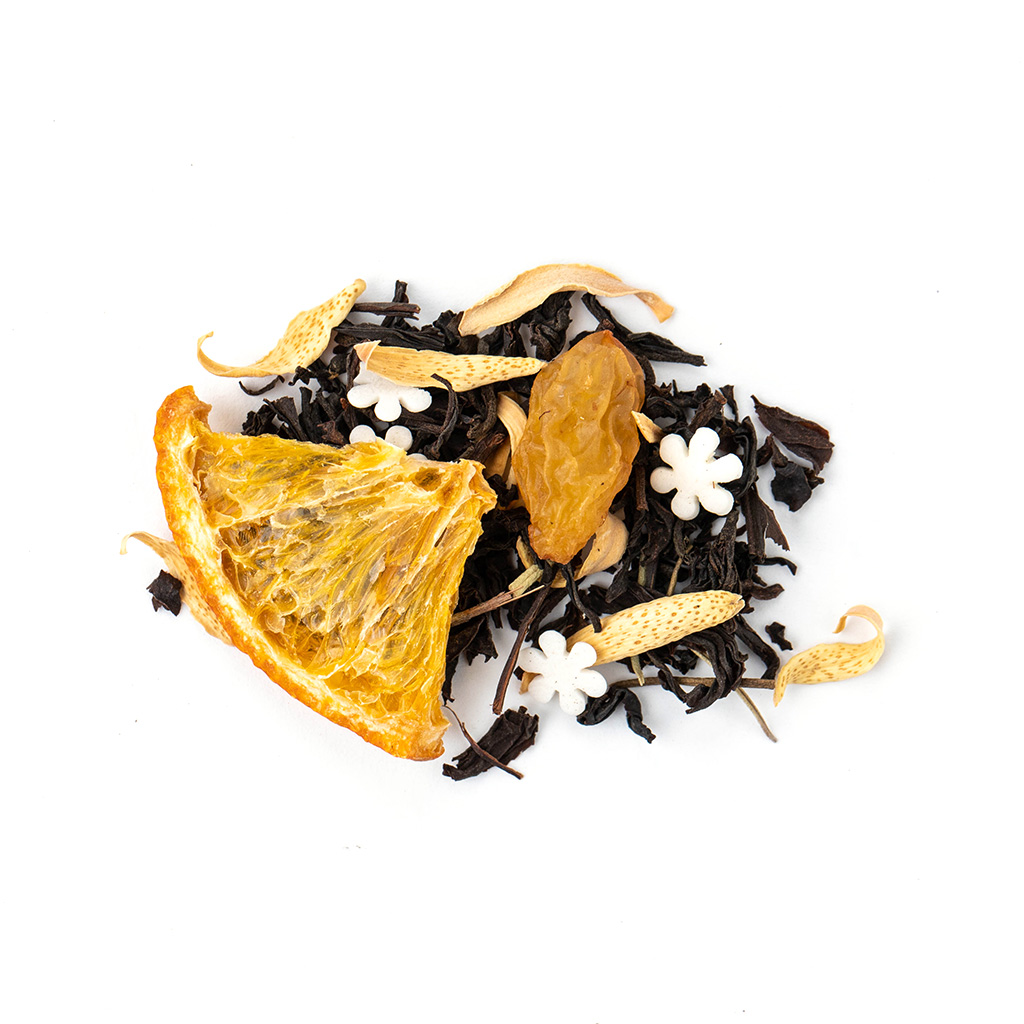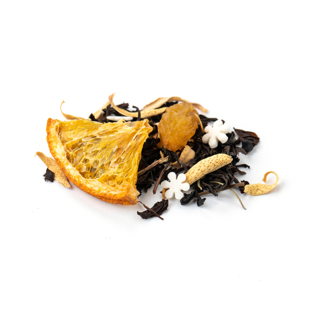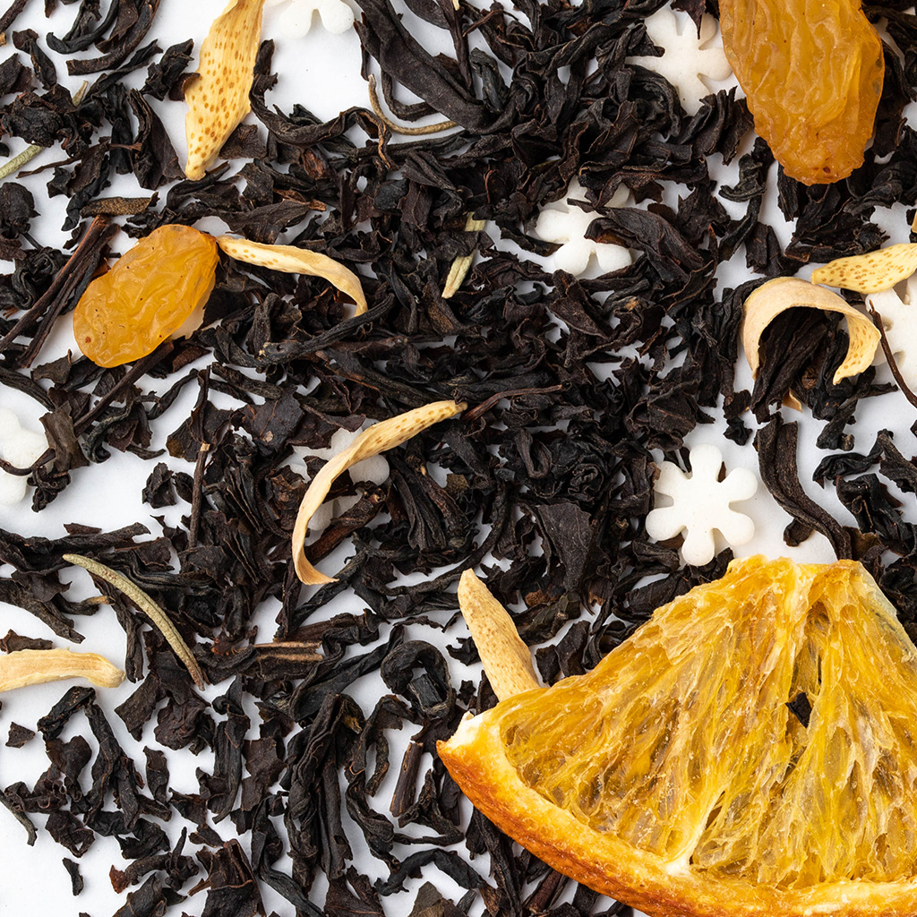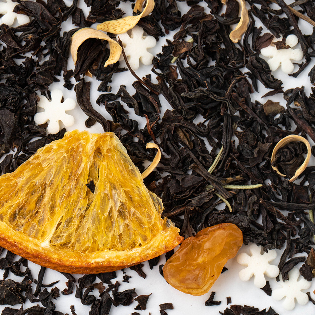 Состав: Чай черный индийский, изюм, посыпка кондитерская декоративная «Снежинки», апельсин сегмент, апельсин цветы, розмарин, аромат "Рождественская выпечка".