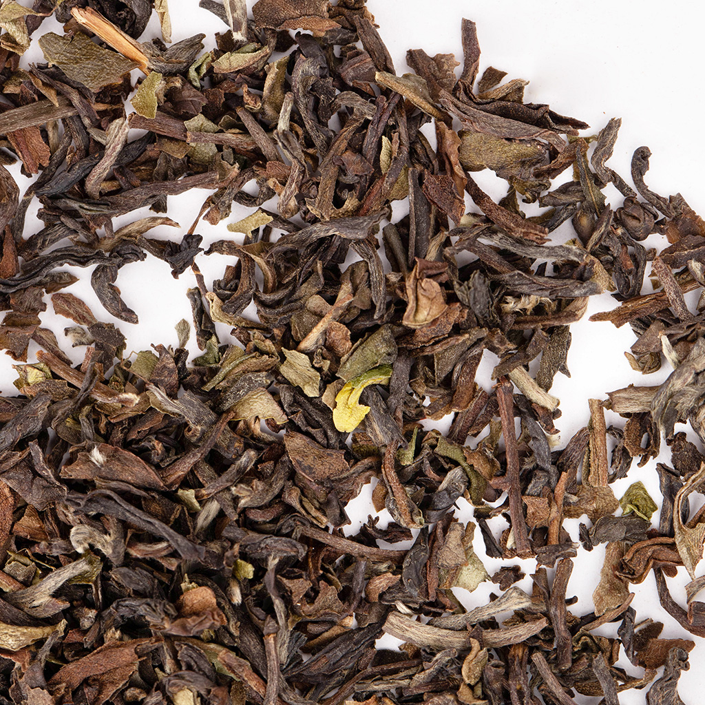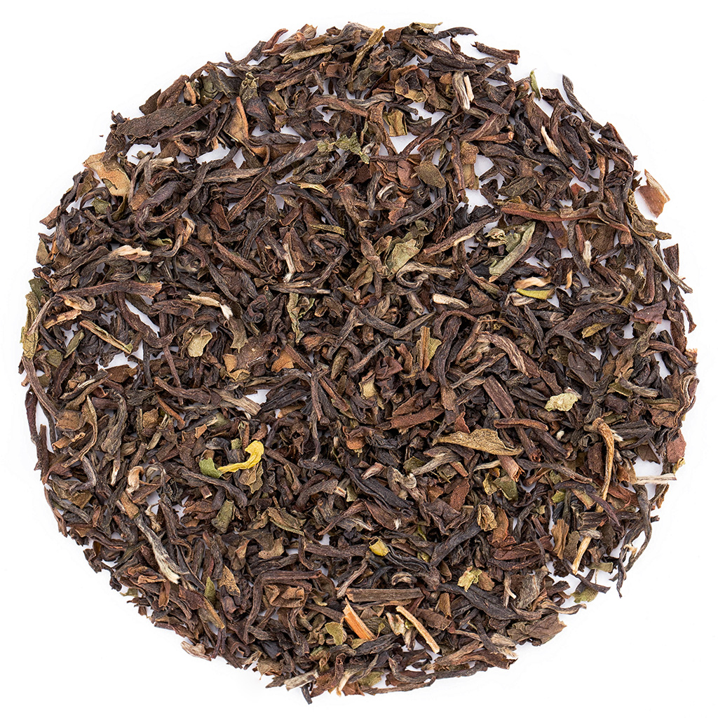 Сухая россыпь состоит из темного чайного листа легкой скрутки, разбавленного небольшим количеством зеленого листа и пушистых почек.