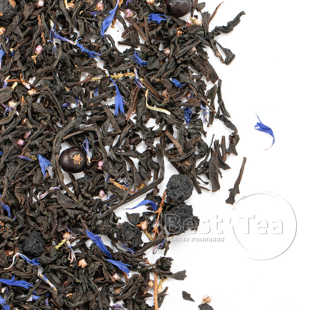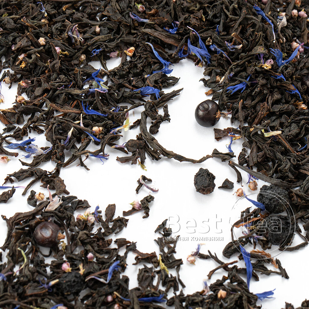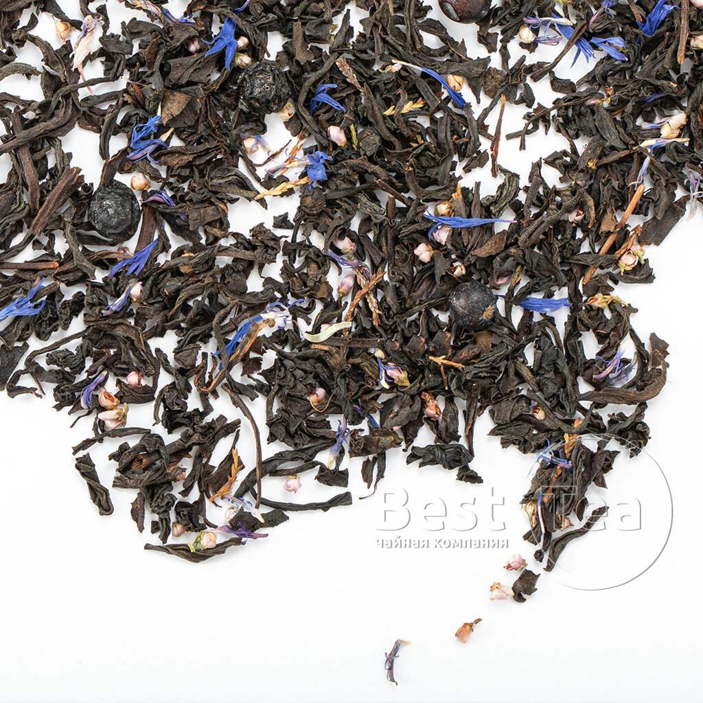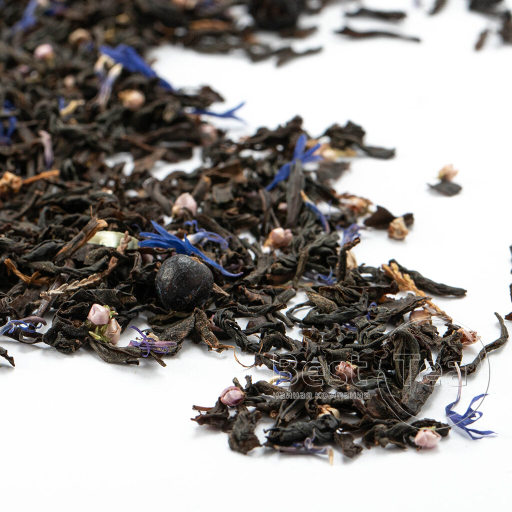 Состав: чай черный индийский, плоды аронии, плоды можжевельника, плоды черемухи, цветы вереска, василек синий, аромат малины, аромат брусники