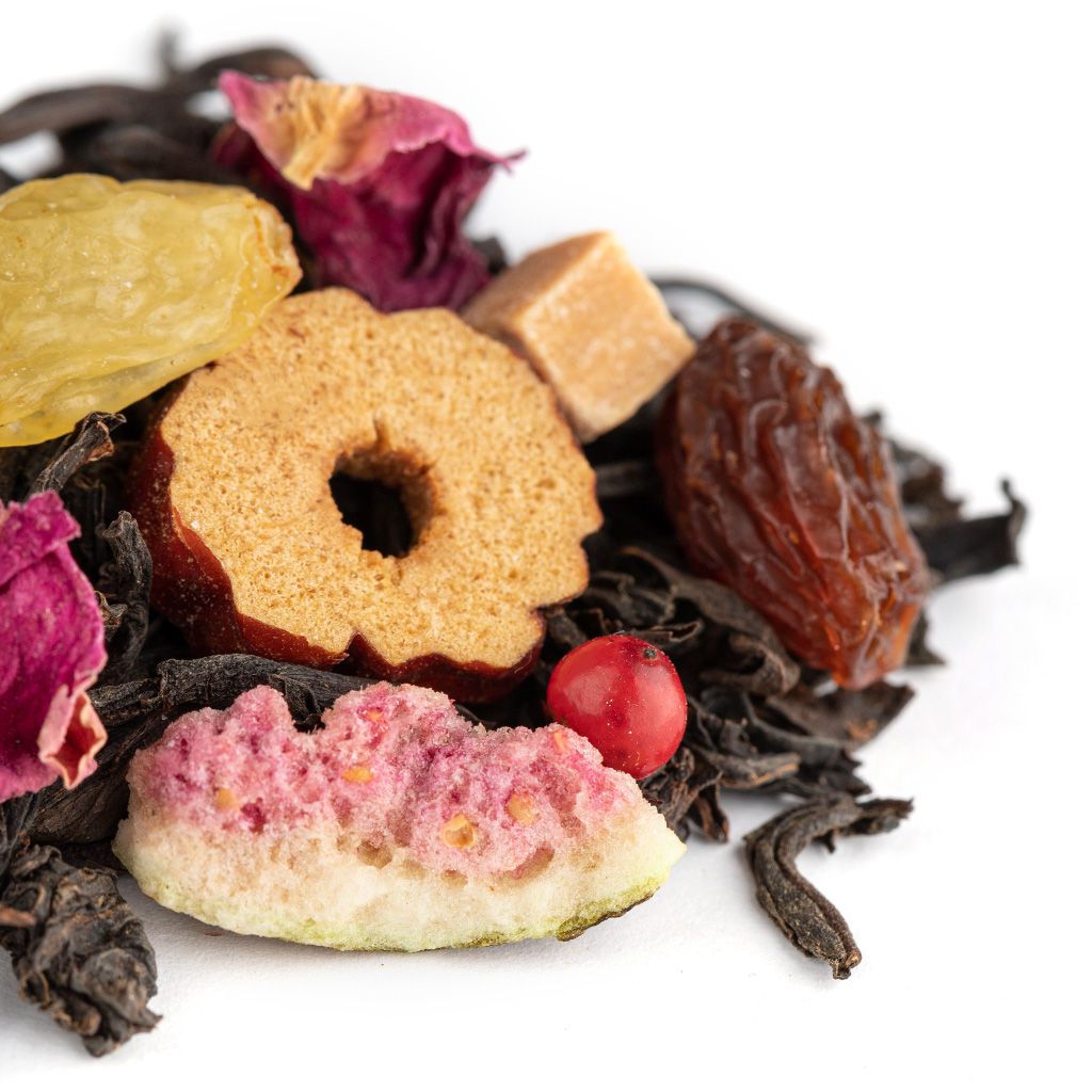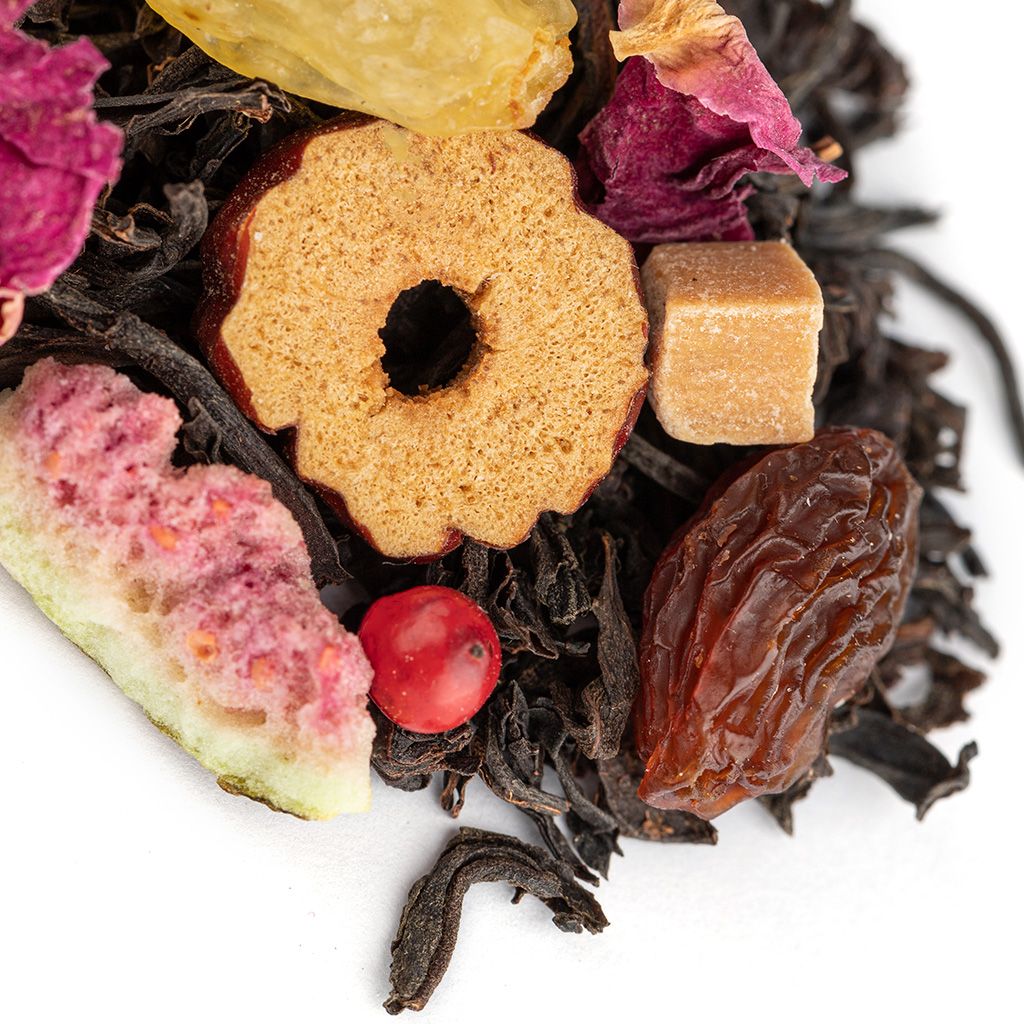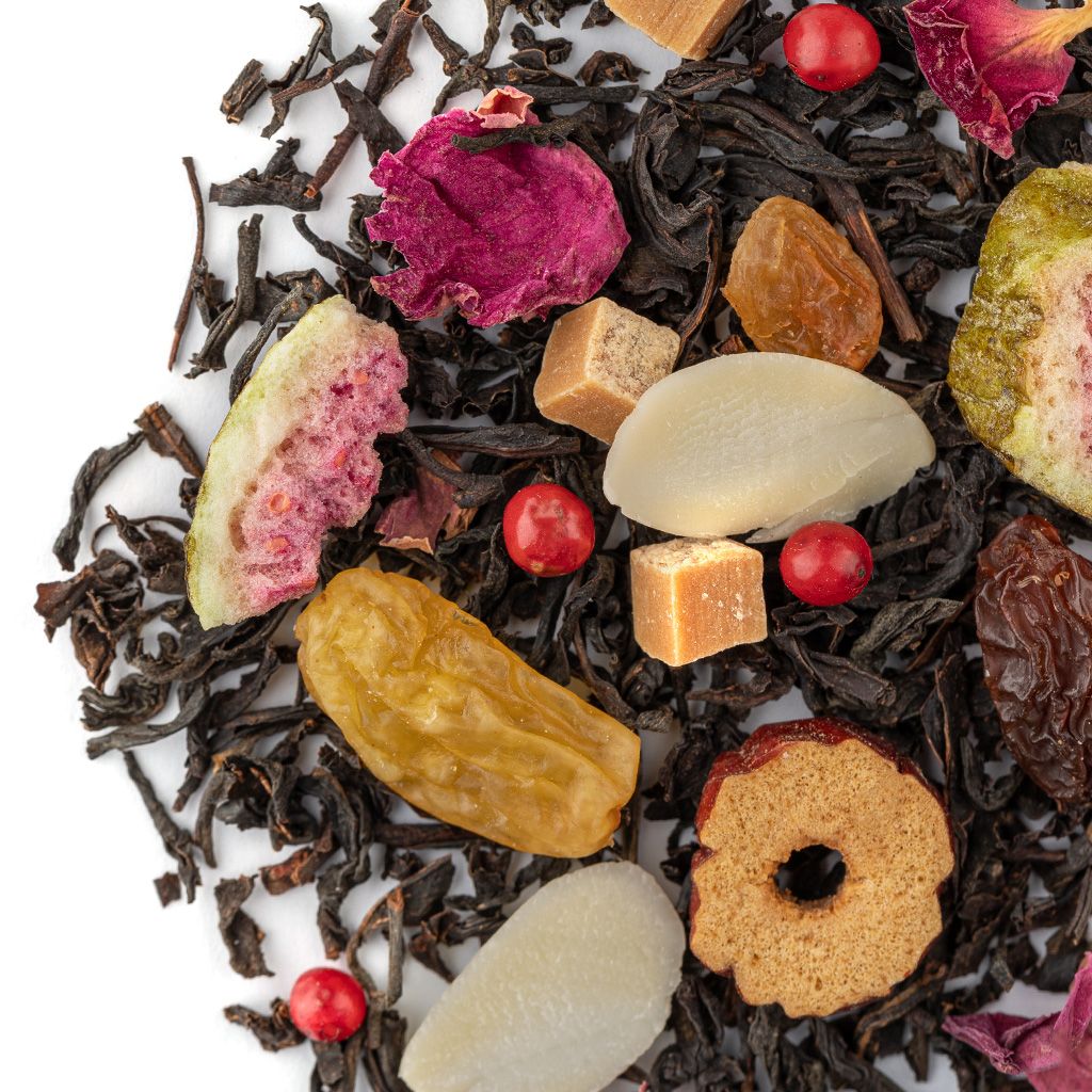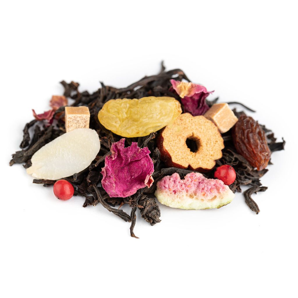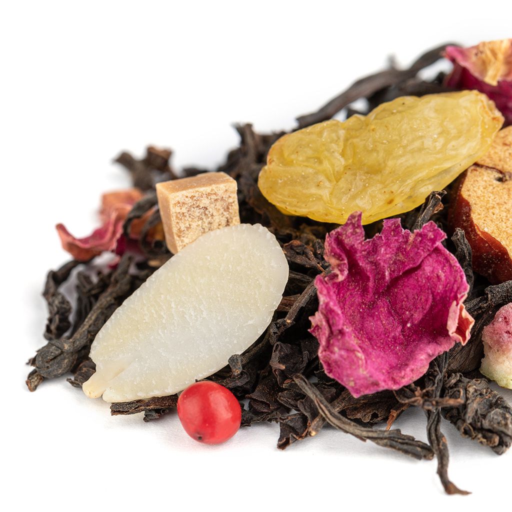 Чай черный индийский, изюм, карамель кусочки, инжир, миндаль лепестки, финик, роза лепестки, перец розовый, аромат "Восточные сладости".
