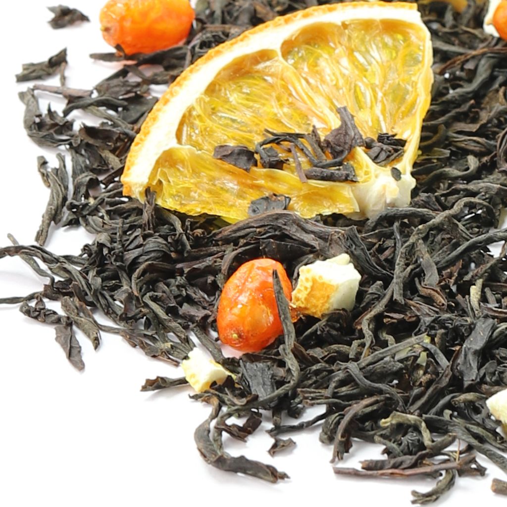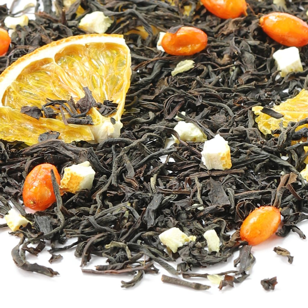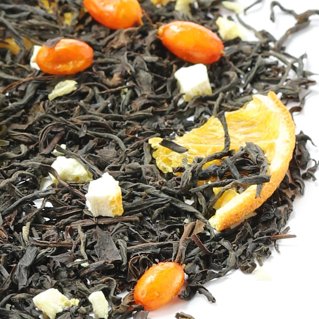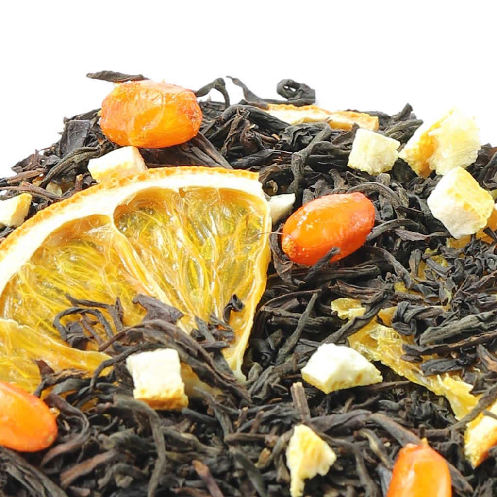 Чай черный, сегменты апельсина, ягоды облепихи, кусочки апельсина с цедрой, аромат "Сочный цитрус".