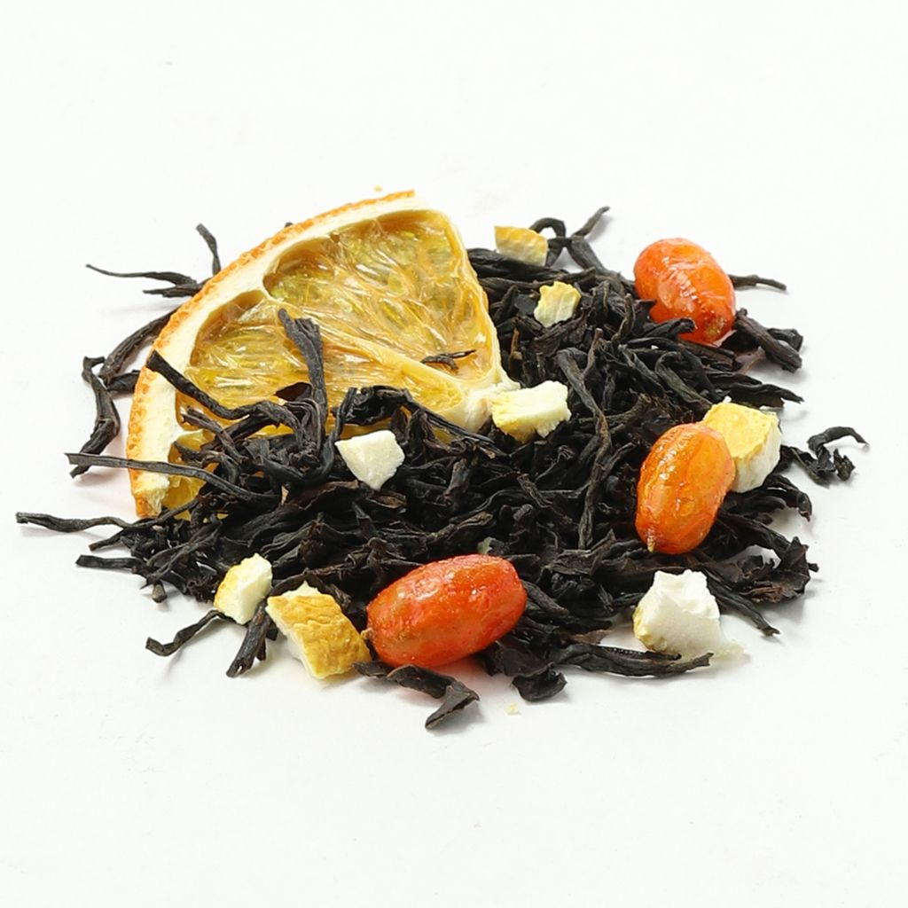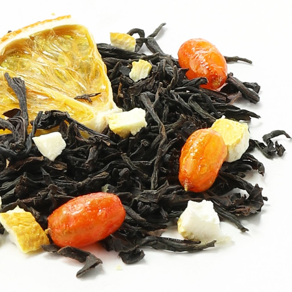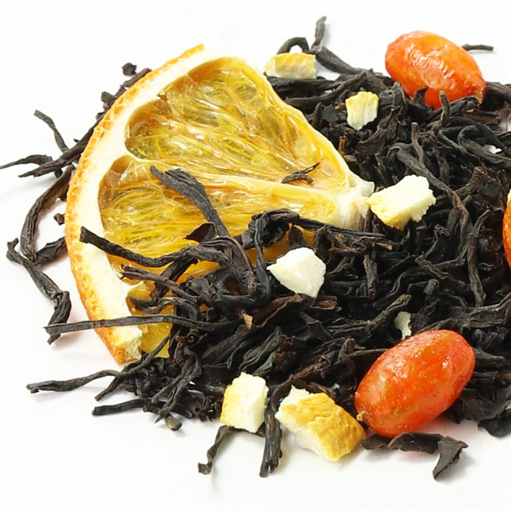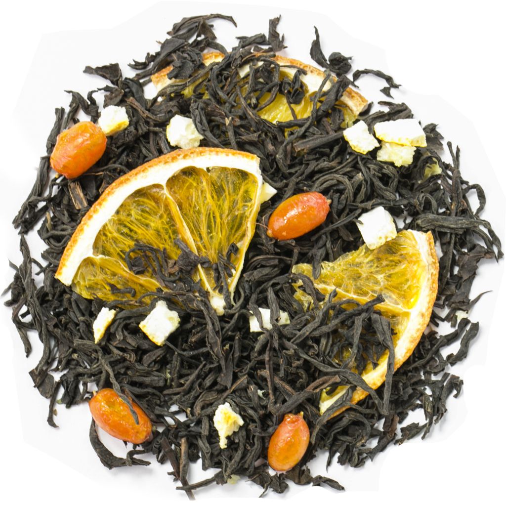 Чай черный, сегменты апельсина, ягоды облепихи, кусочки апельсина с цедрой, аромат "Сочный цитрус".