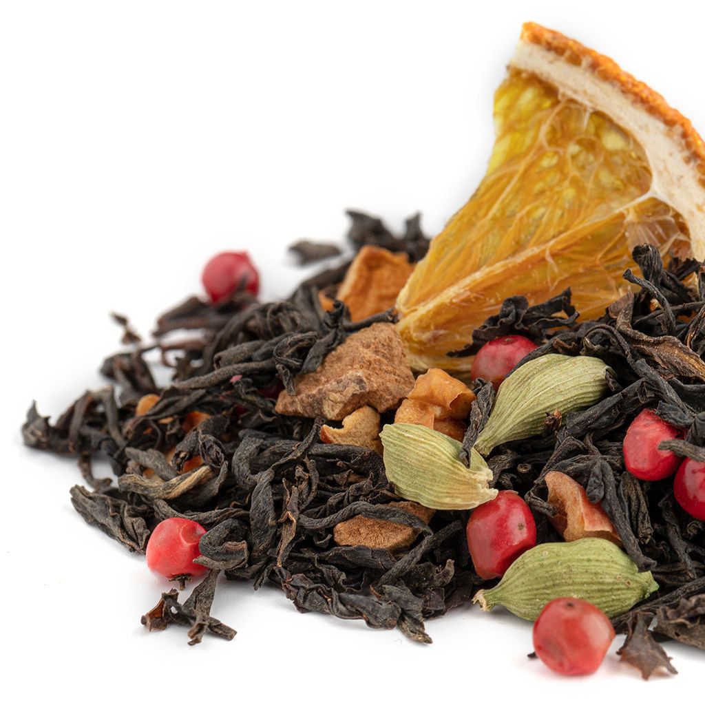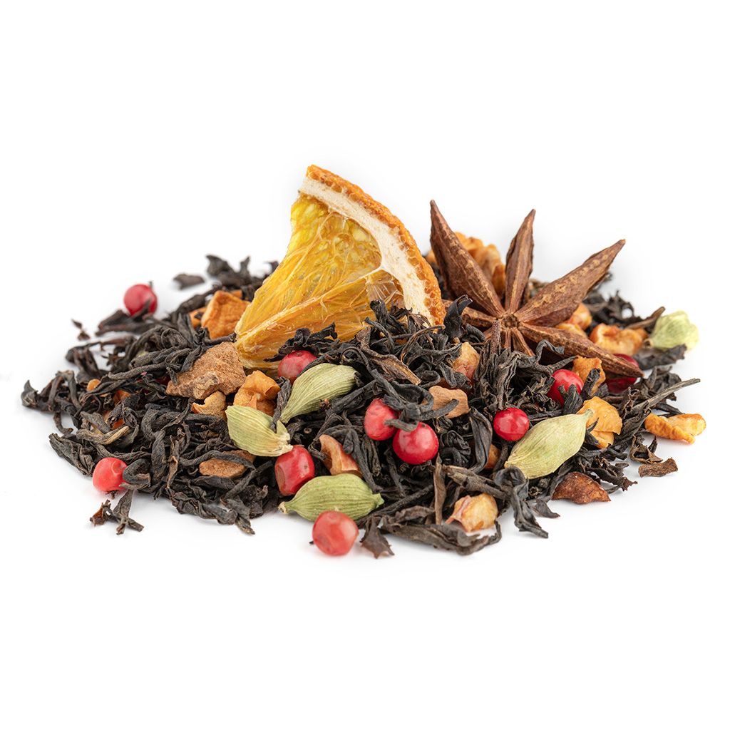 Состав: чай черный индийский, яблоко кусочки, апельсин сегмент, бадьян, кардамон плоды, корица кусочки, перец розовый, аромат Восточные пряности.