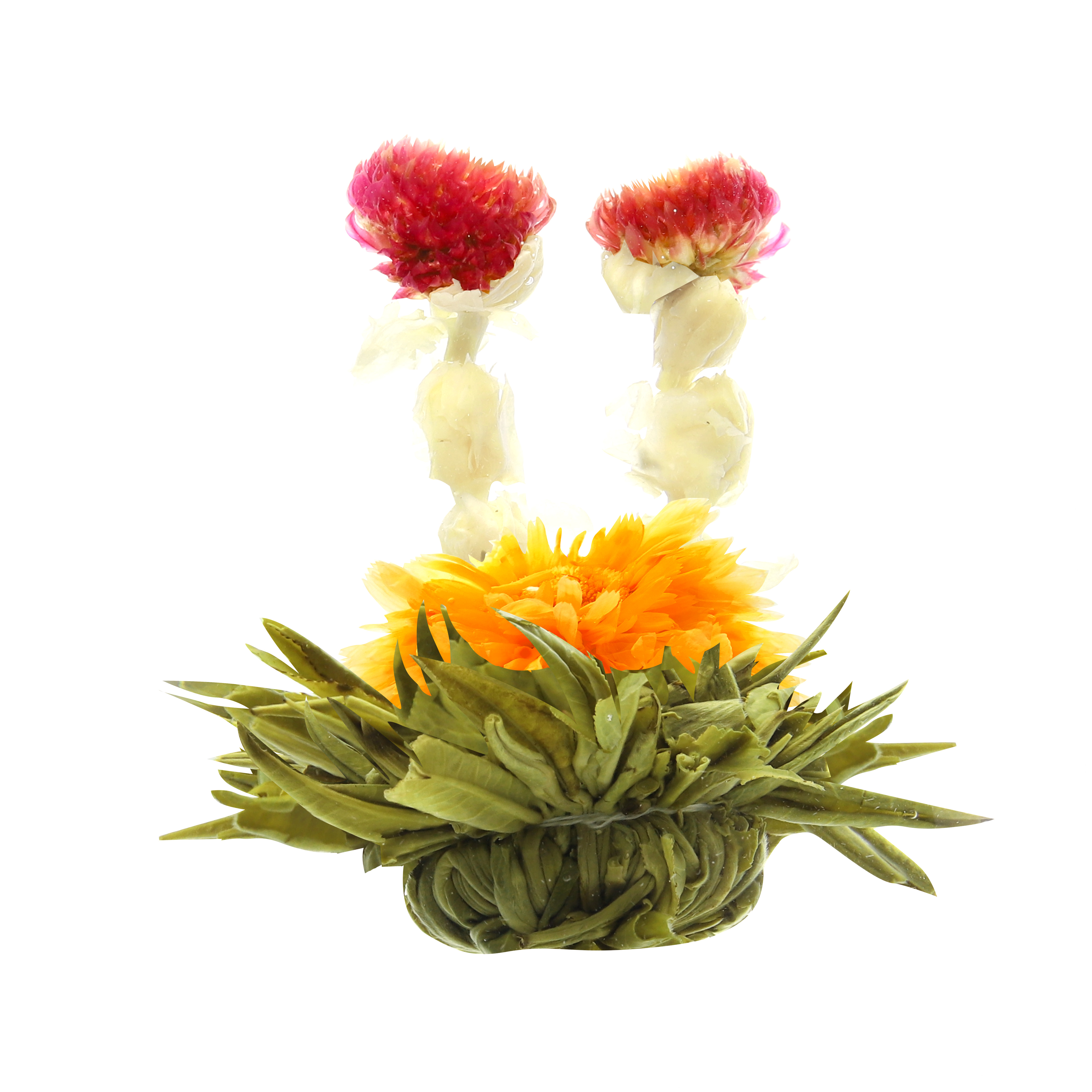 В процессе заваривания связанный из длинных и тонких чайных листочков бутон распускается красивым цветочным букетом, плавающим в воде причудливой цветочной композицией. Тонизирует, освежает в жаркий день и хорошо утоляет жажду, дарит «заряд» бодрости.