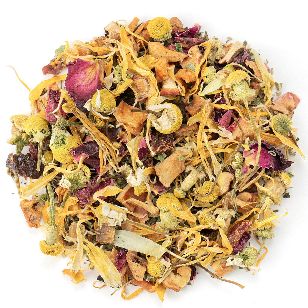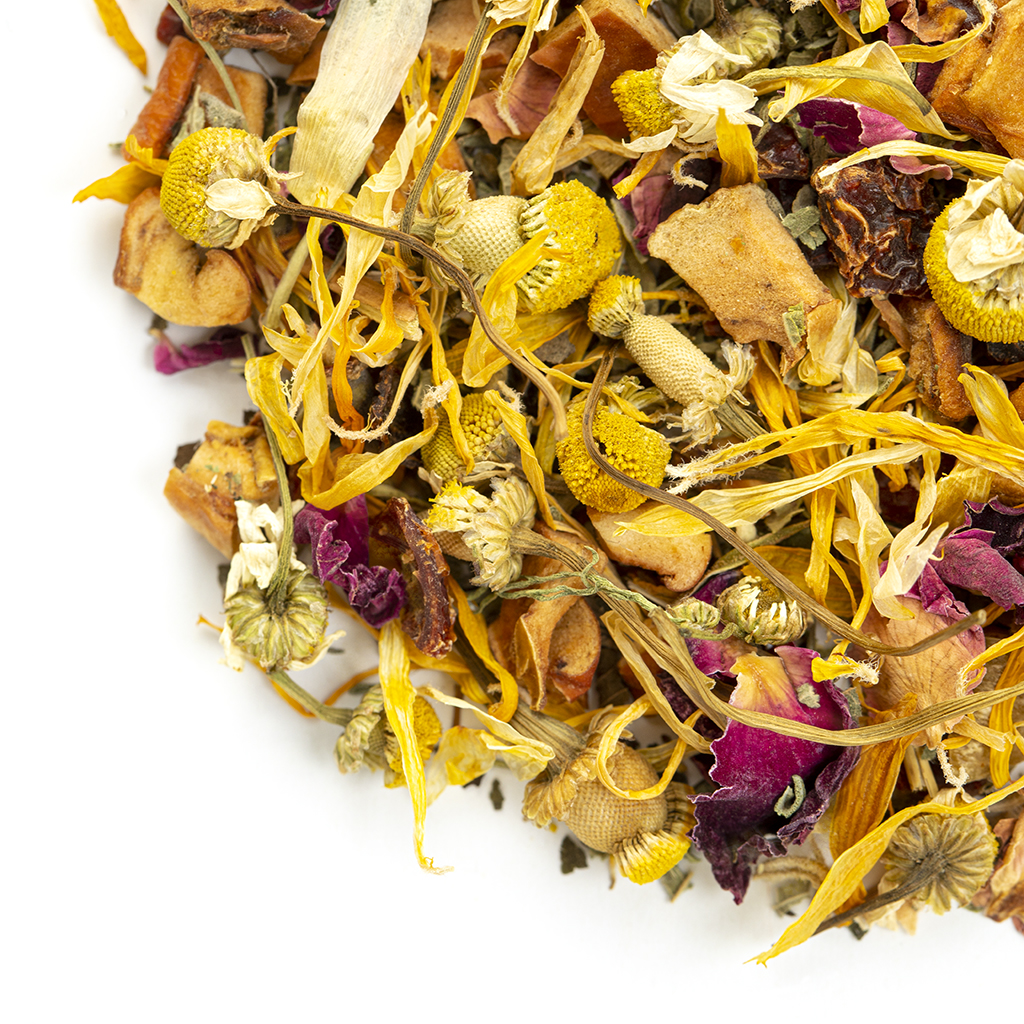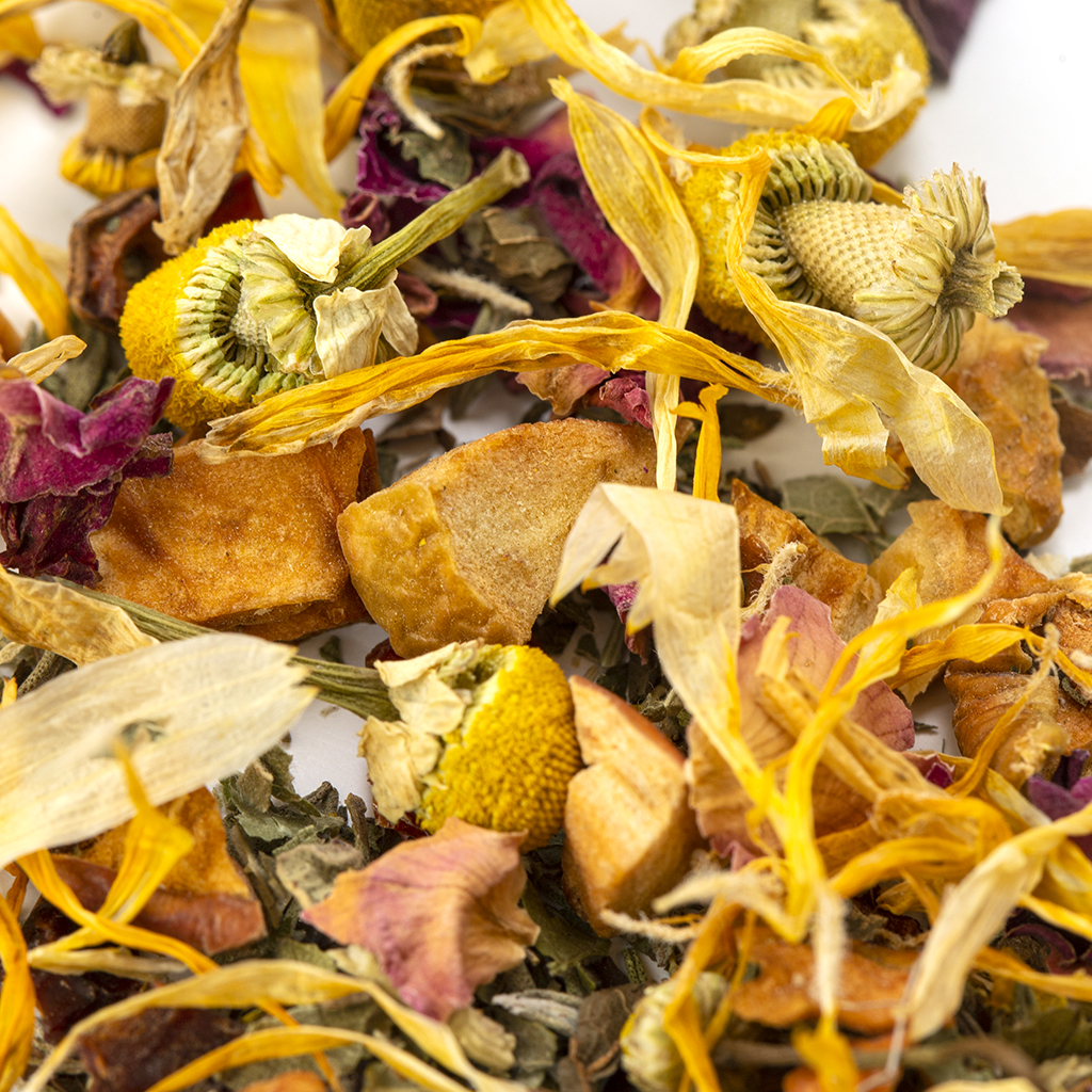 Состав: яблоко, шиповник, лист ежевики, чабрец, мелисса, цветы ромашки, лепестки красной розы, лепестки календулы