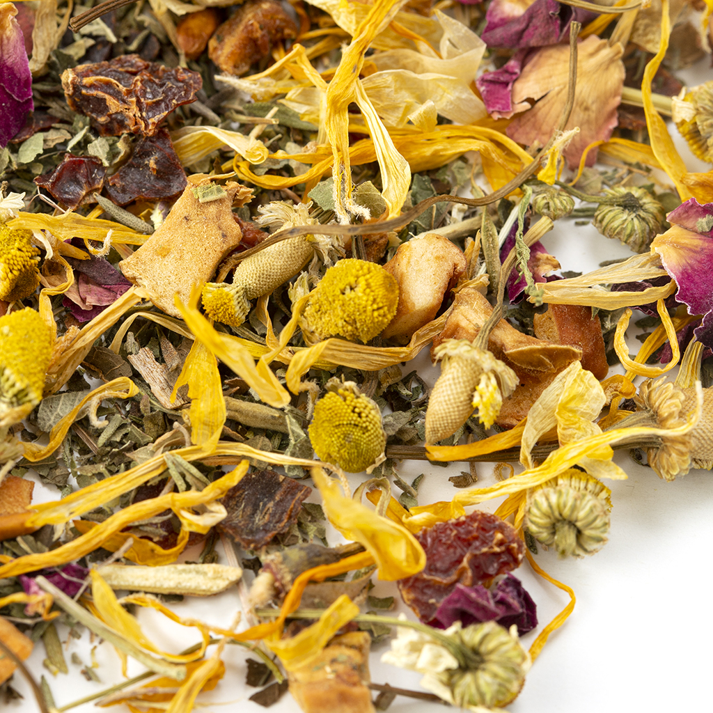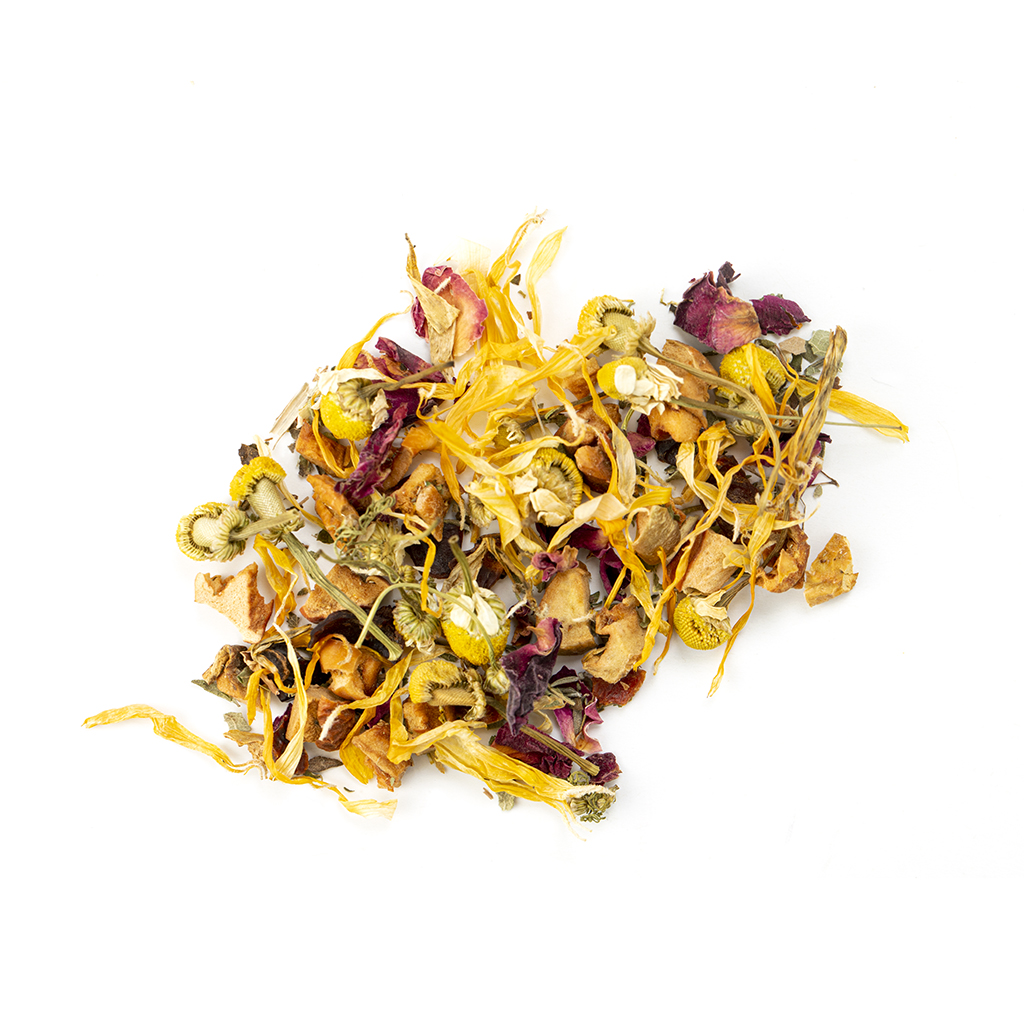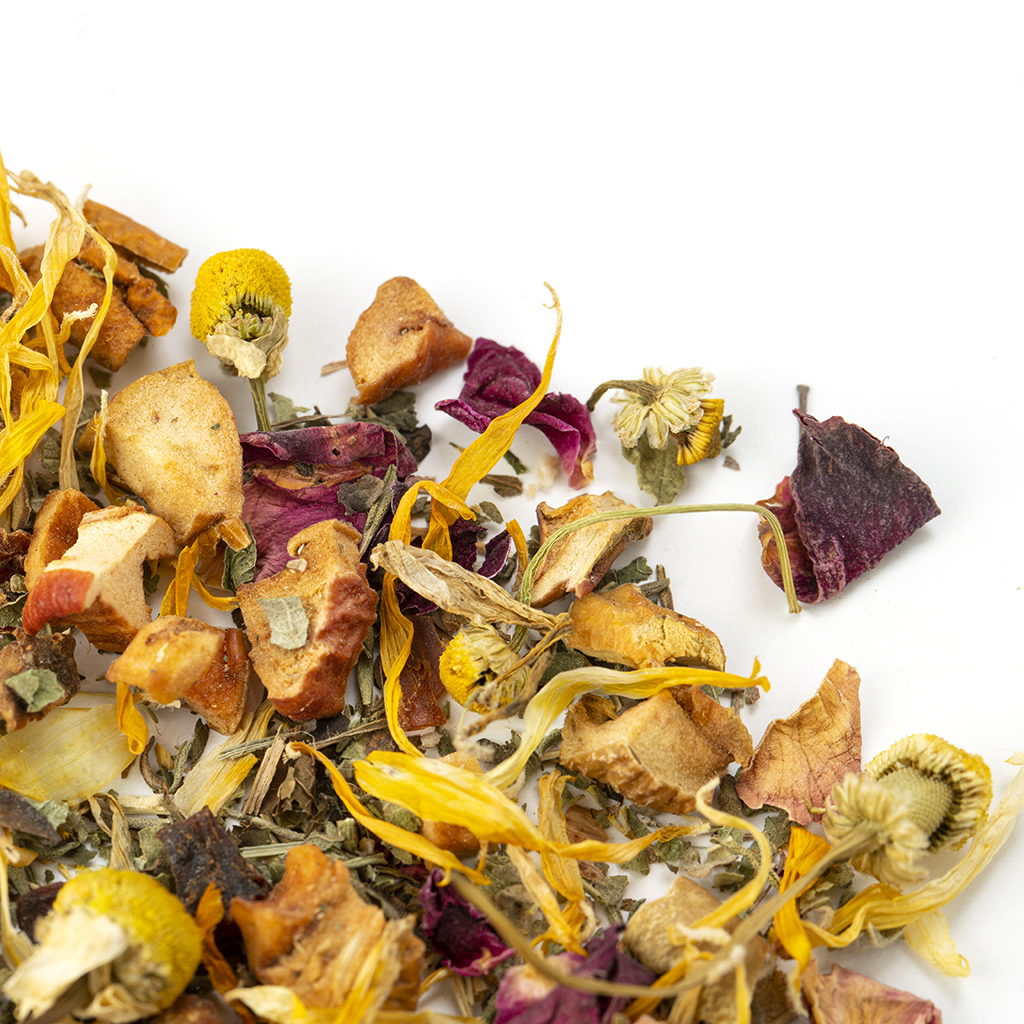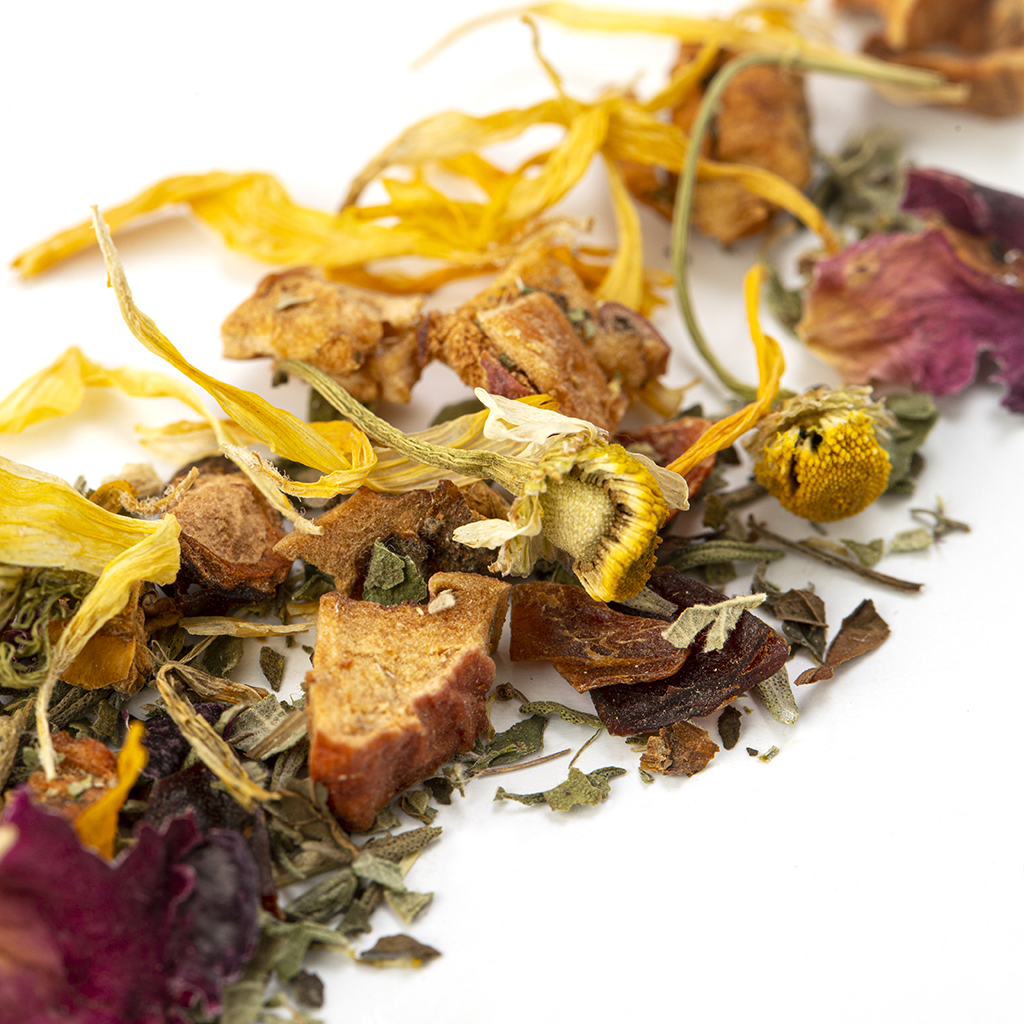 Состав: яблоко, шиповник, лист ежевики, чабрец, мелисса, цветы ромашки, лепестки красной розы, лепестки календулы