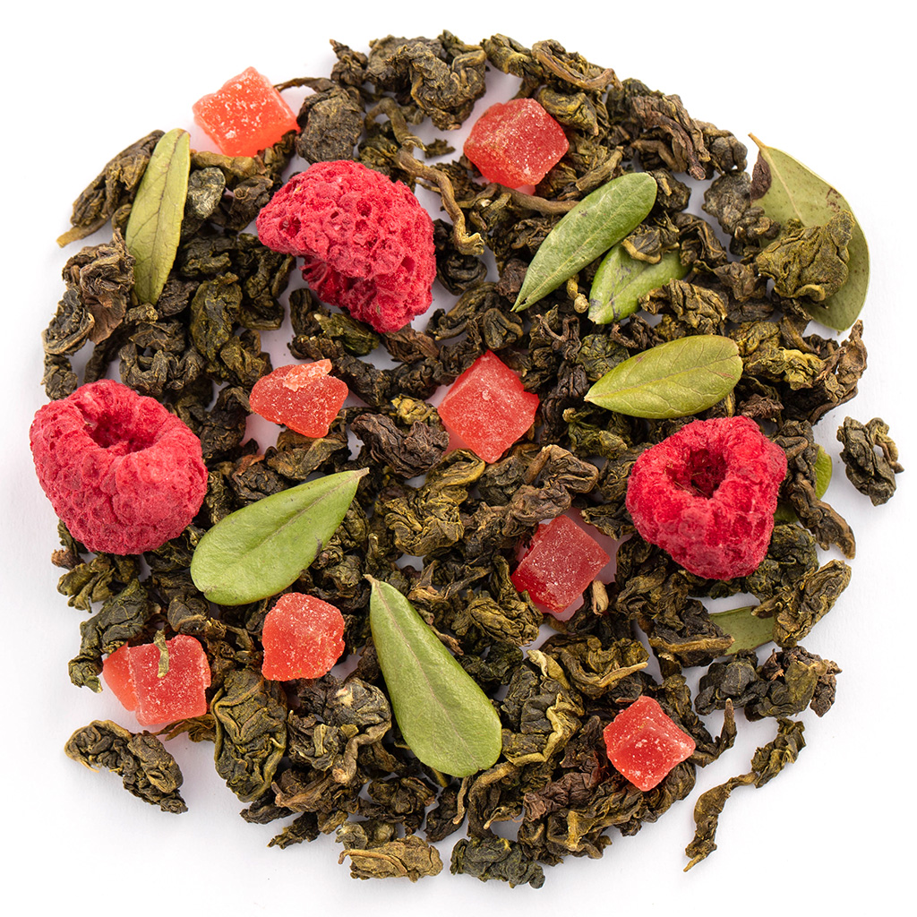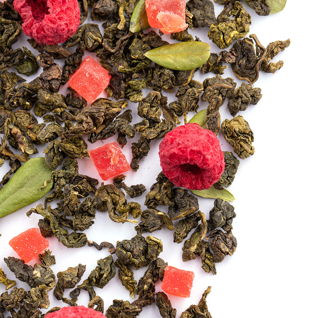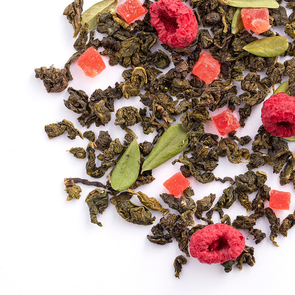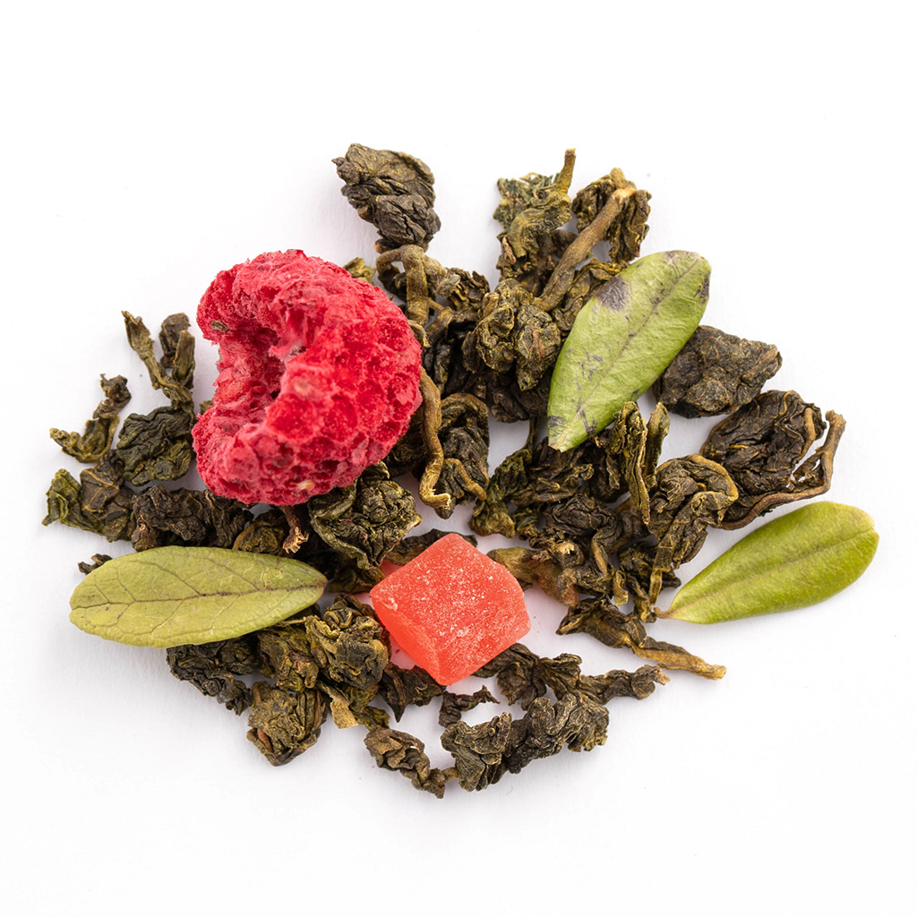 Состав: чай улун китайский, цукаты ананаса, ягоды малины, листья брусники, аромат малинового сорбета