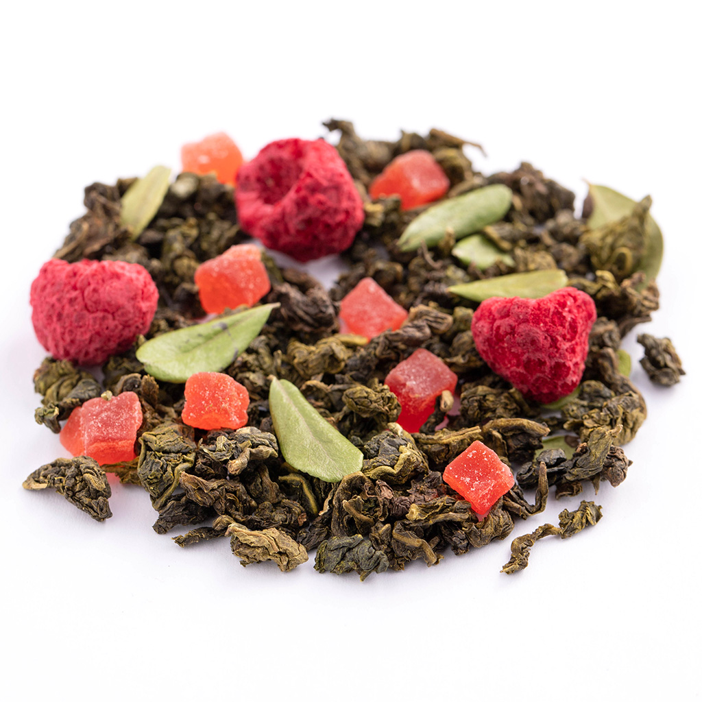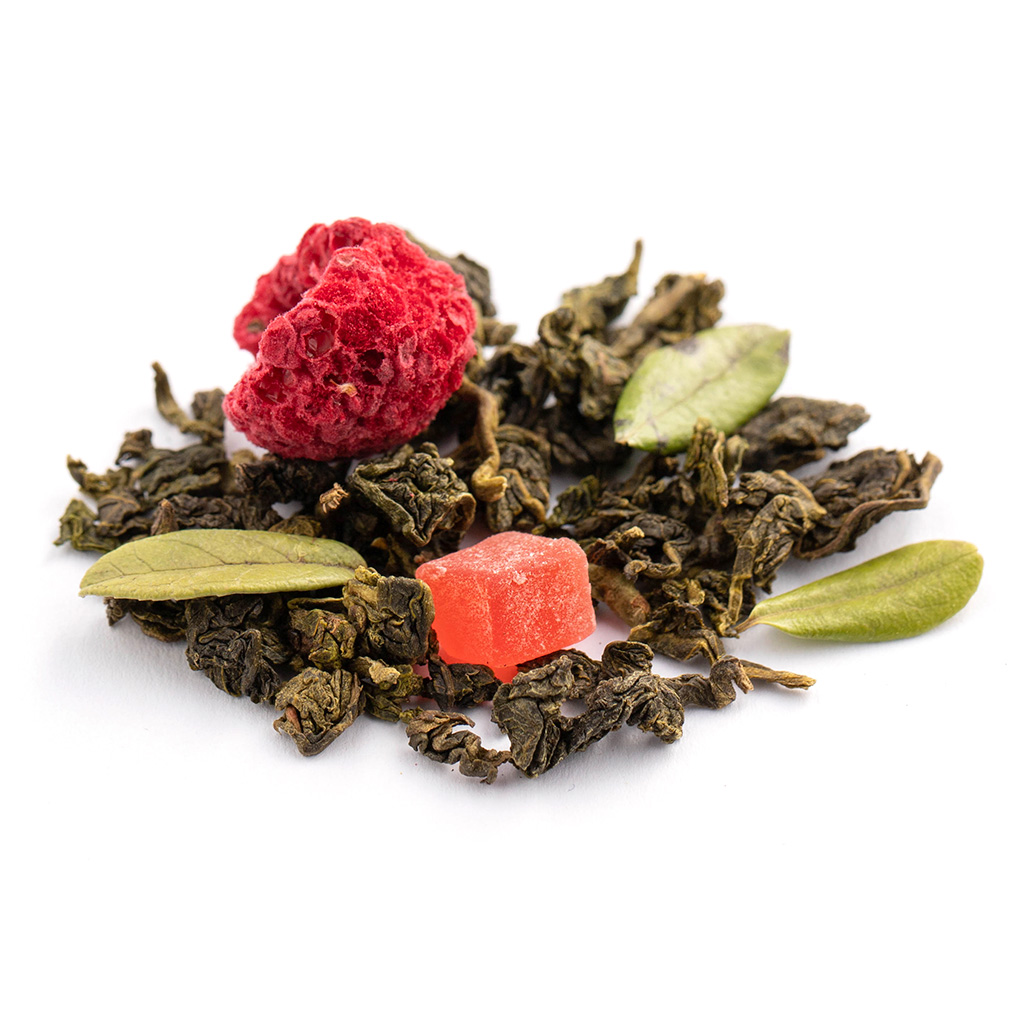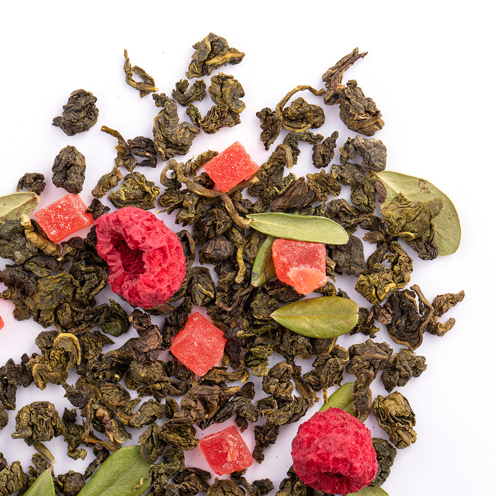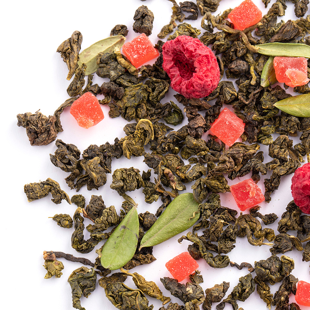 Состав: чай улун китайский, цукаты ананаса, ягоды малины, листья брусники, аромат малинового сорбета