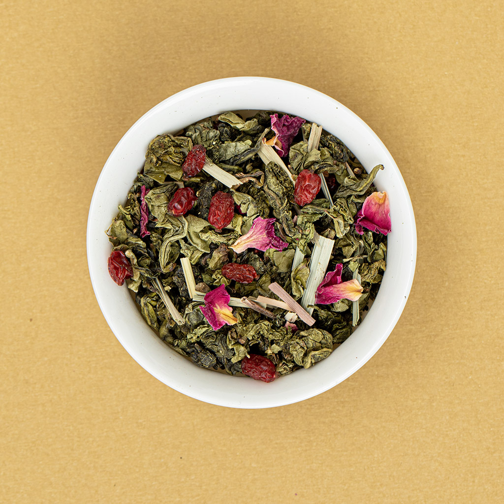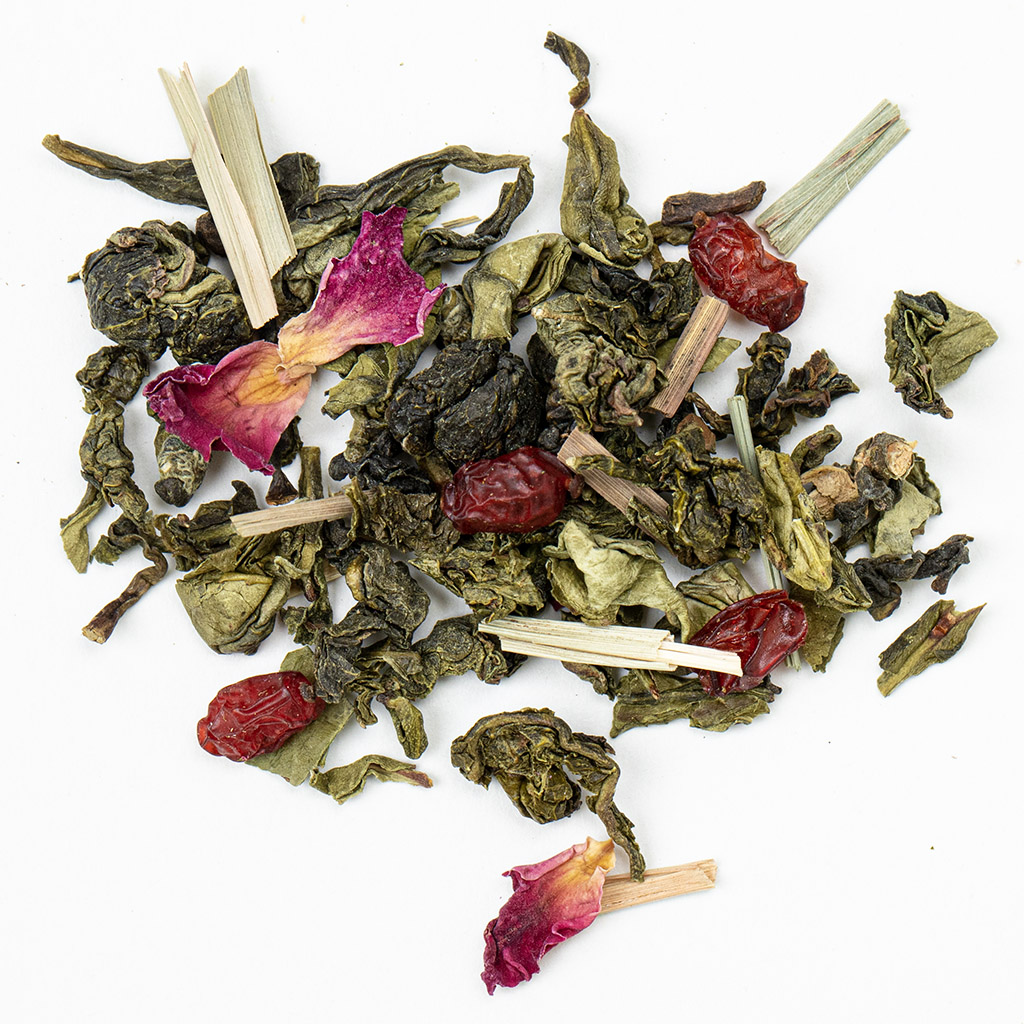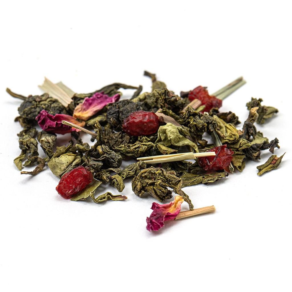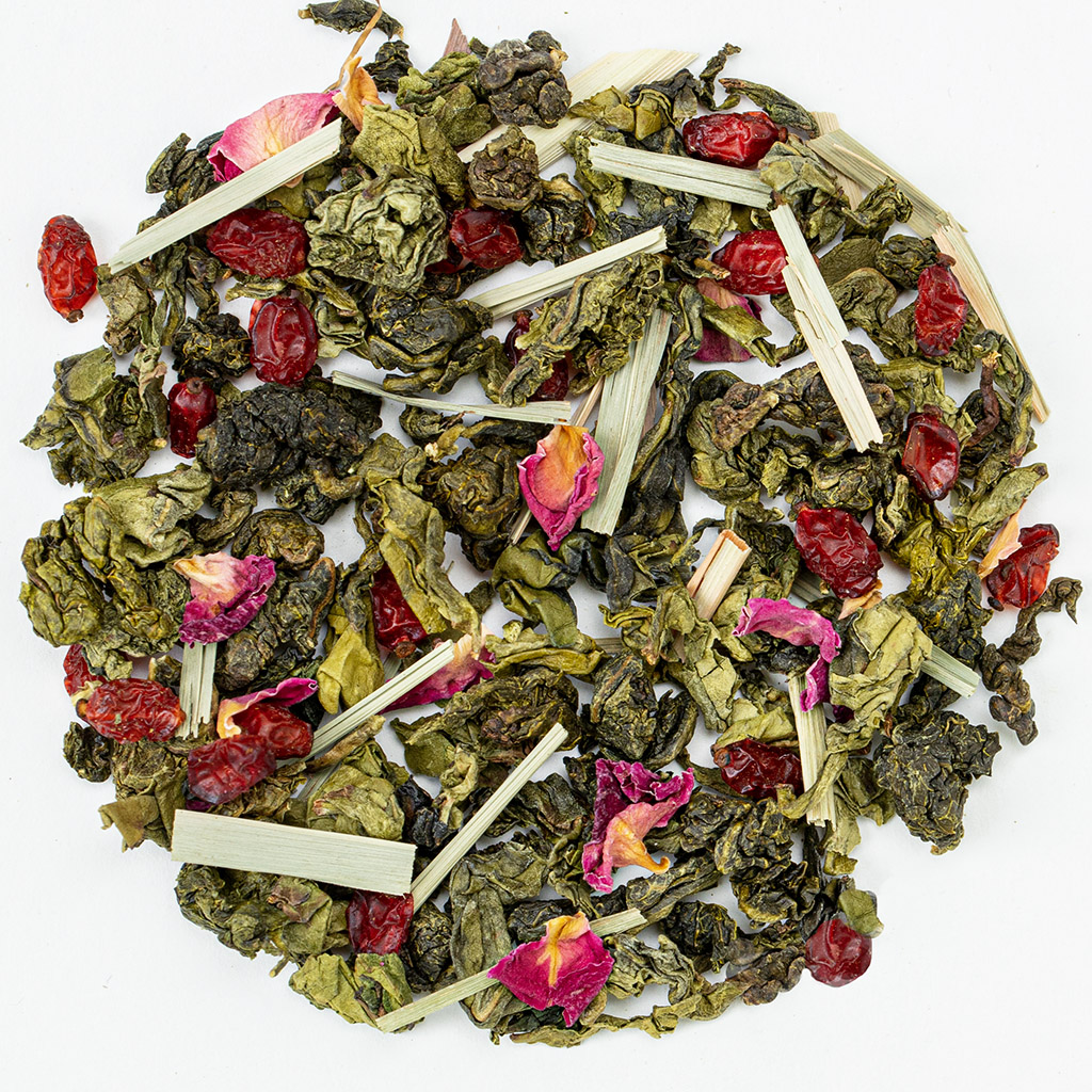 Состав: чай улун китайский, барбарис плоды, лимонная трава, роза лепестки, аромат сладких ягод