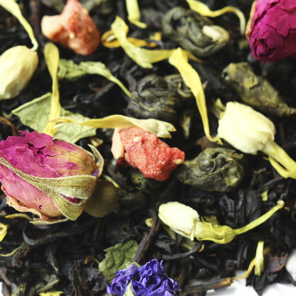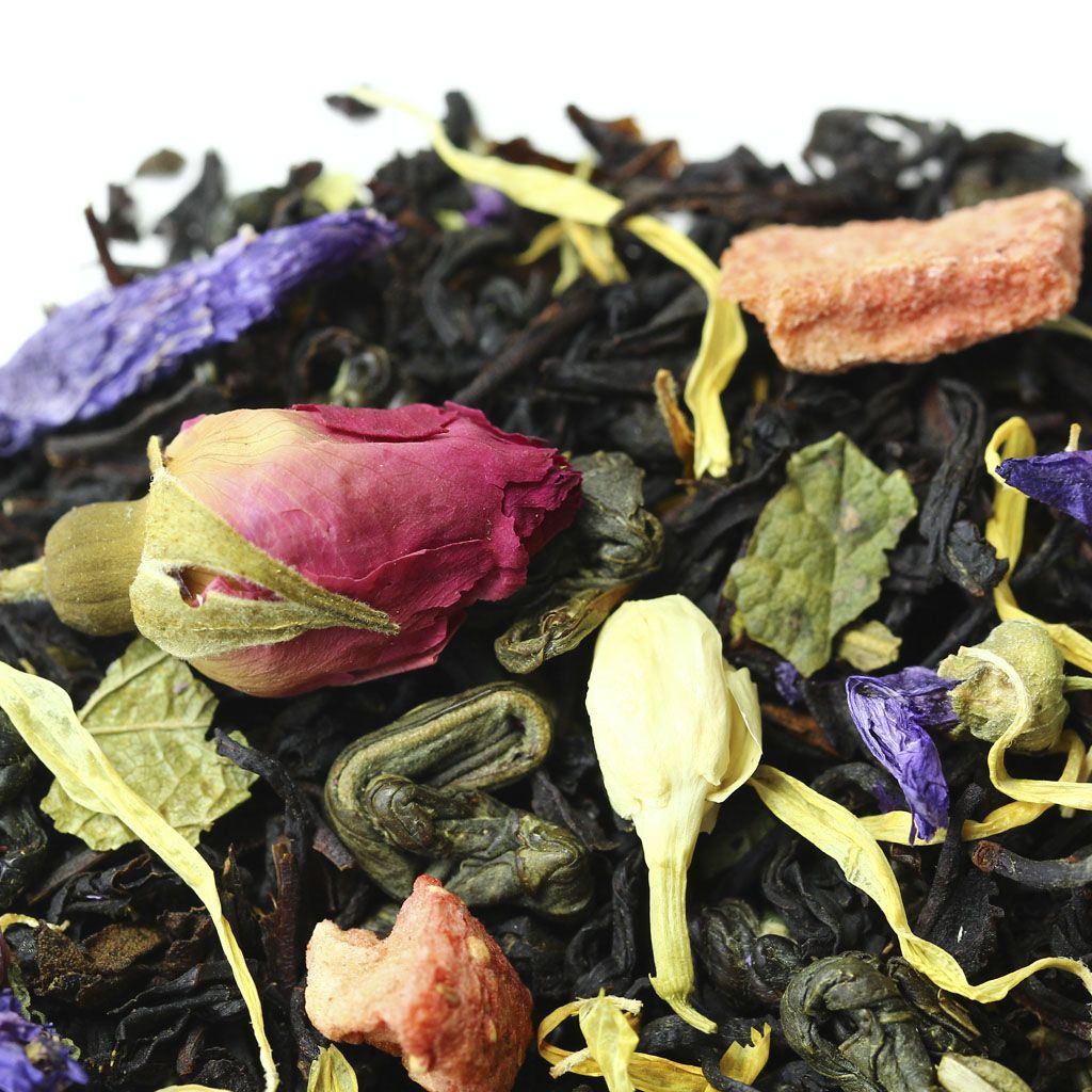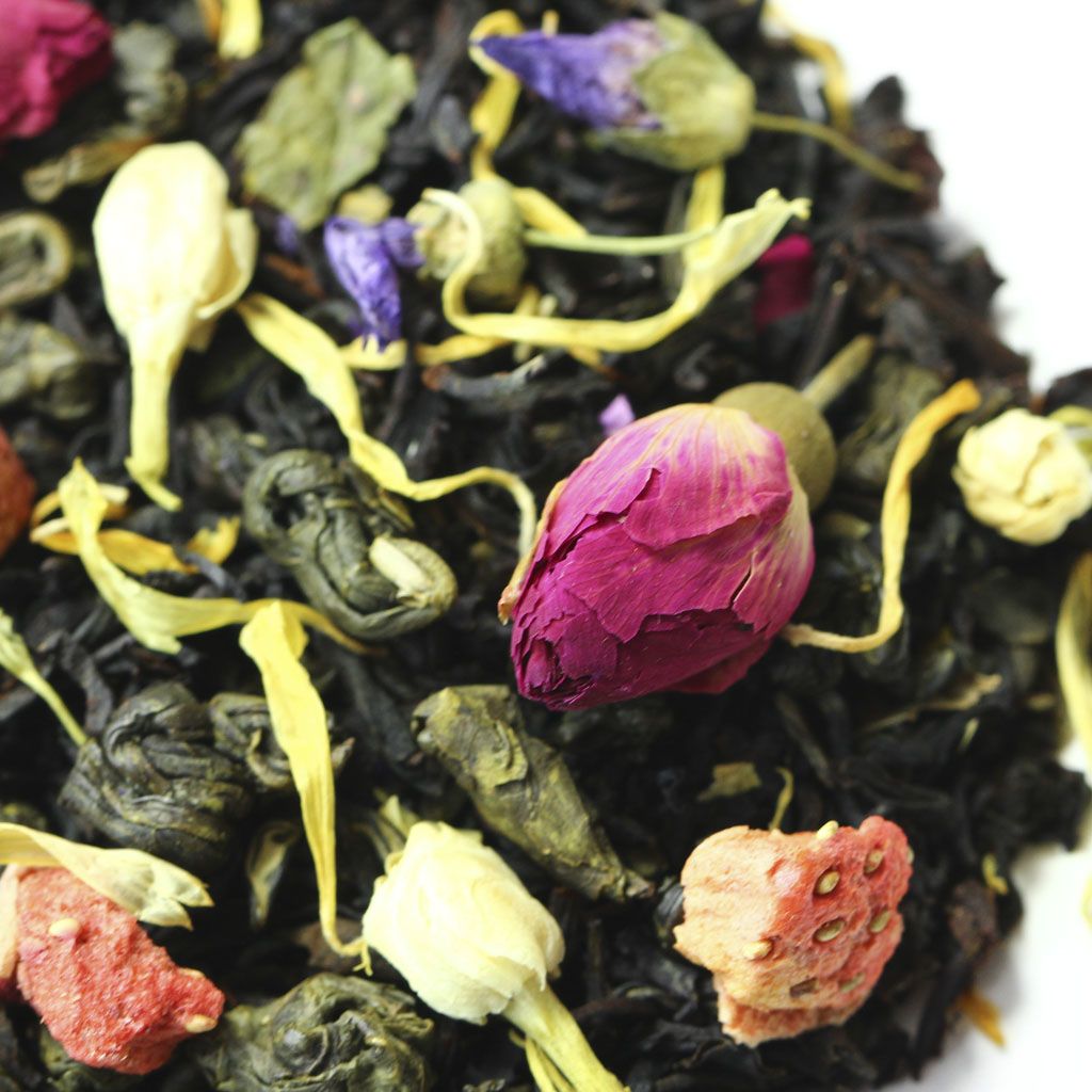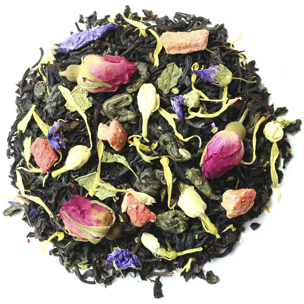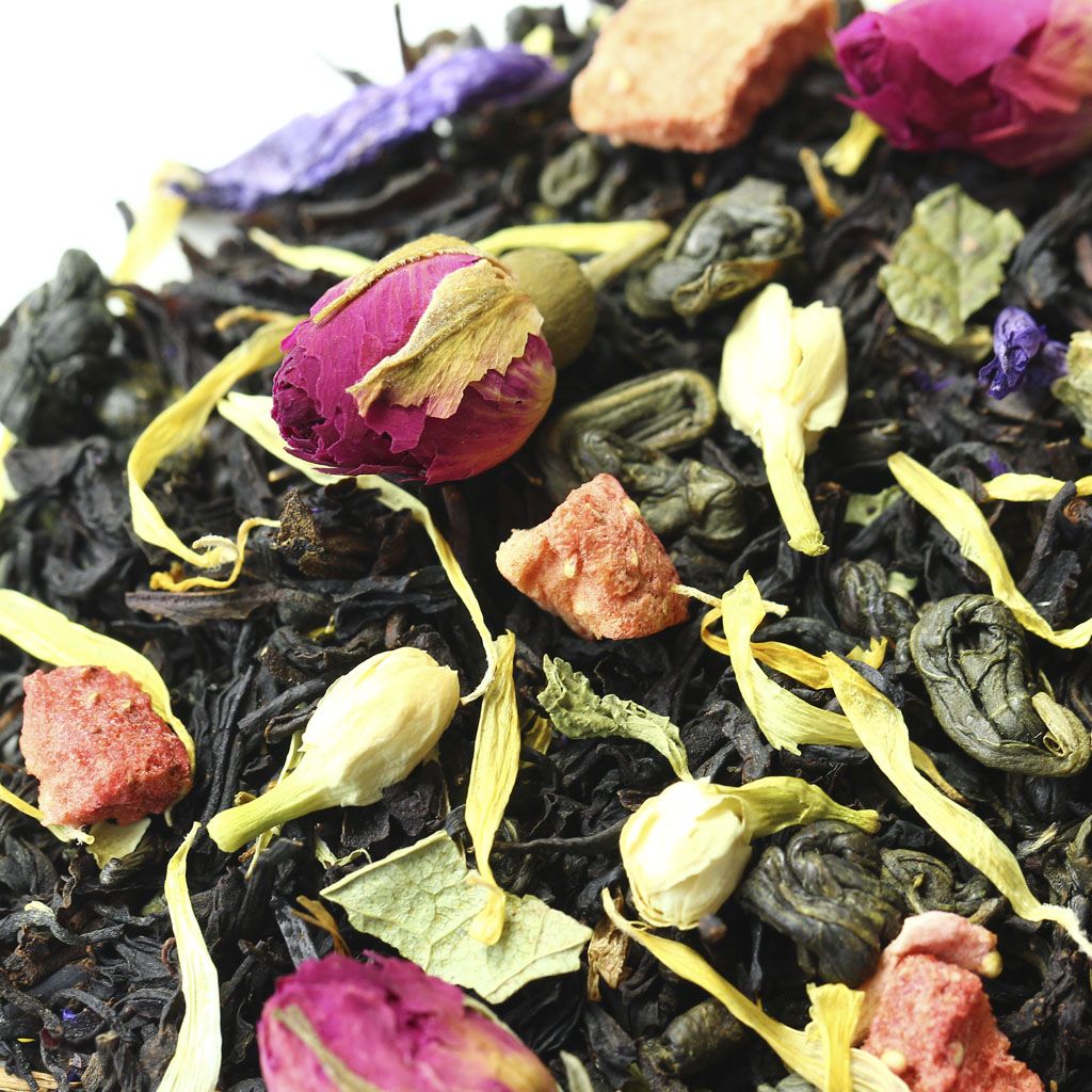 Значительный список компонентов наполняет напиток своим звучанием. Это смесь черных китайского и индийского чая и зеленого чая с жасмином, бутоны красной розы, цветы жасмина, лепестки календулы и синего василька, кусочков клубники, листья смородины.