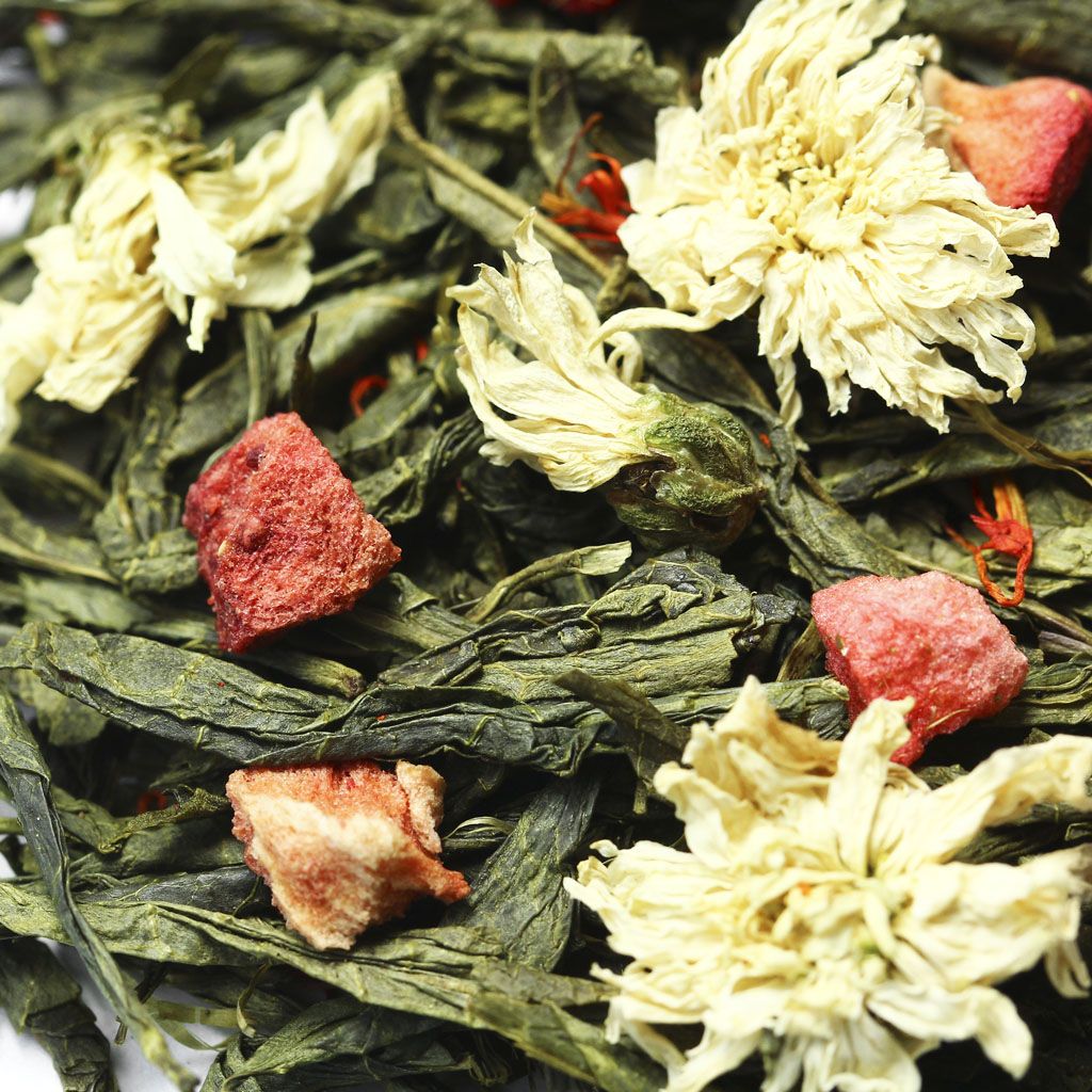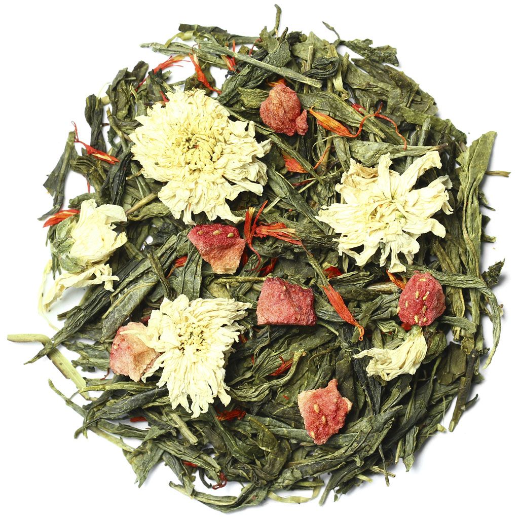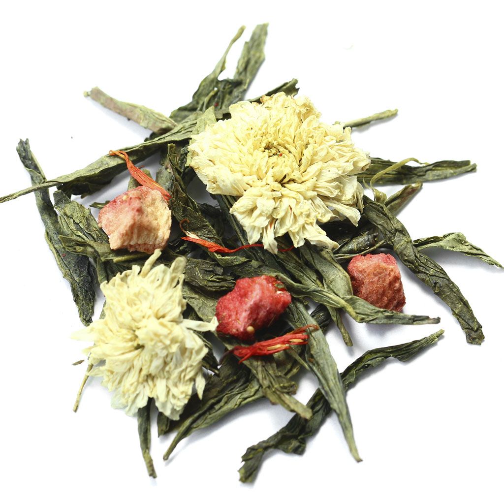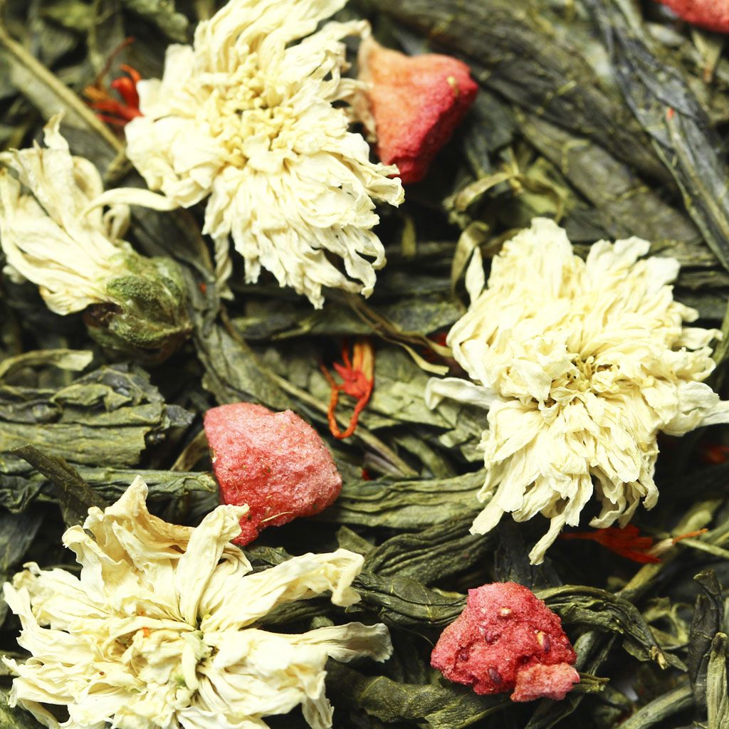 Неповторимый купаж на основе зеленого китайского чая, пленяющий крупными цветками белой хризантемы и кусочками клубники.