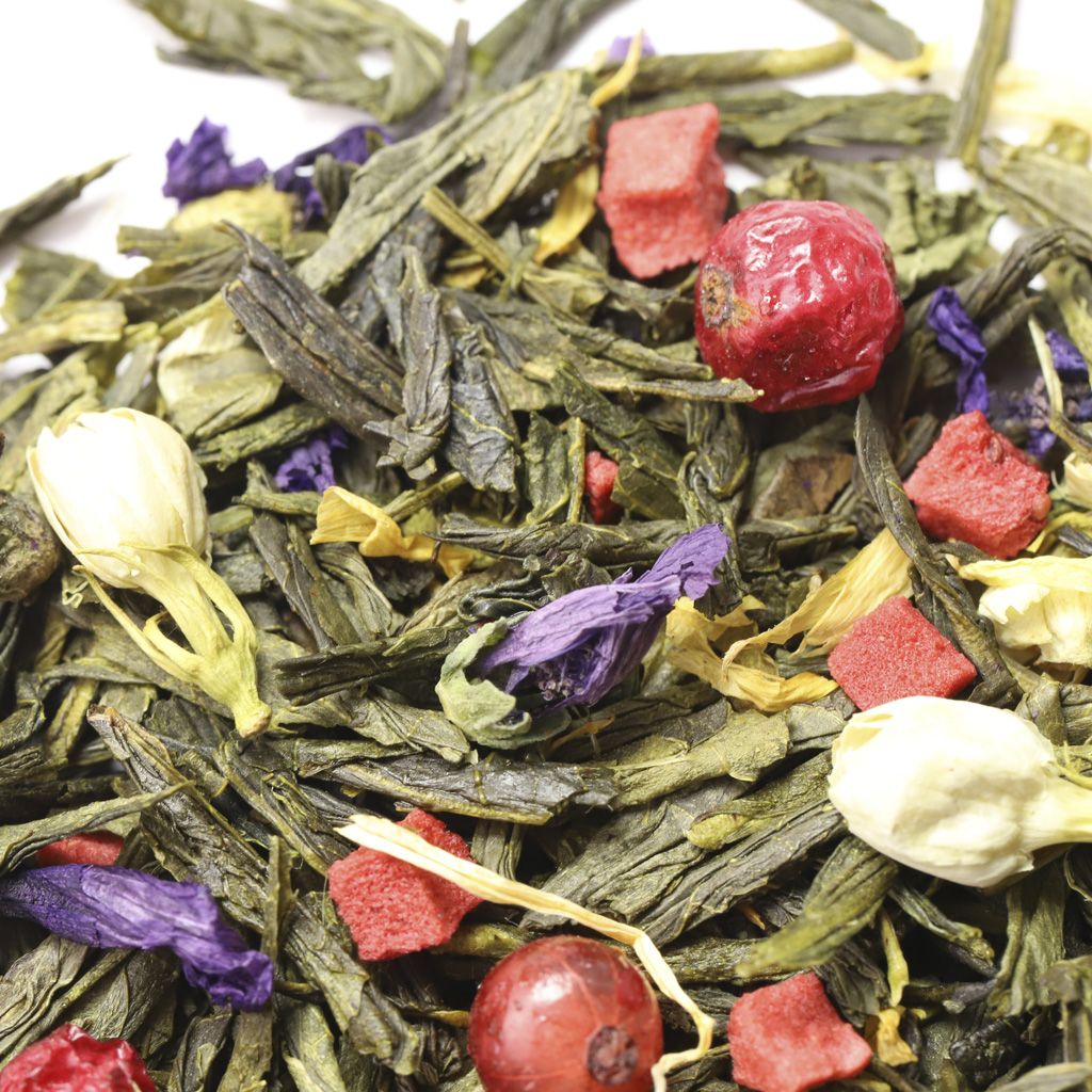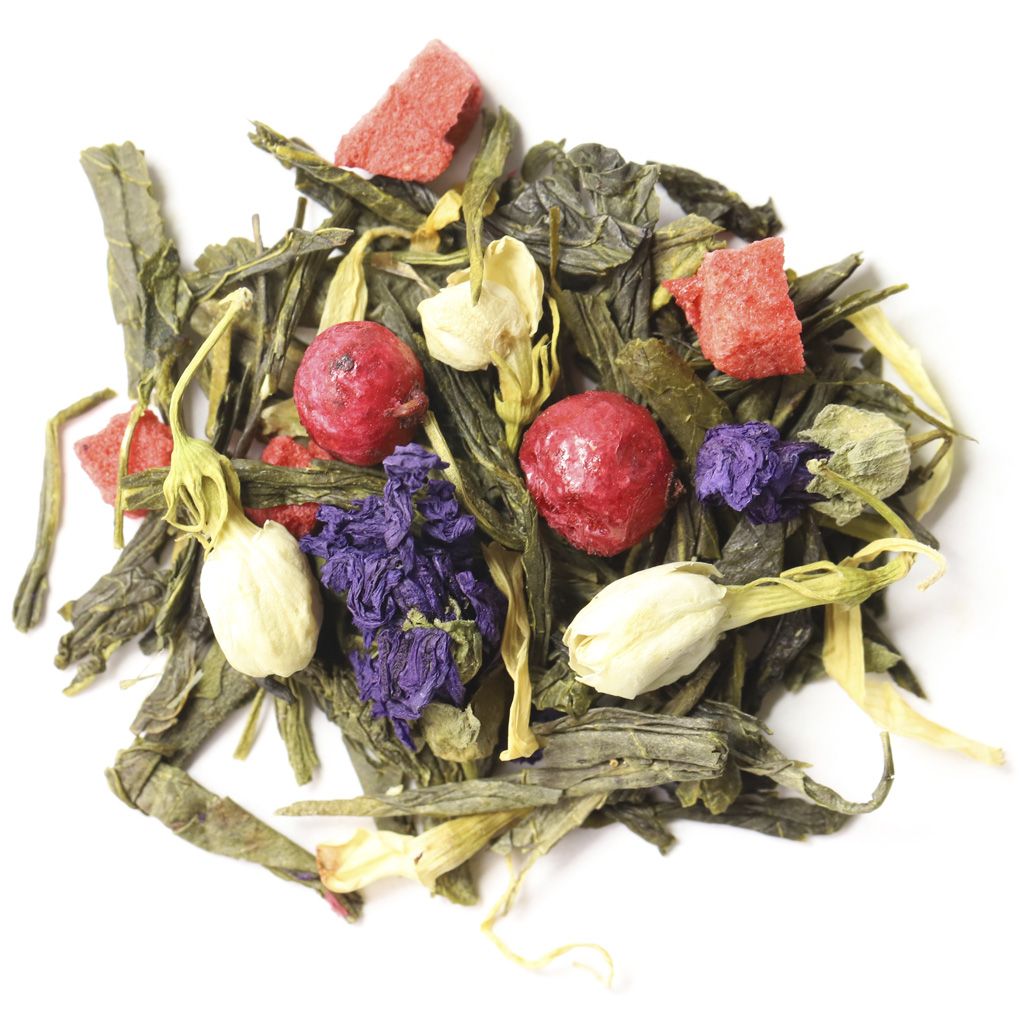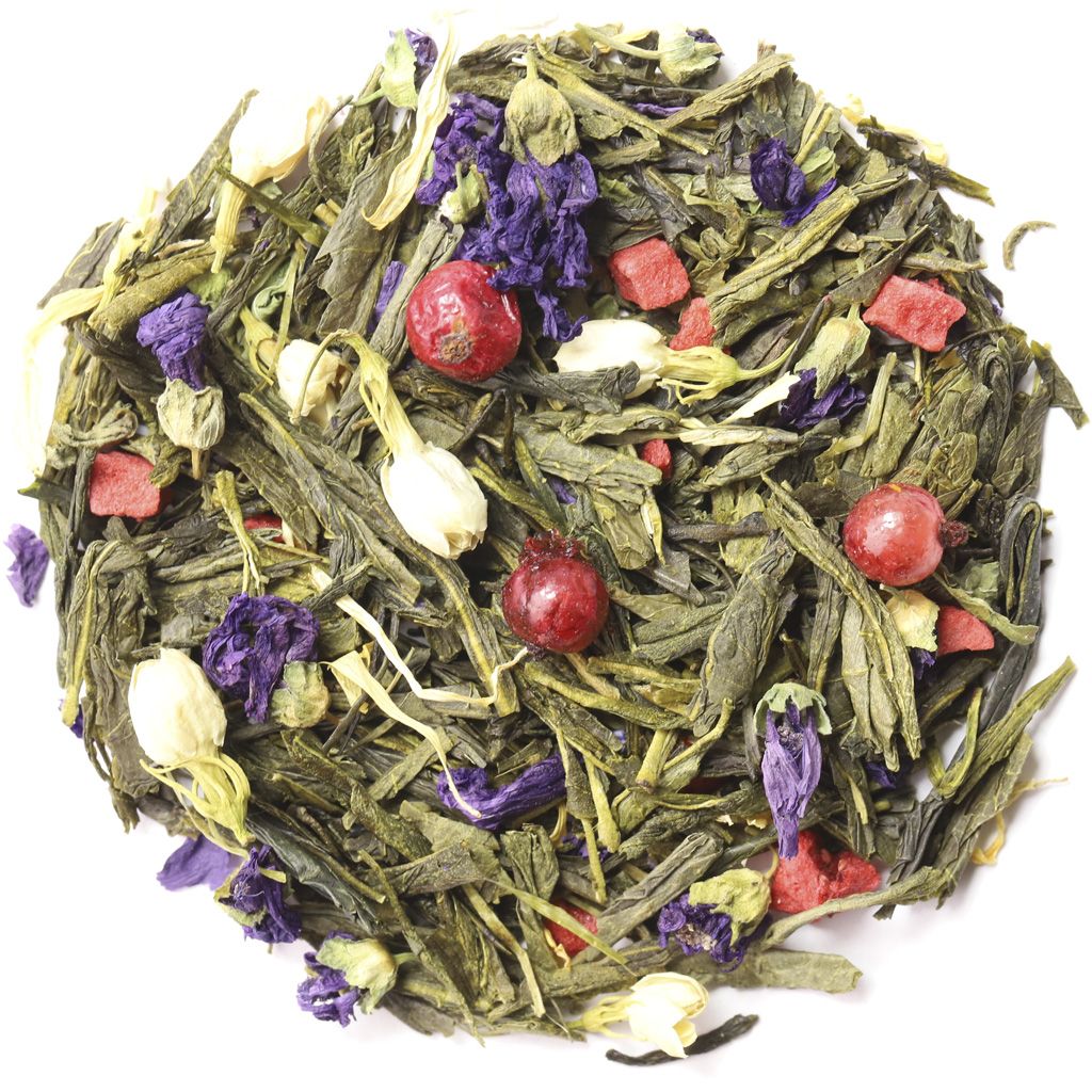 Чай зеленый китайский сенча, кусочки клубники, ягоды красной смородины, бутоны жасмина, цветы мальвы, лепестки календулы, аромат жасмина и клубники