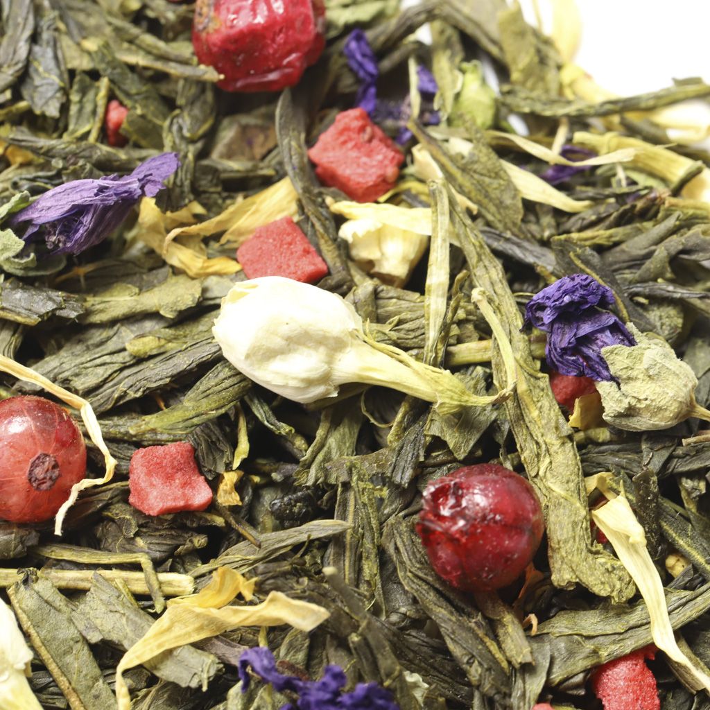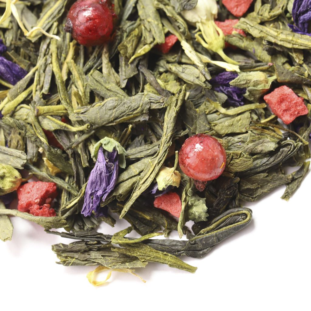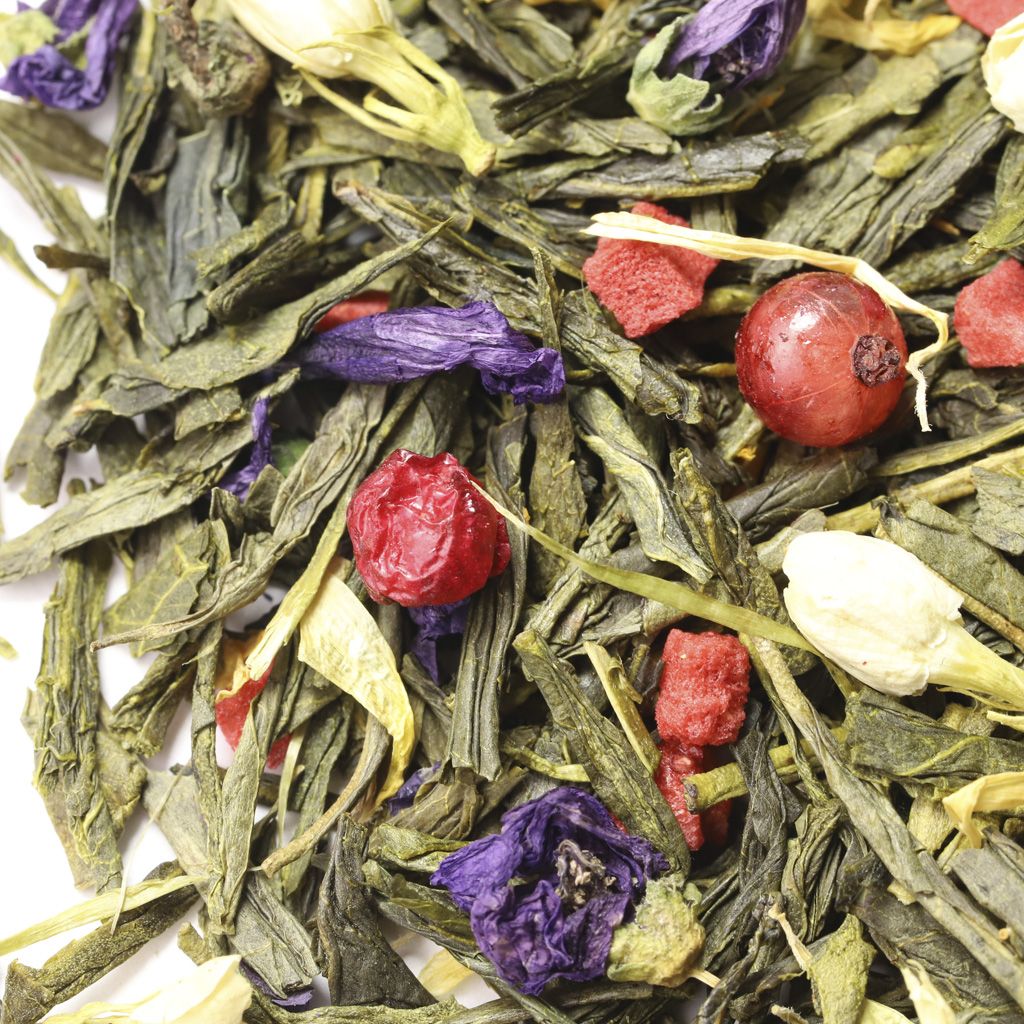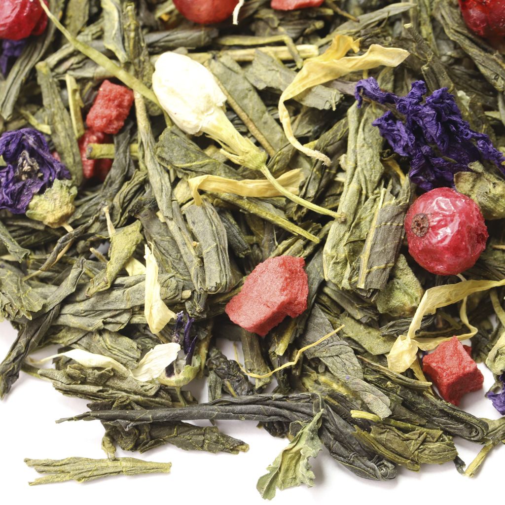 Чай зеленый китайский сенча, кусочки клубники, ягоды красной смородины, бутоны жасмина, цветы мальвы, лепестки календулы, аромат жасмина и клубники