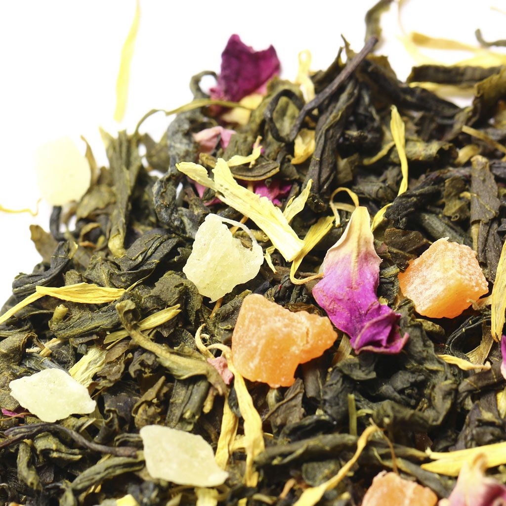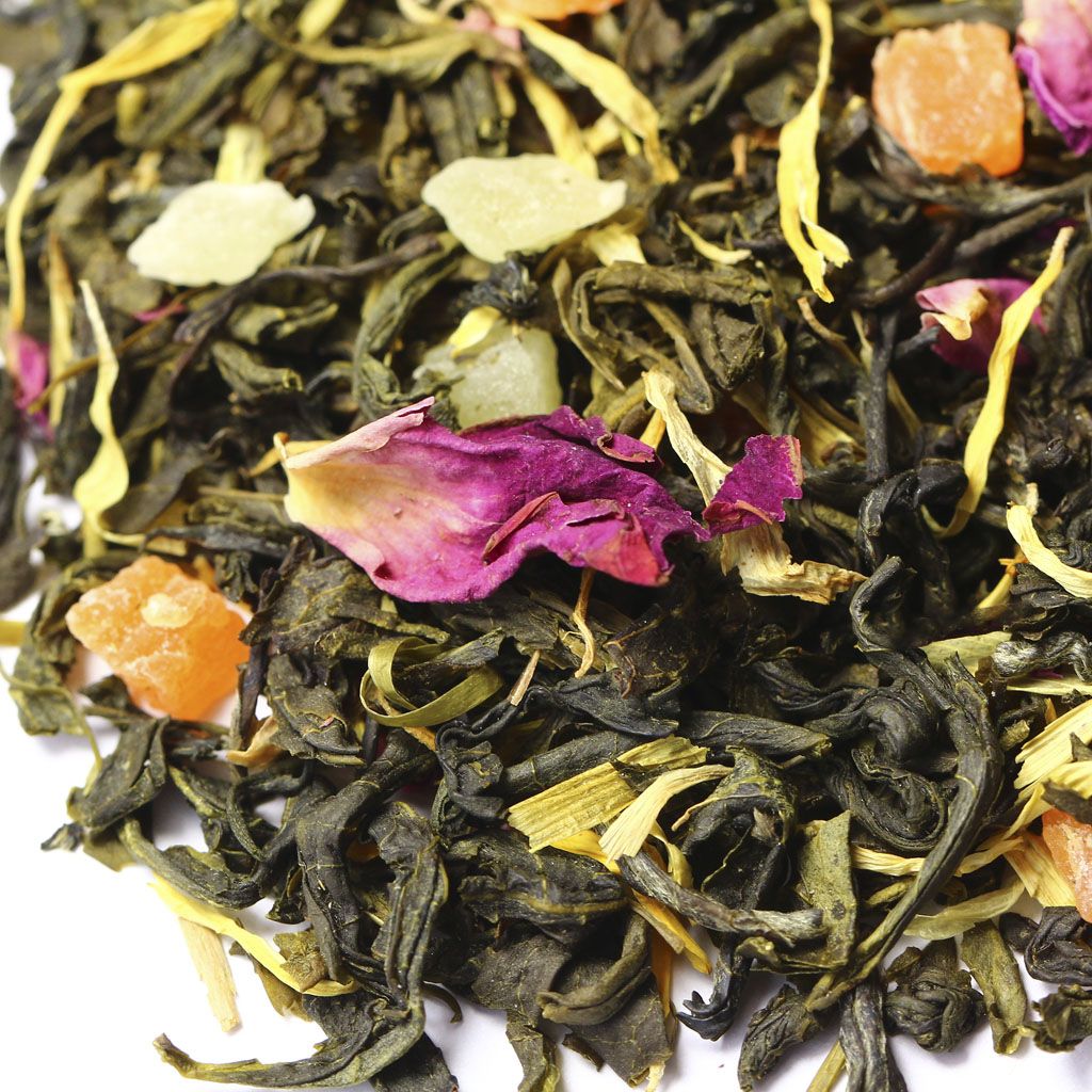 Оригинален и вкус. Мягкая, неодновременно терпкая основа из зеленого чая сорта Сенча, восполнена приятной ароматной сладостью тропических фруктов. Лепестки цветков на втором плане добавляют изысканности.