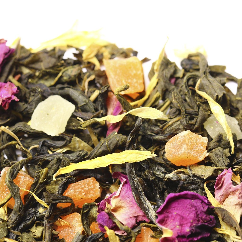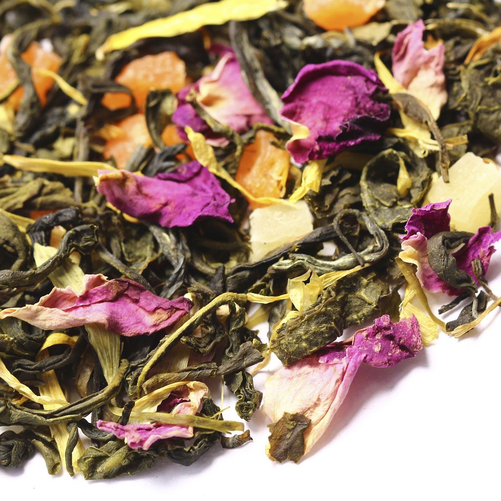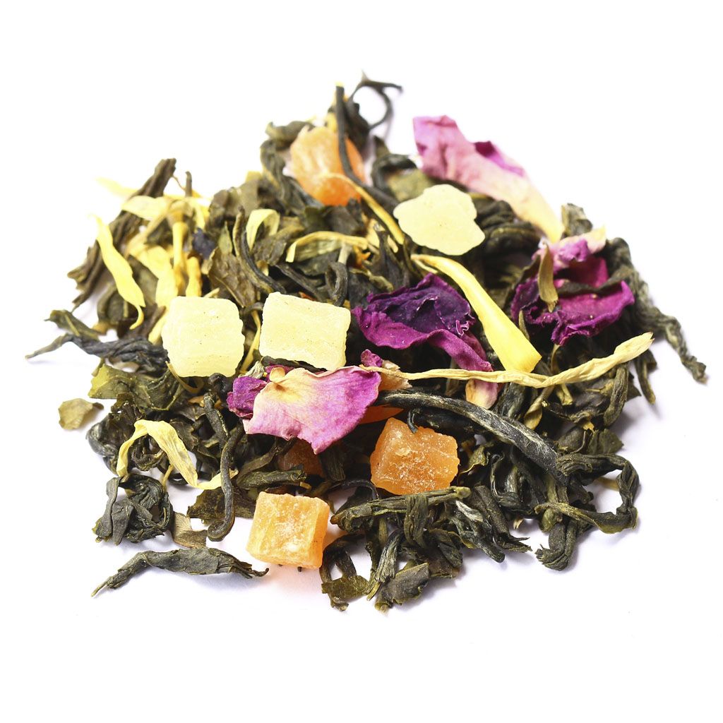Ставшее уже традиционным сочетание китайского зеленого чая и кусочков ананаса, дополнено россыпью лепестков красной розы и календулы, обрамленное звонким ароматом манго.