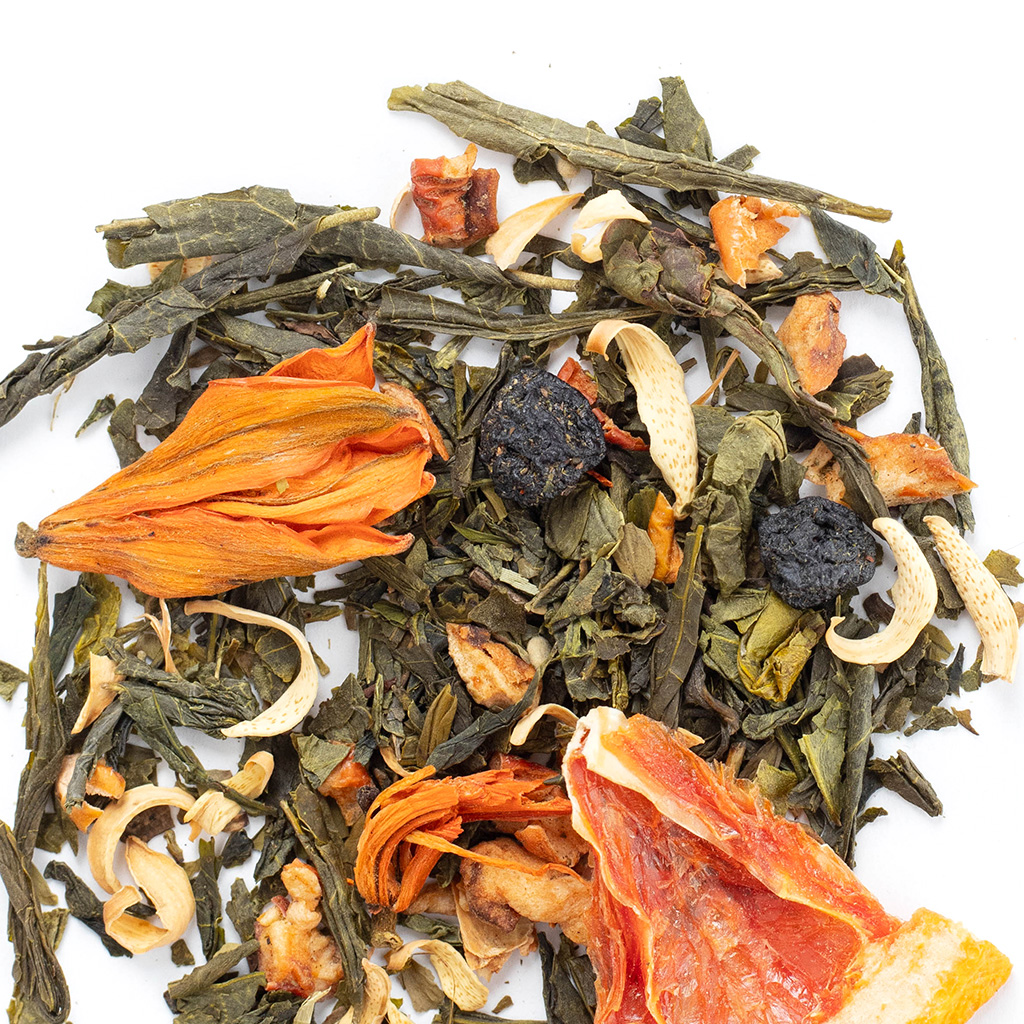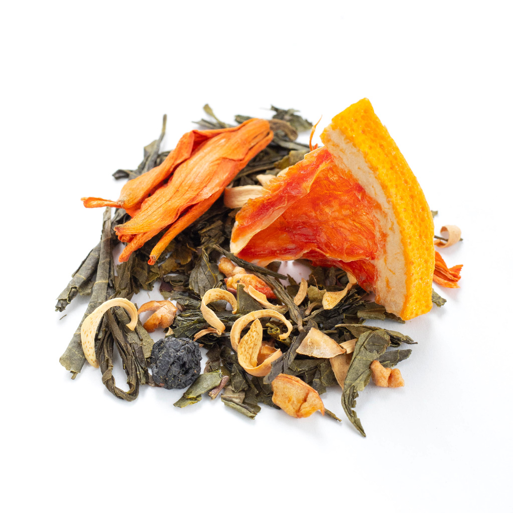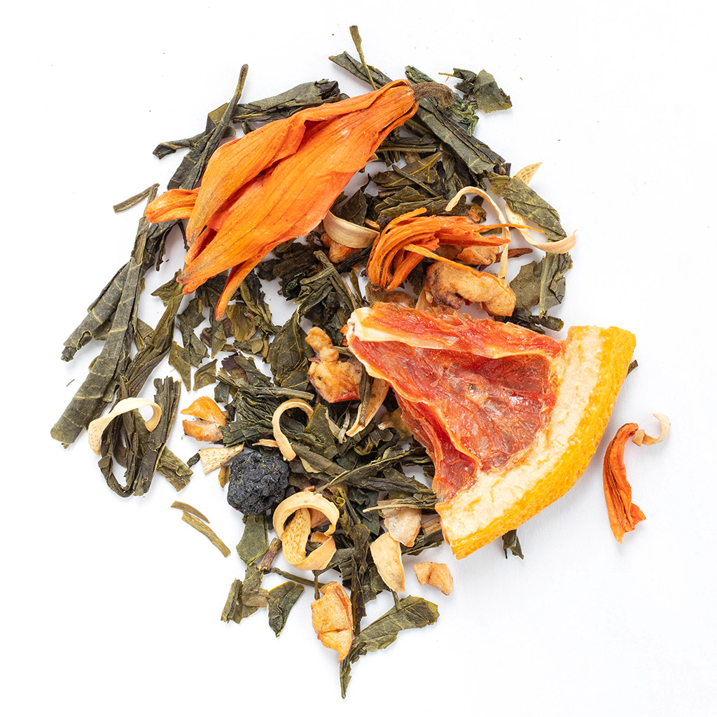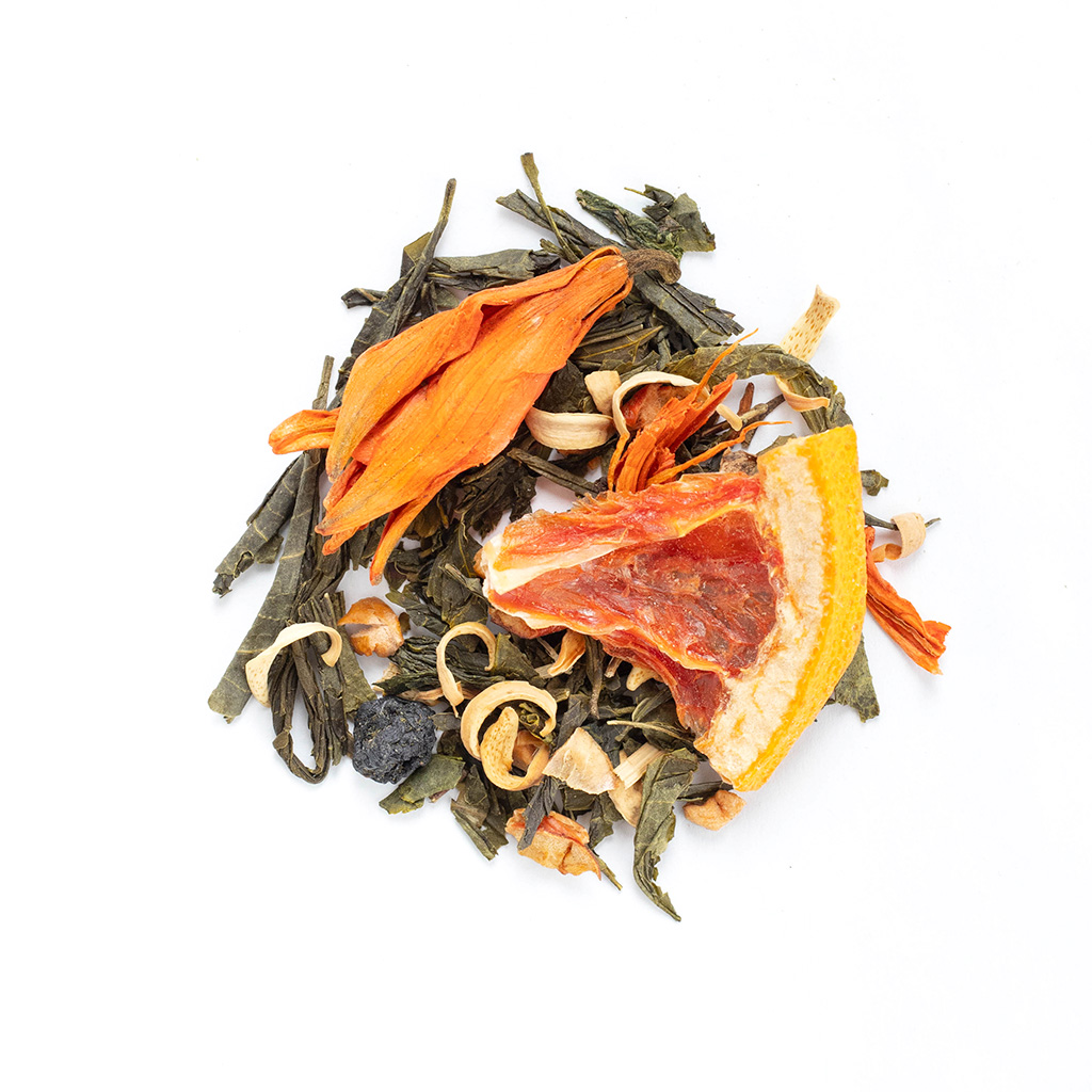Состав: чай зеленый китайский, яблоко кусочки, грейпфрут сегмент, голубика ягода, апельсин цветки, лилия цветки цельные, аромат Солнечных цитрусов
