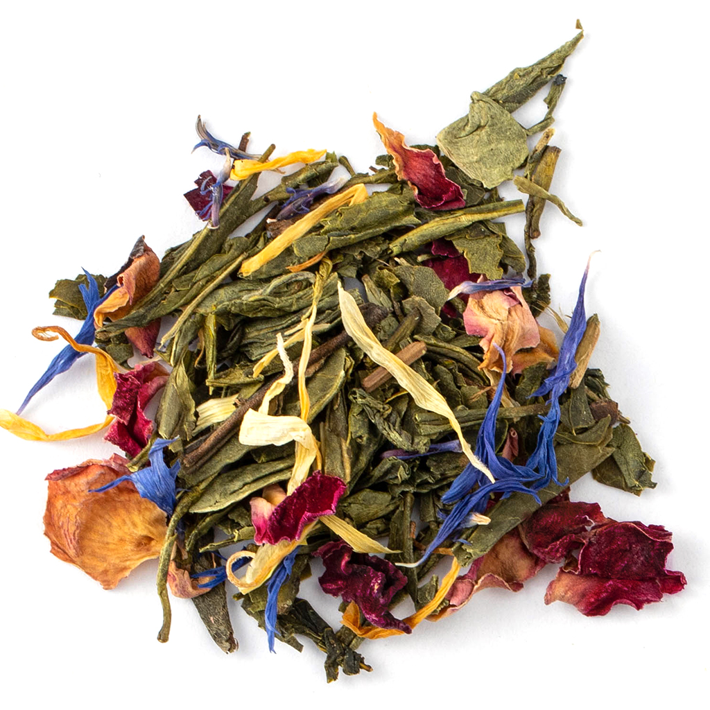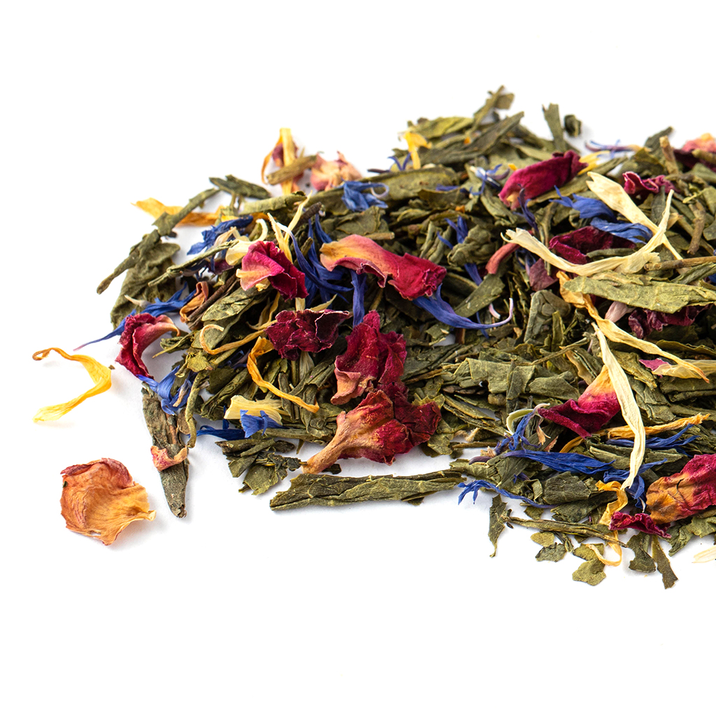 Состав: сенча, лепестки красной розы, синий василек, лепестки календулы, аромат манго и лайма