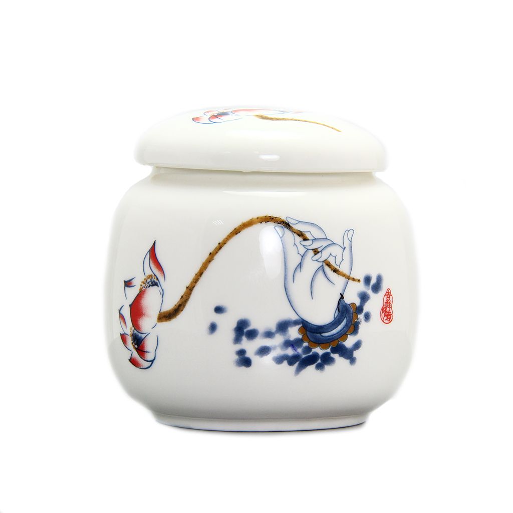 Сосуд для хранения чая объемом 220 мл, округлой формы, с уплотненной крышкой. Декорирован изображением лотоса в руке Будды.